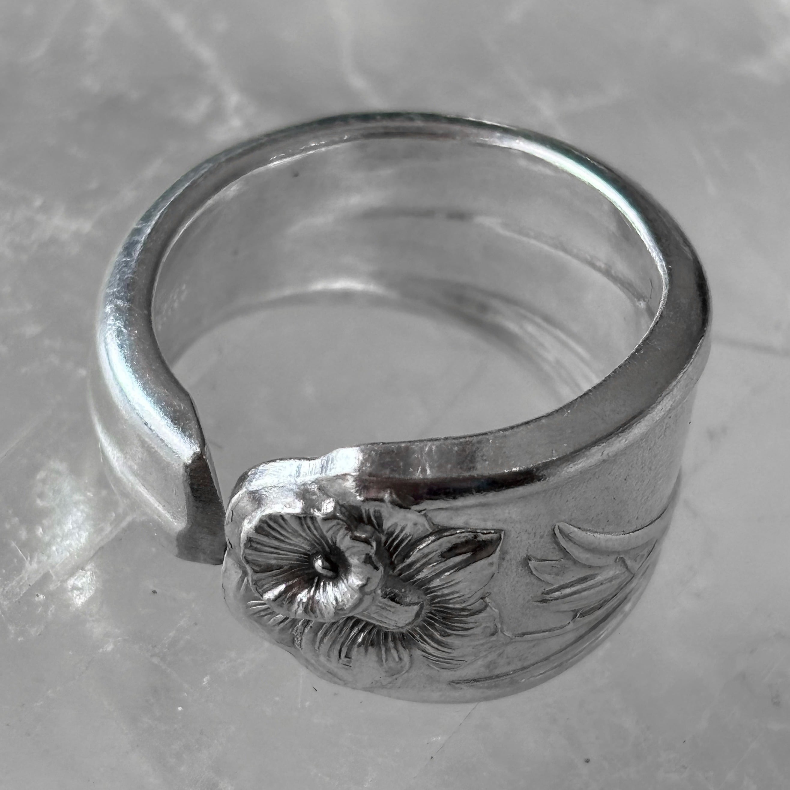 こちらは水仙を一輪、立体的に浮き彫りにしたもので、スプーンリングならではの大胆で印象的なデザインが存分にお楽しみいただけます。