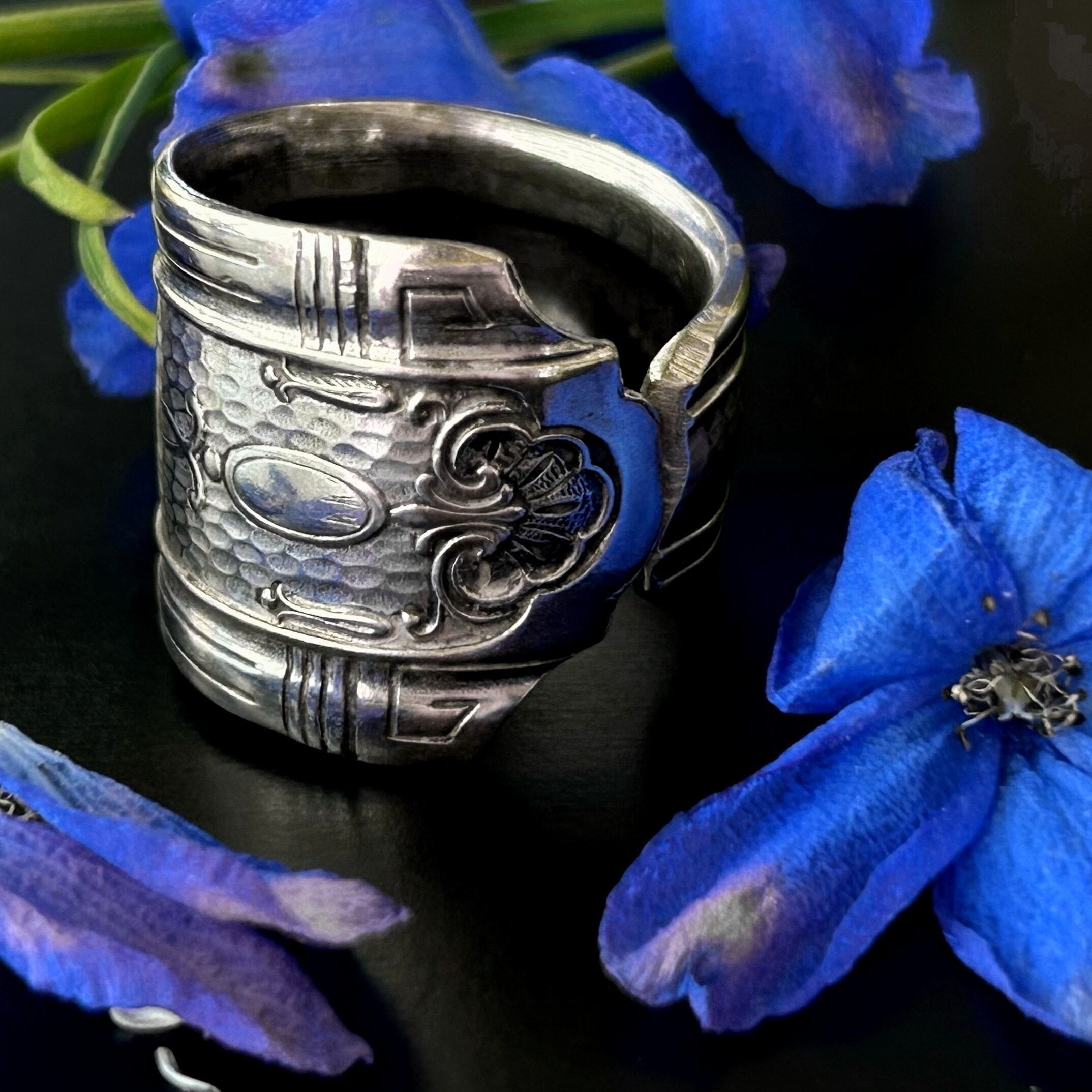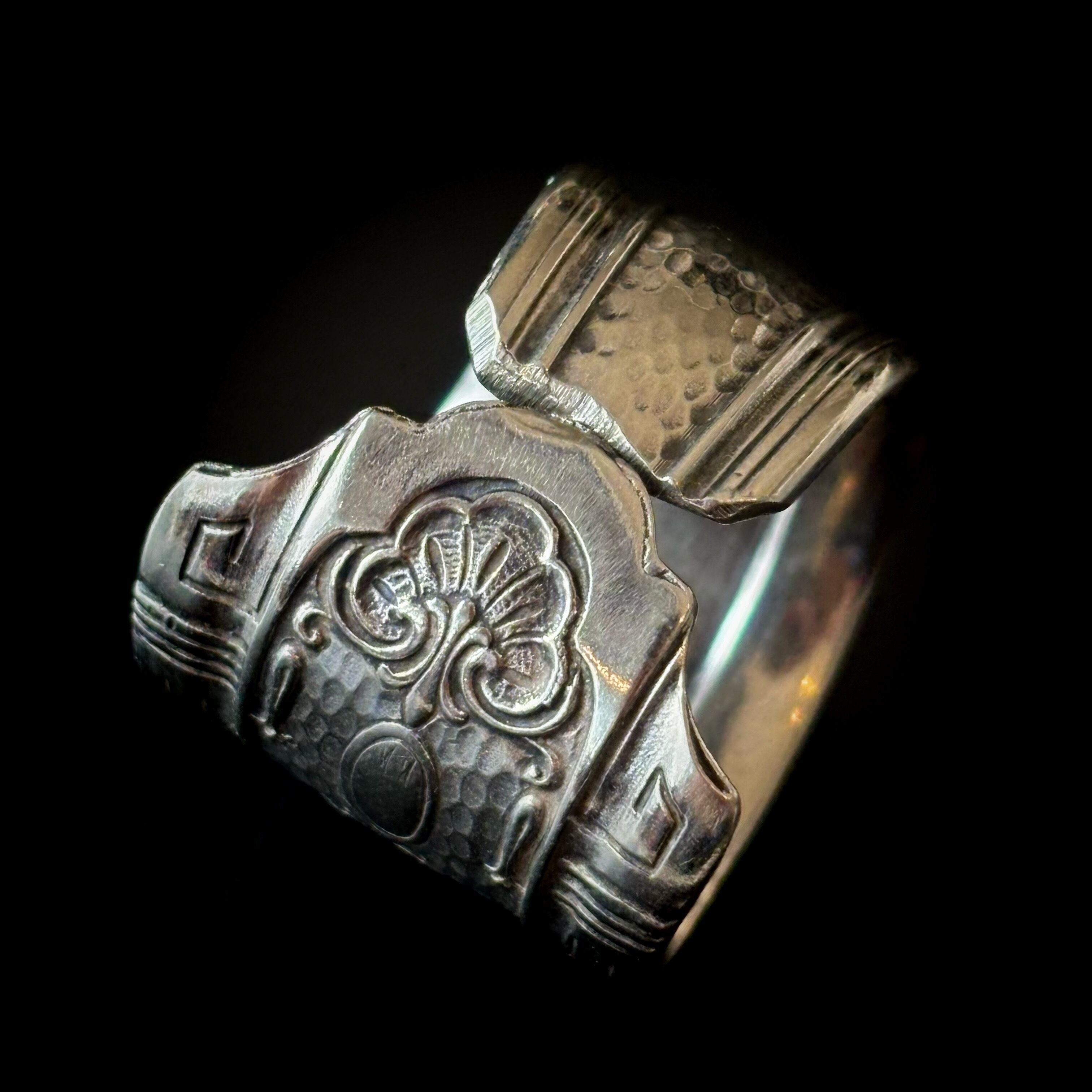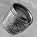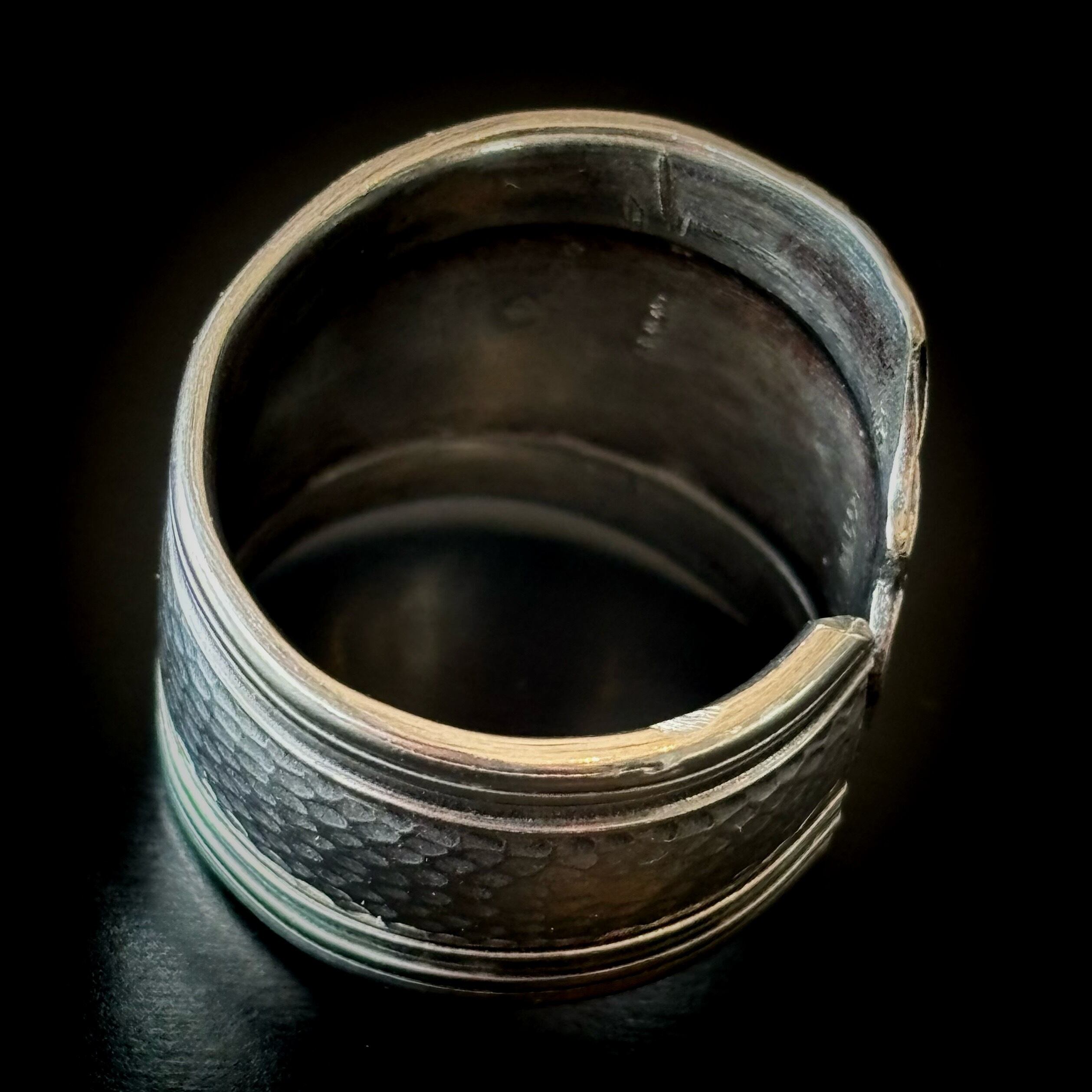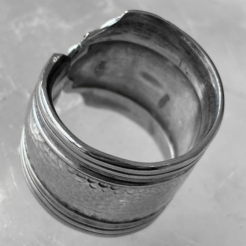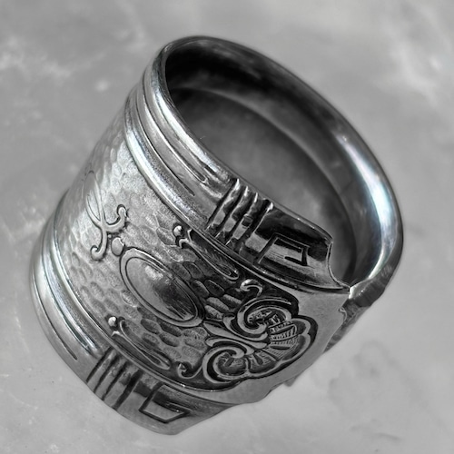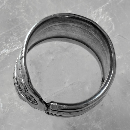 古いスプーンで作った指輪です。本物のスプーンの柄の部分をカットして丸めたものですので、裏側にも模様があるなどで元々はスプーンだったことがよくわかります。そのようなわけで、普通の指輪には見られない大胆なデザインが色々とお楽しみいただけます。