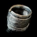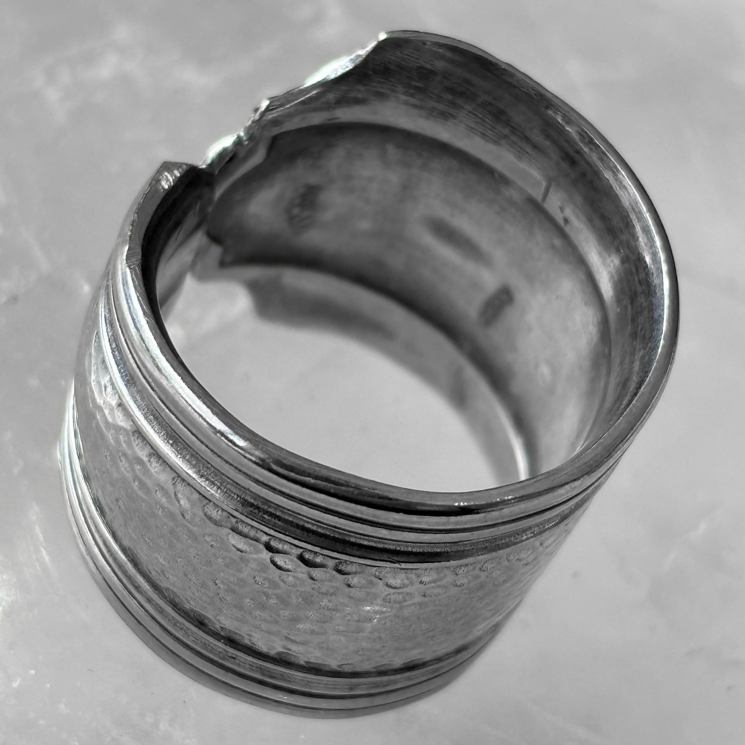 こちらは端に大胆な植物モチーフを置き、全体をハンマーで叩いたような細やかな打ち出し模様で包みました。スプーンリングならではのユニークなデザインが存分にお楽しみいただけるお品です。