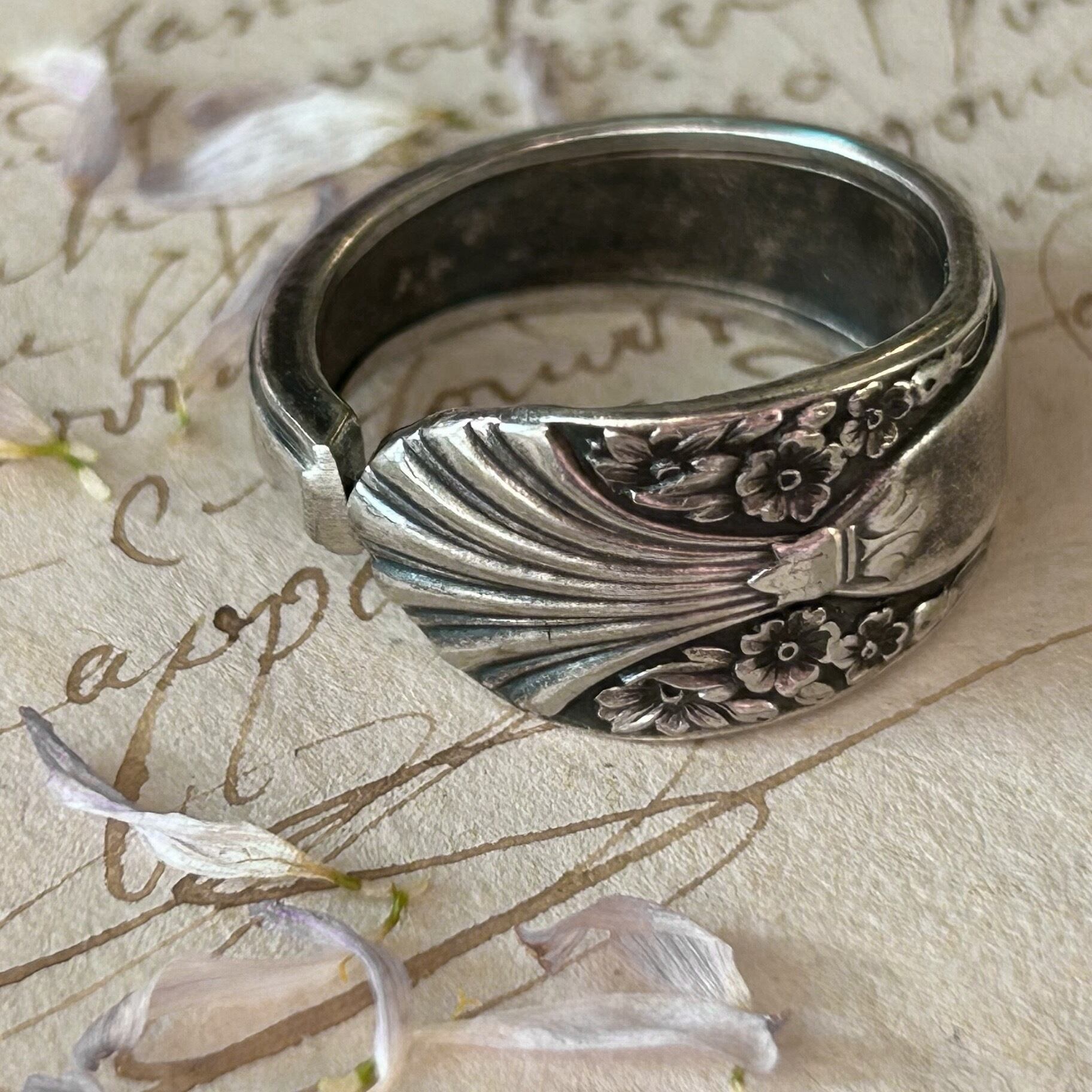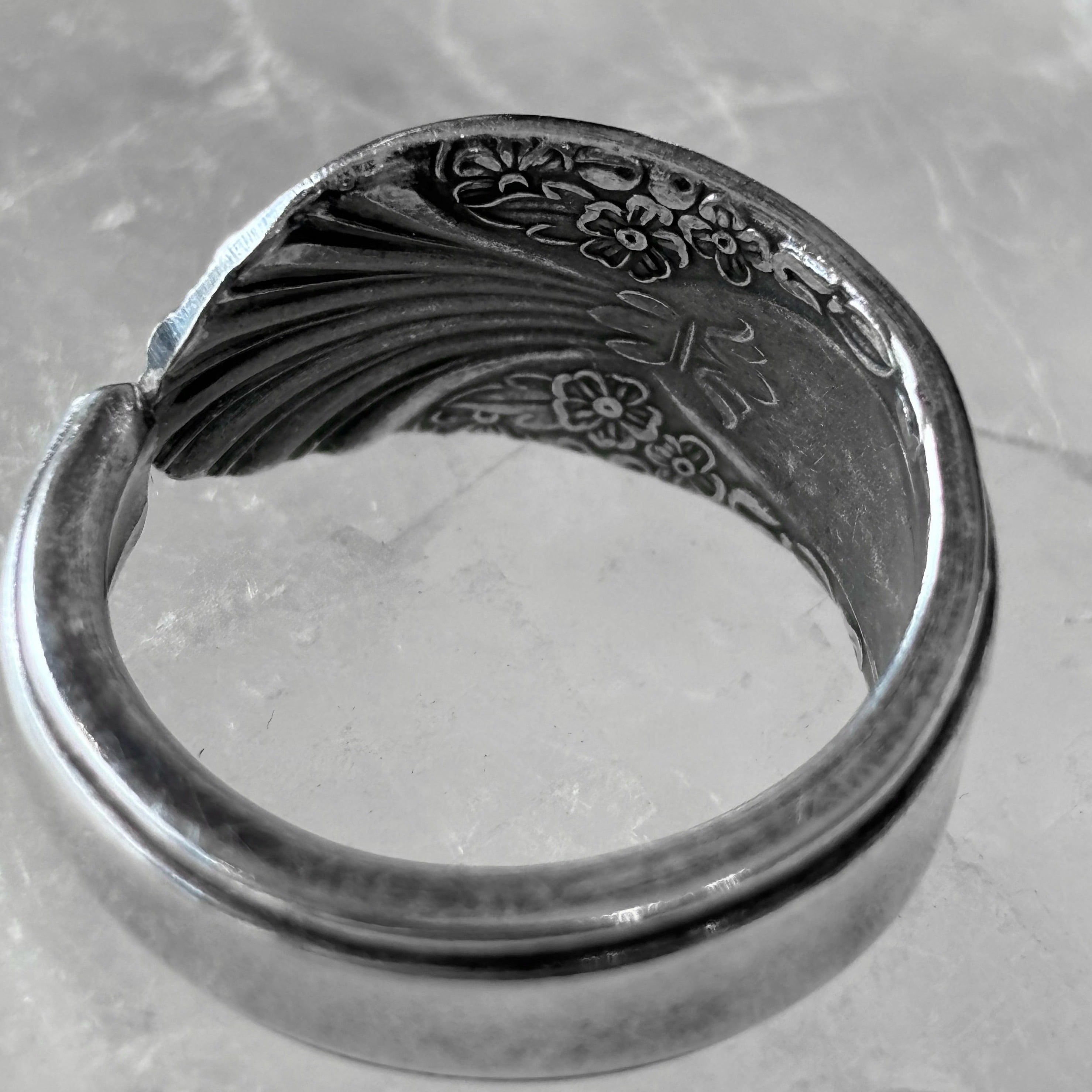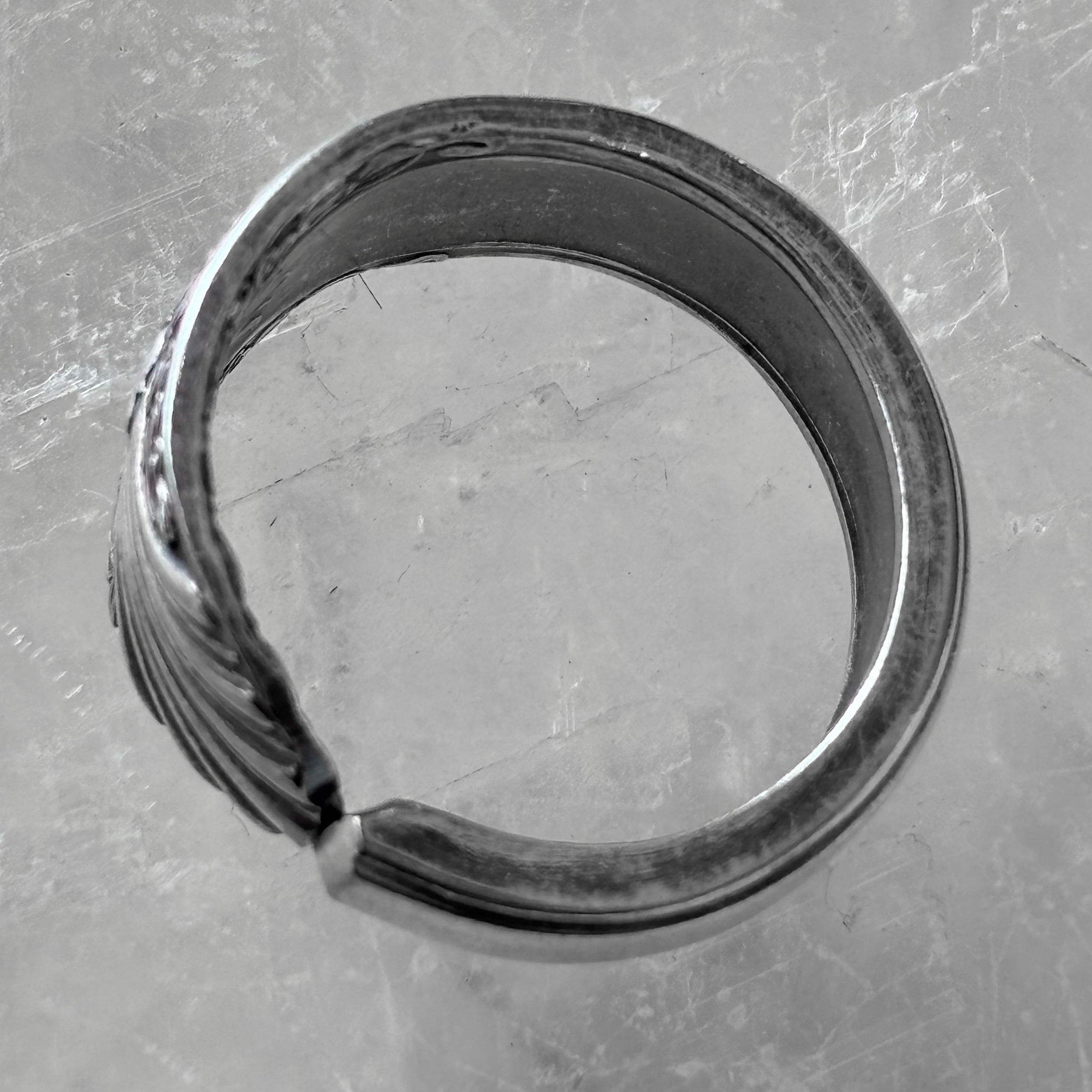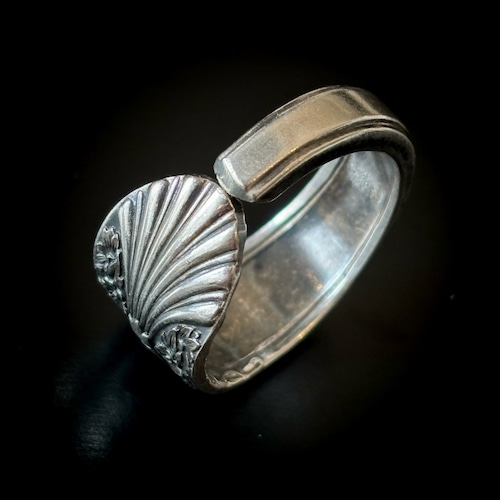 古いスプーンで作った指輪です。本物のスプーンの柄の部分をカットして丸めたものですので、裏側にも模様があるなどで元々はスプーンだったことがよくわかります。そのようなわけで、普通の指輪には見られない大胆なデザインが色々とお楽しみいただけます。