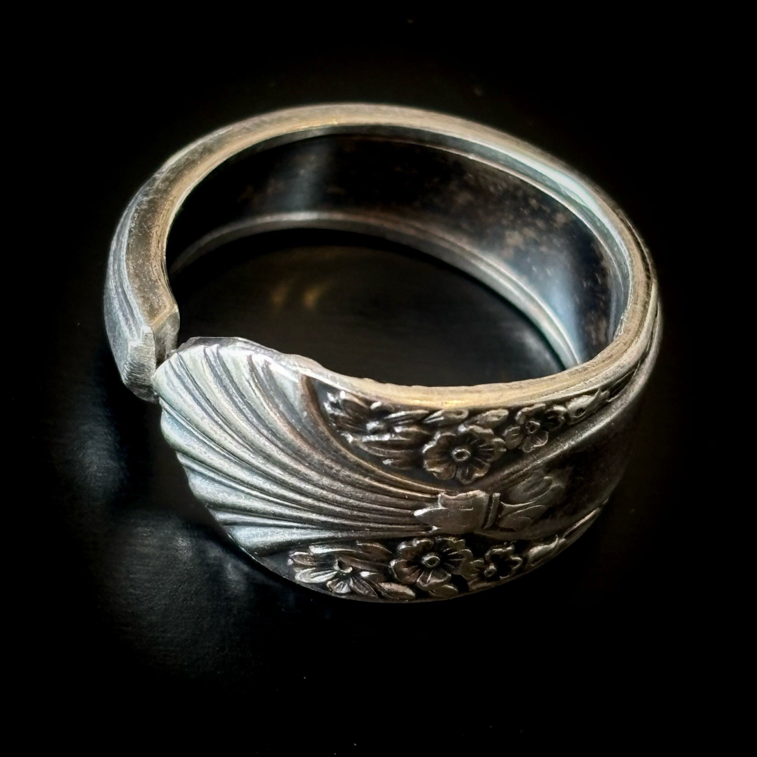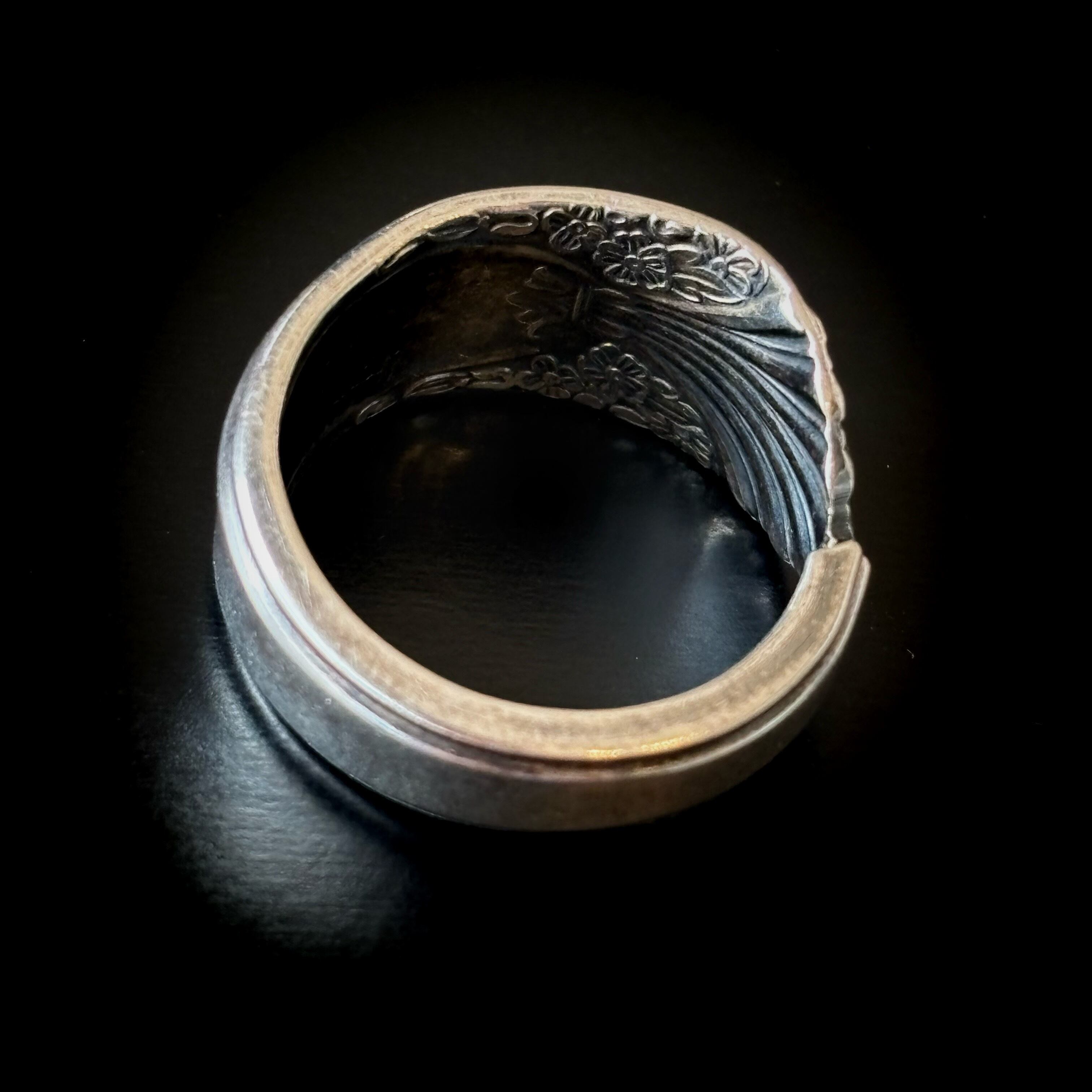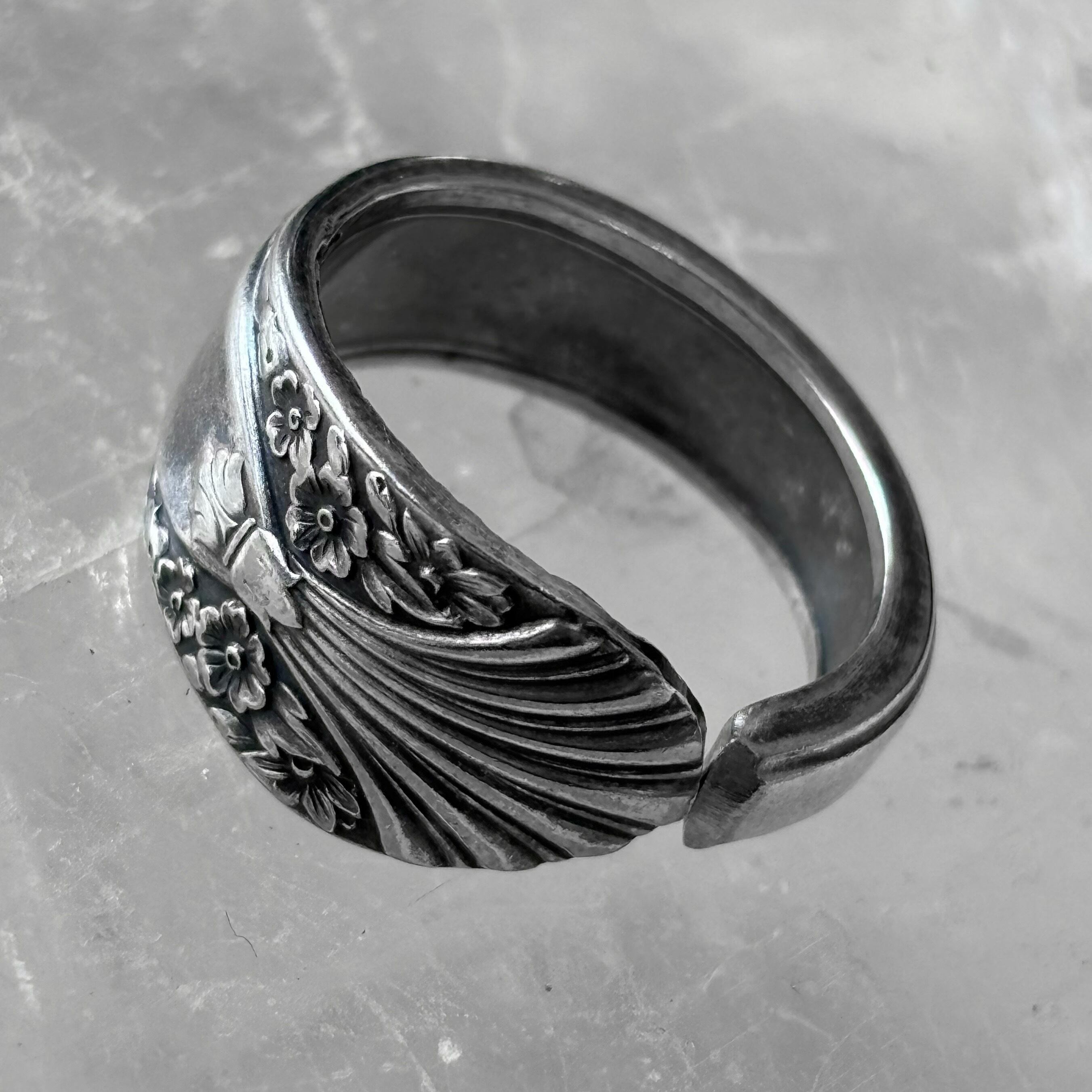 古いスプーンで作った指輪です。本物のスプーンの柄の部分をカットして丸めたものですので、裏側にも模様があるなどで元々はスプーンだったことがよくわかります。そのようなわけで、普通の指輪には見られない大胆なデザインが色々とお楽しみいただけます。