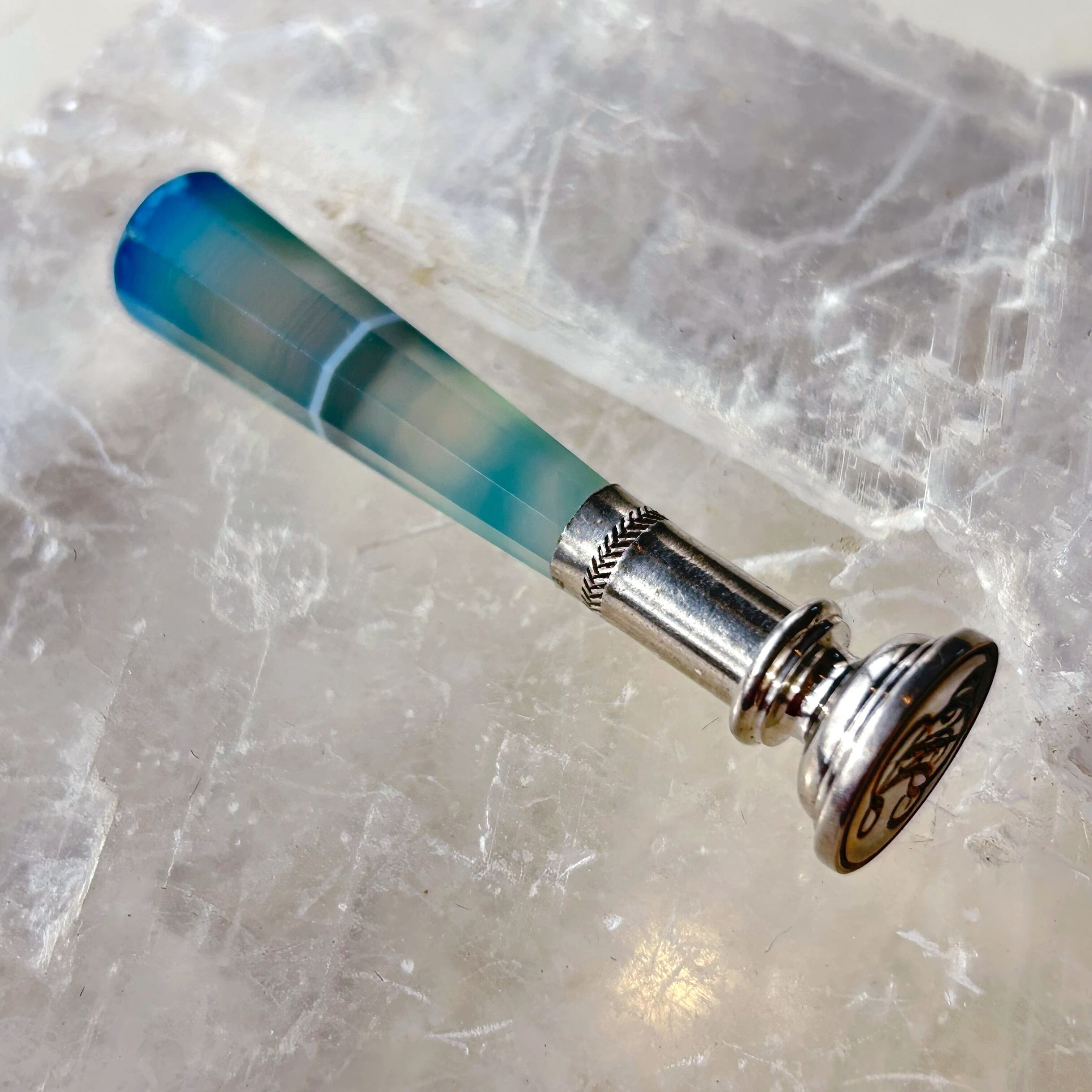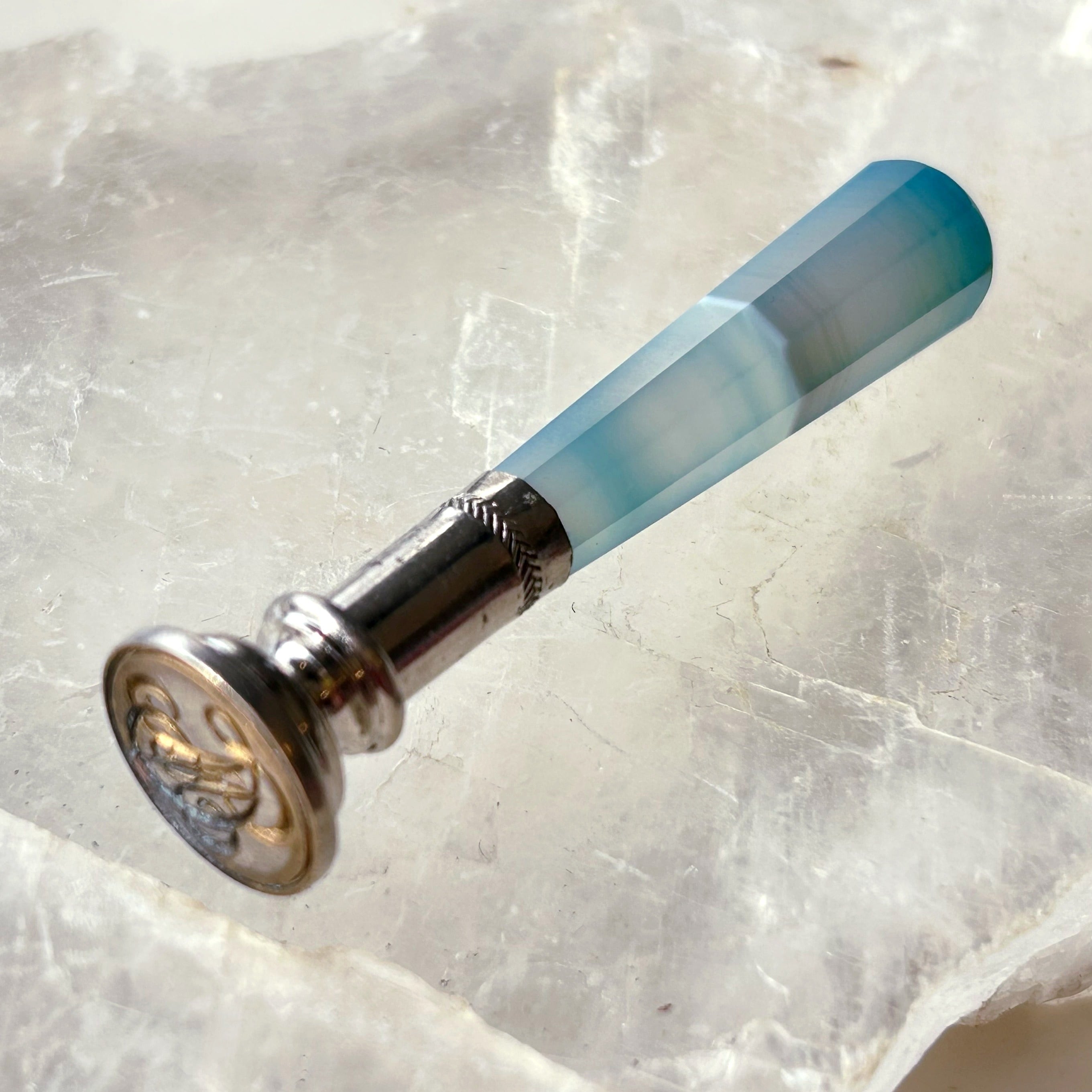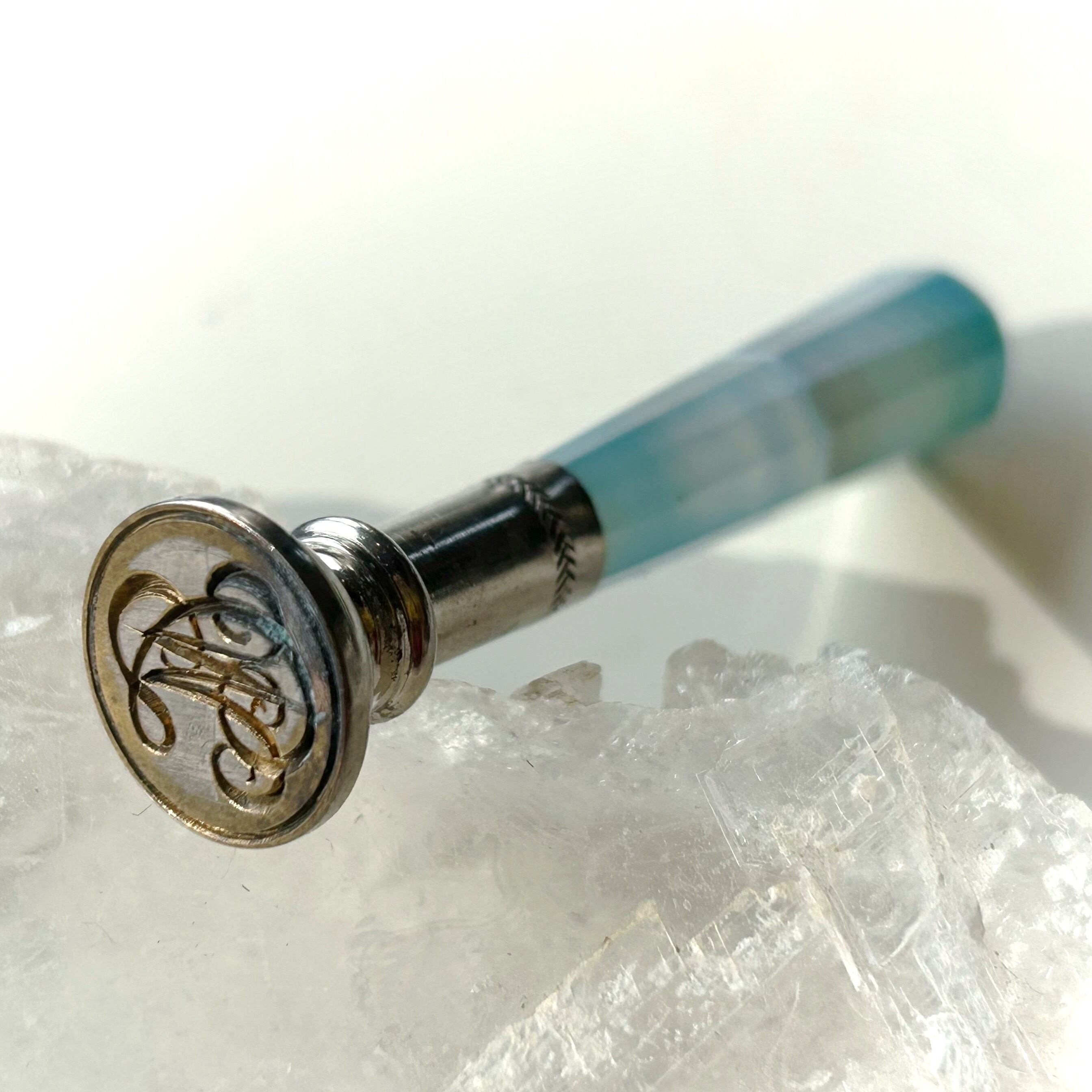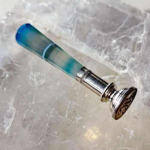 少しミルキーな半透明、持ち手に立ちこめる青緑色のもやが幻想的な印章です。持ち手の素材はイギリス海峡に面したフランス、マンシュ県のメノウで、北海から大西洋へと至る海峡の空や、そこに射す光を封じ込めたような姿です。
