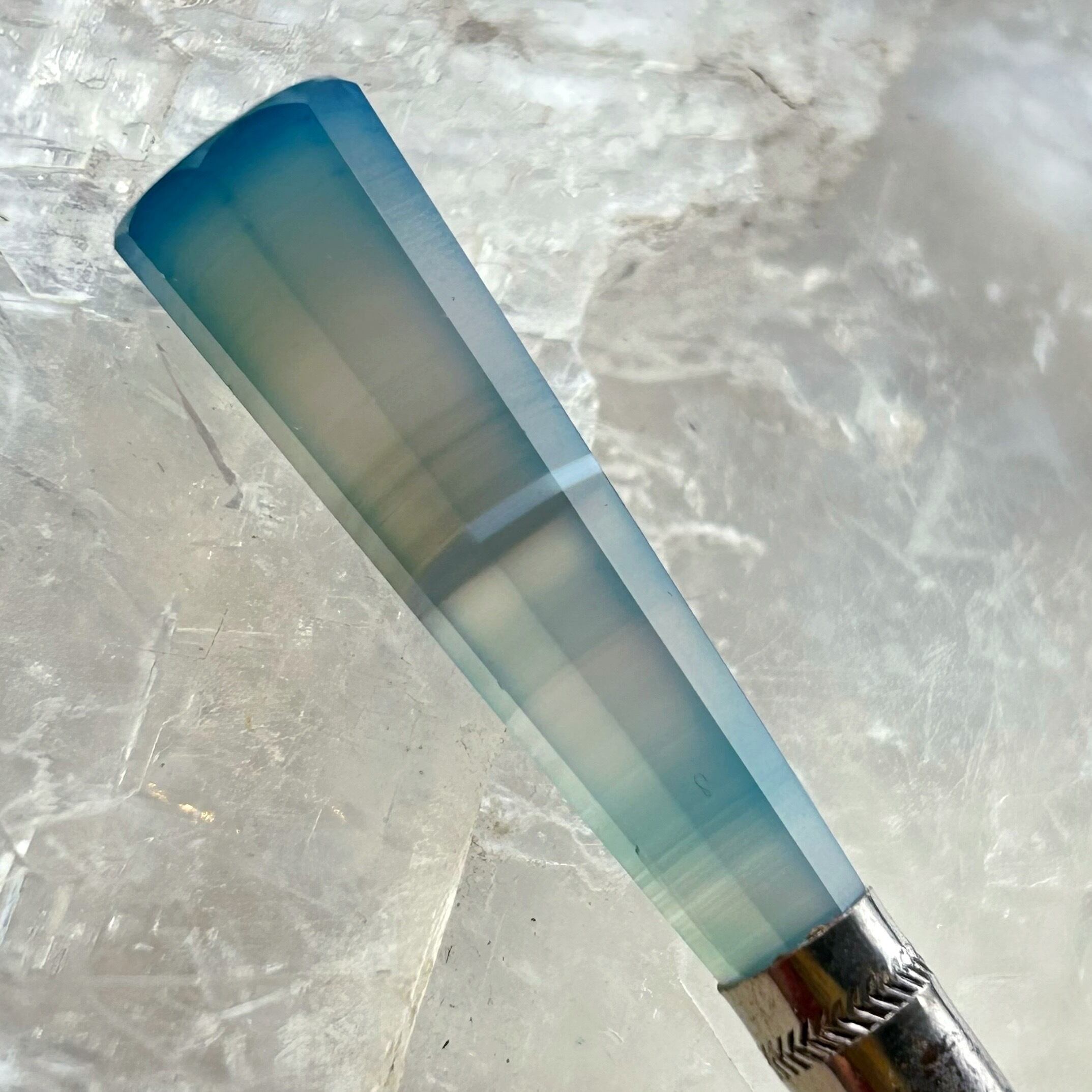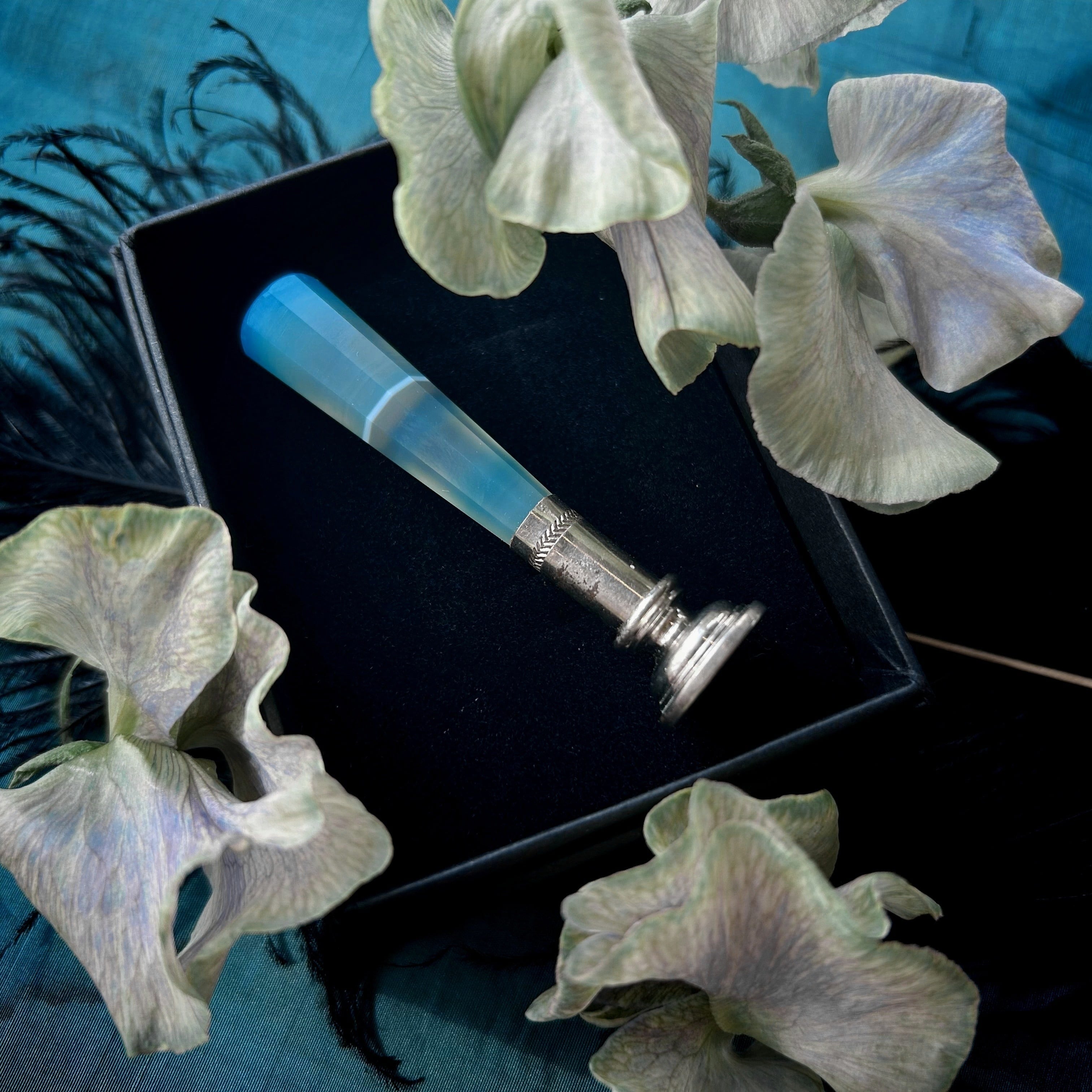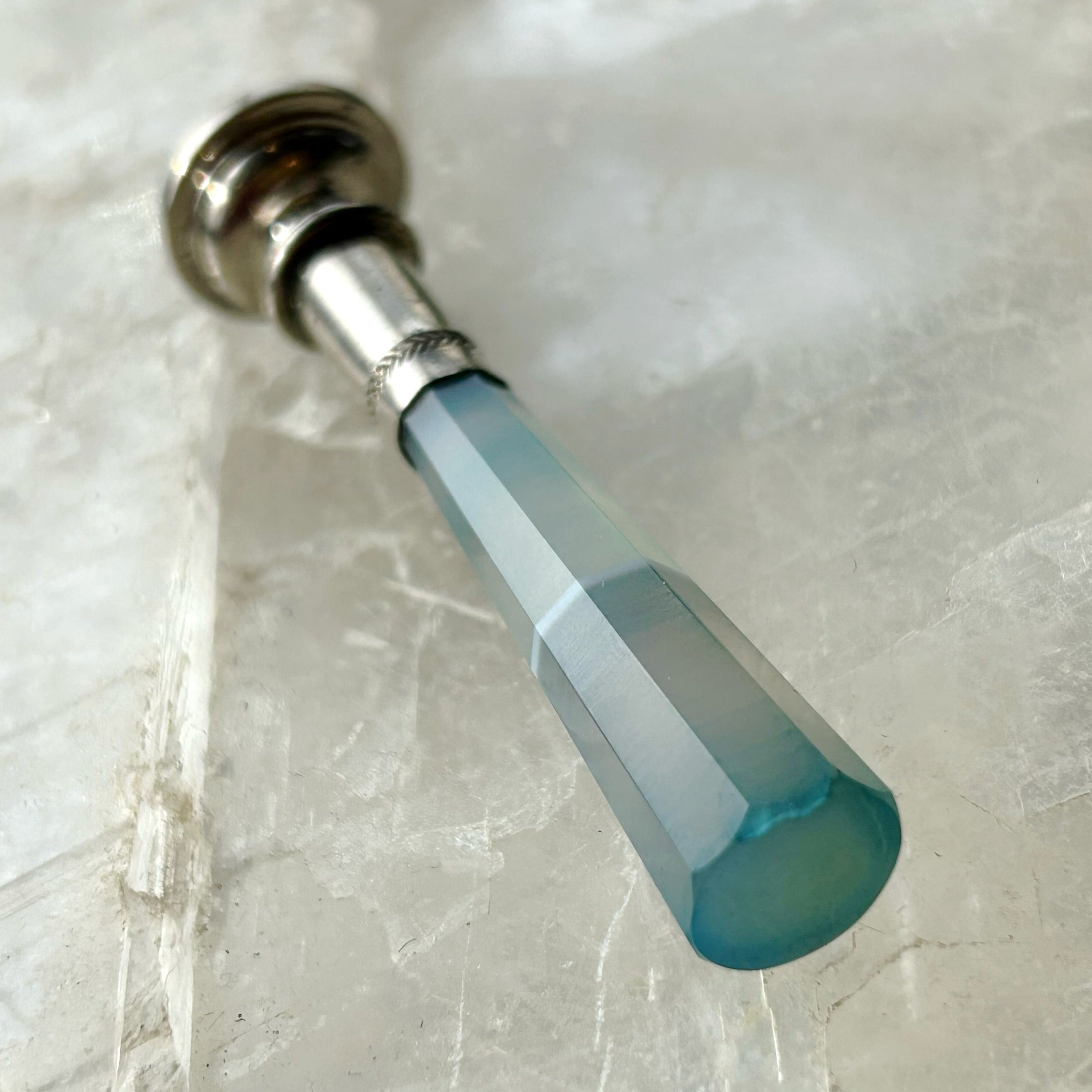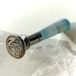 少しミルキーな半透明、持ち手に立ちこめる青緑色のもやが幻想的な印章です。持ち手の素材はイギリス海峡に面したフランス、マンシュ県のメノウで、北海から大西洋へと至る海峡の空や、そこに射す光を封じ込めたような姿です。