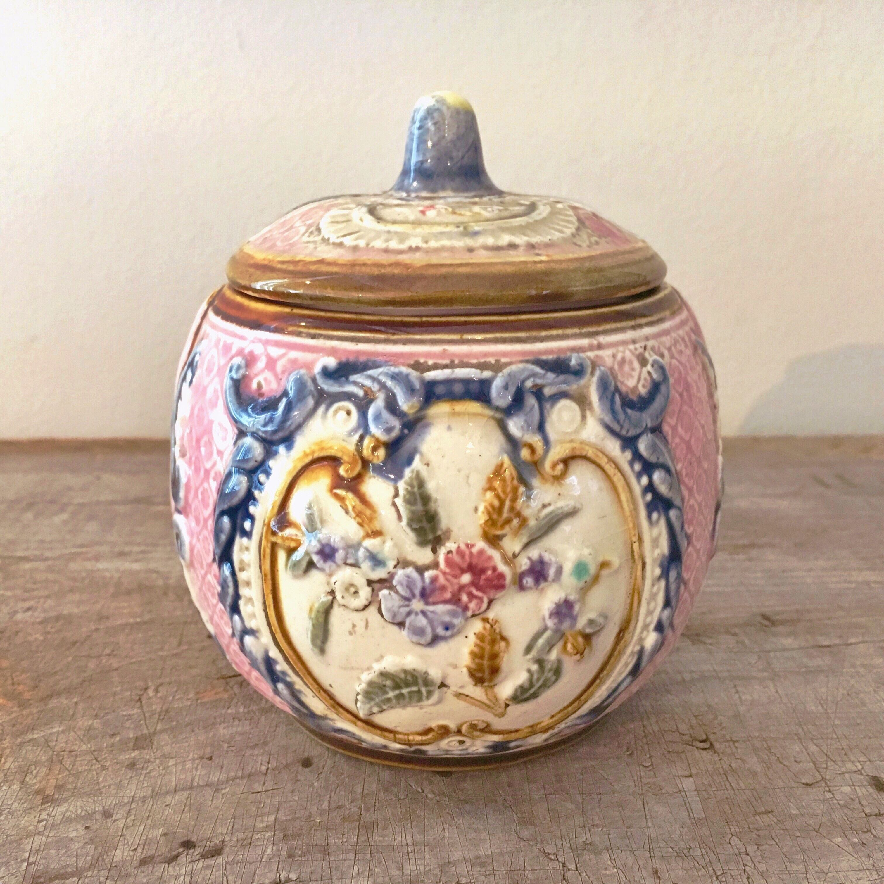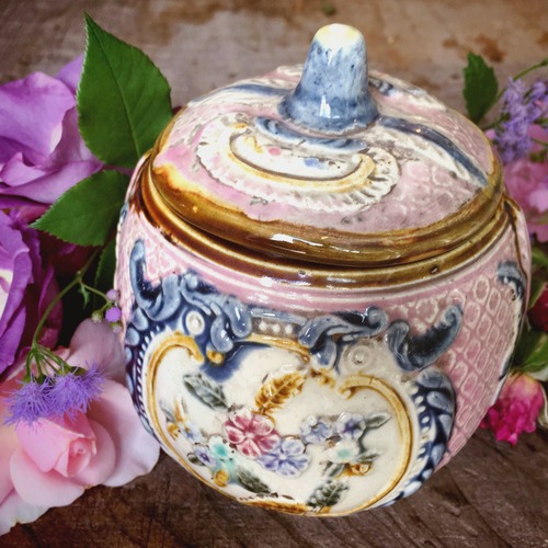 19世紀、フランス製、サイズは開口部の直径が約8センチ、蓋の持ち手を含めた全体の高さが約12センチです。開口部の内側に何箇所か欠けがあります。