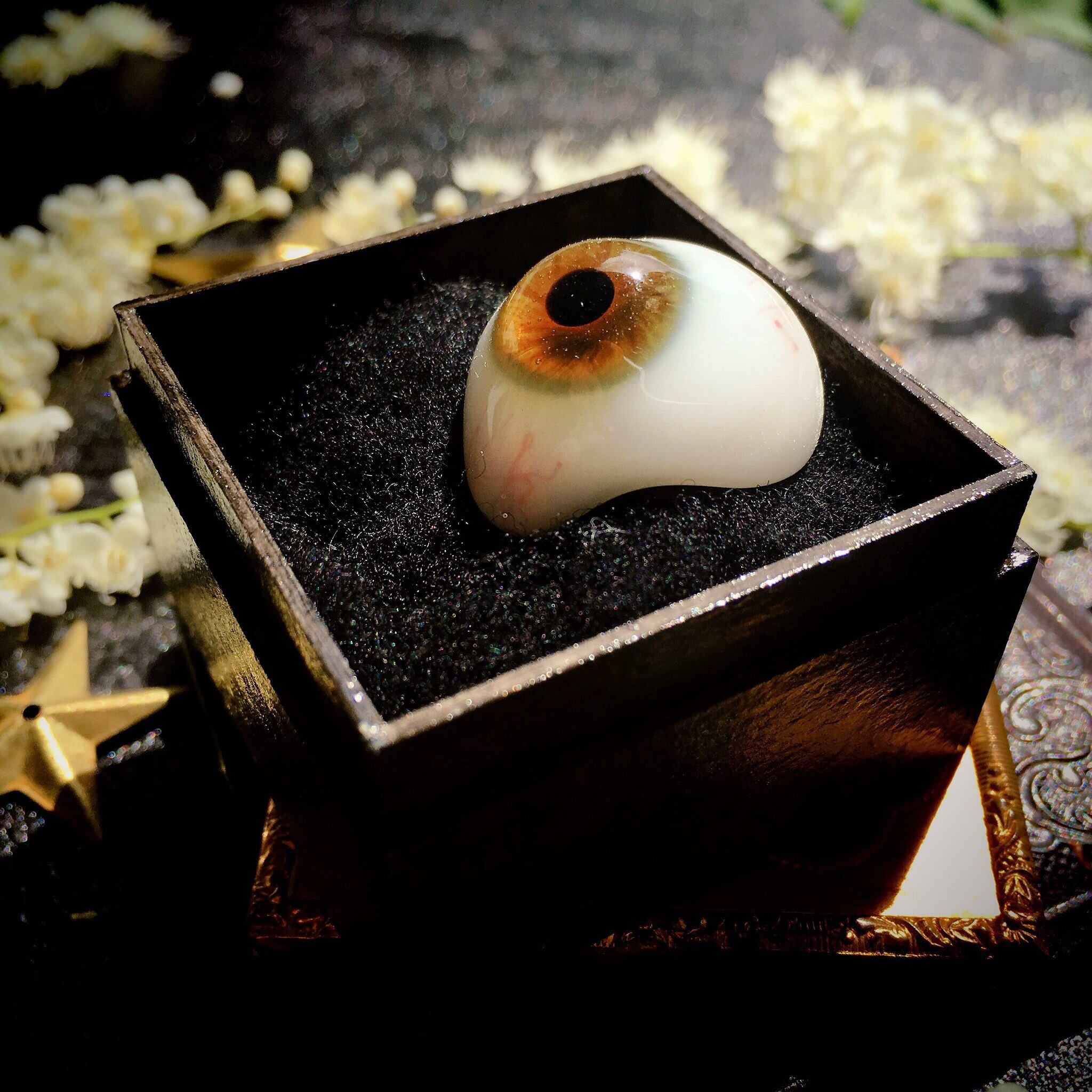 黒目が水に浮いているような、実に深く瑞々しいお品です。金色を背景に茶色の筋が水に揺らめく藻のように拡がり、外に一筋モスグリーンのリングも何とも言えない美しさです。今にも雫になって垂れてしまいそうな、そして深い深い底の世界に続いているような、外側にも内側にも拡がりを感じる義眼です。