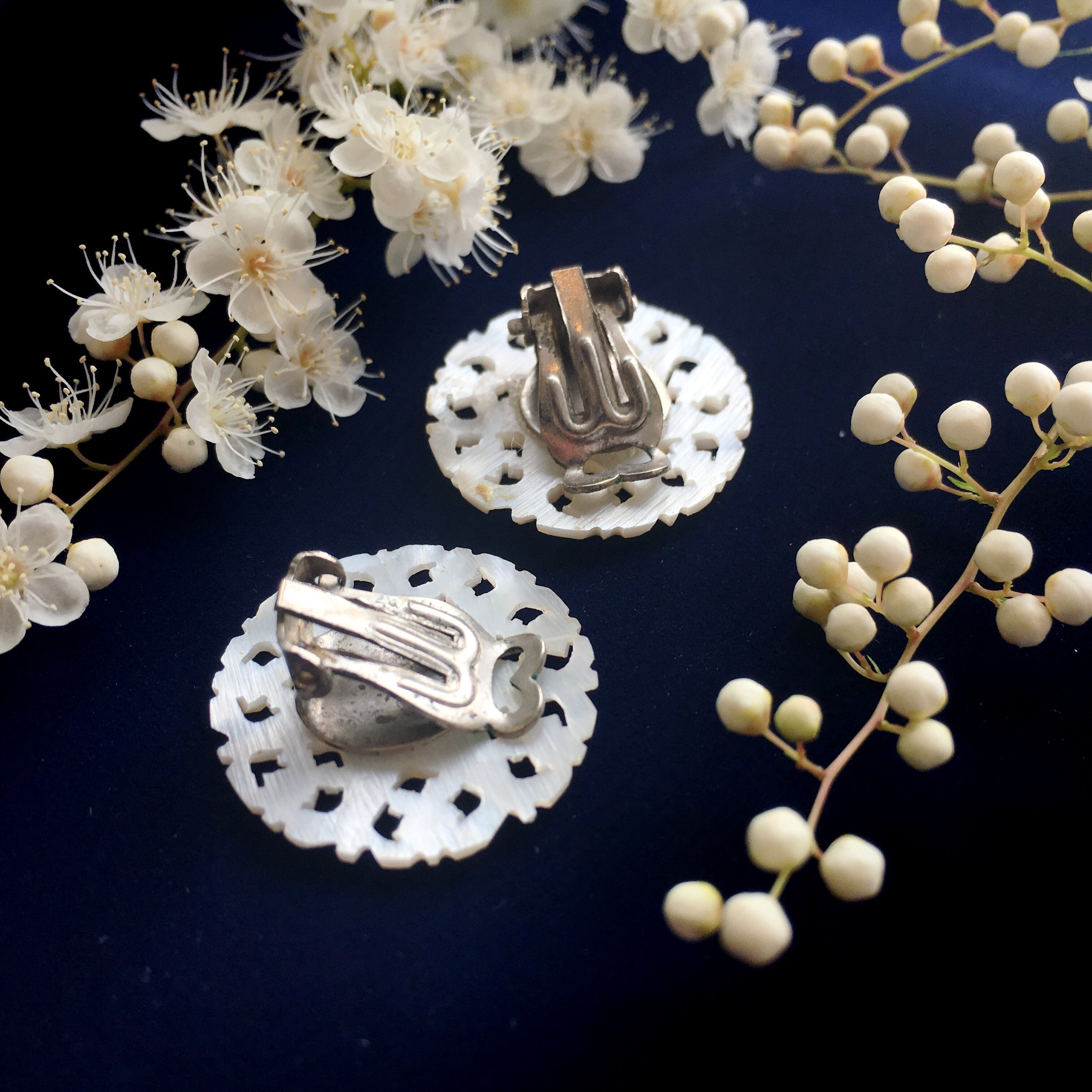 ベツレヘムで真珠貝を手彫りしたイヤリングです。昔からの手彫りを守り、時間をかけて彫ることに祈りの意味もあったようです。当地を巡礼で訪れた方々が、このような装飾品をキリストにまつわる遺跡に触れさせて、記念に持ち帰ることもありました。このお品は製作から60年程度は経ったヴィンテージで、程よい飴色になっております。繊細な彫りと真珠貝独特のつやをお楽しみください。サイズは直径約2.2センチです。