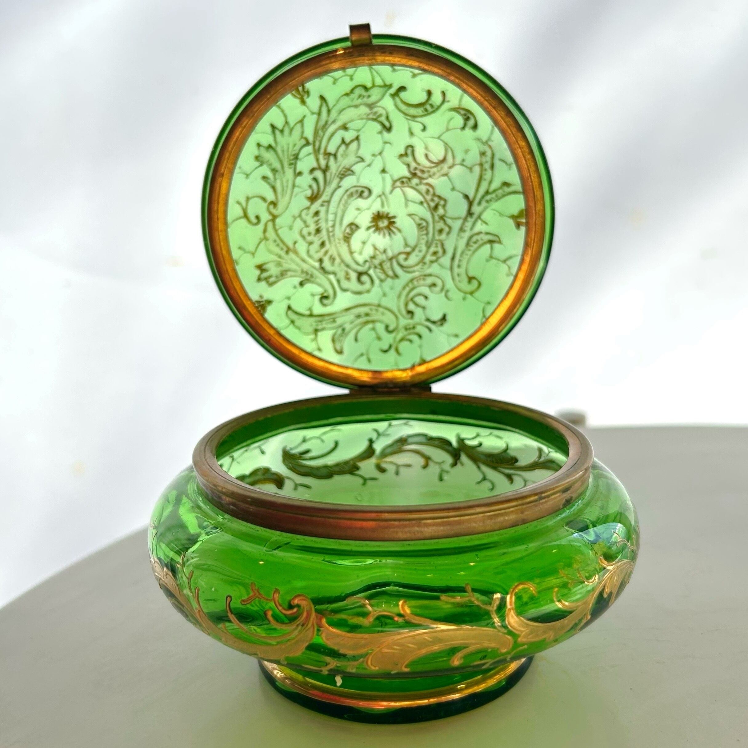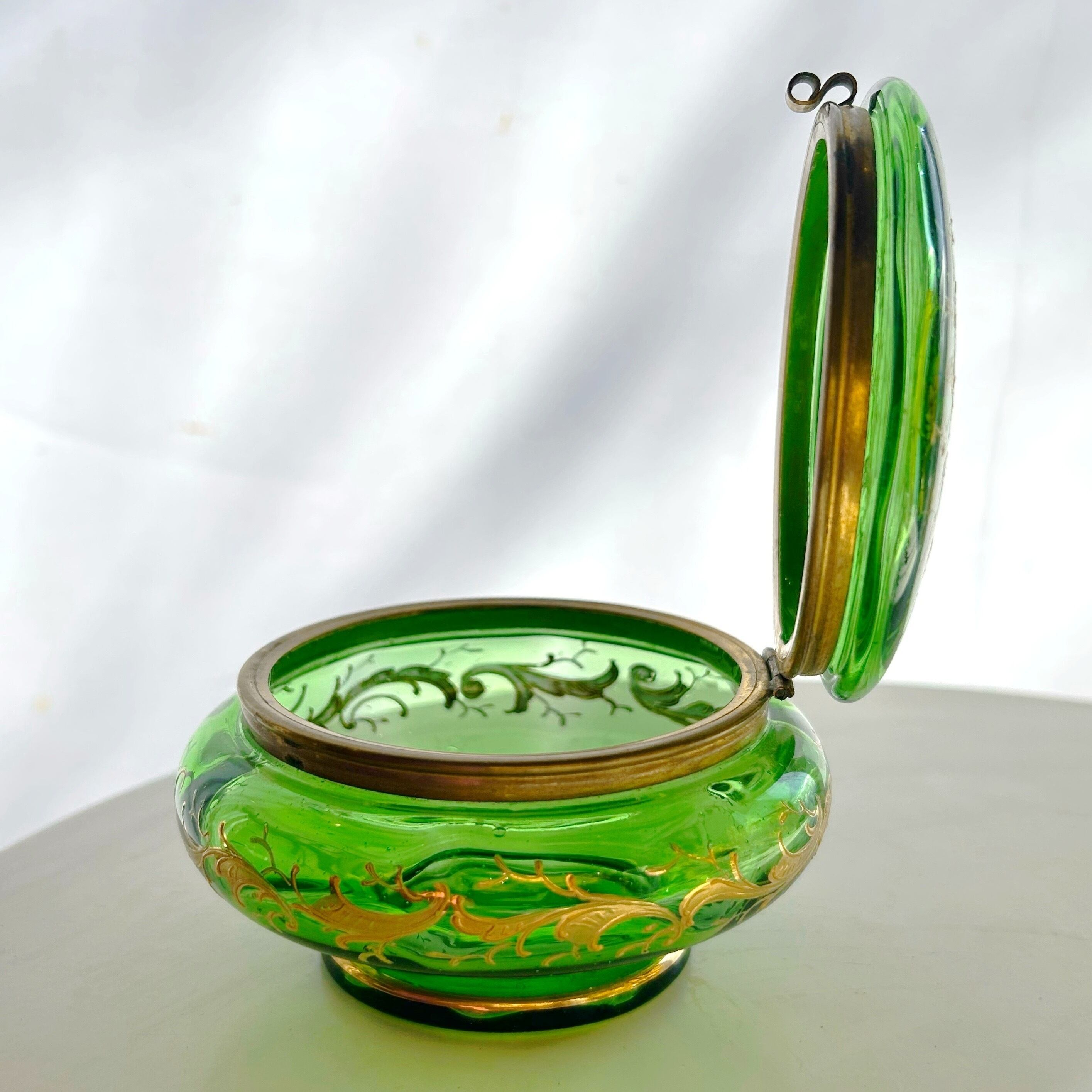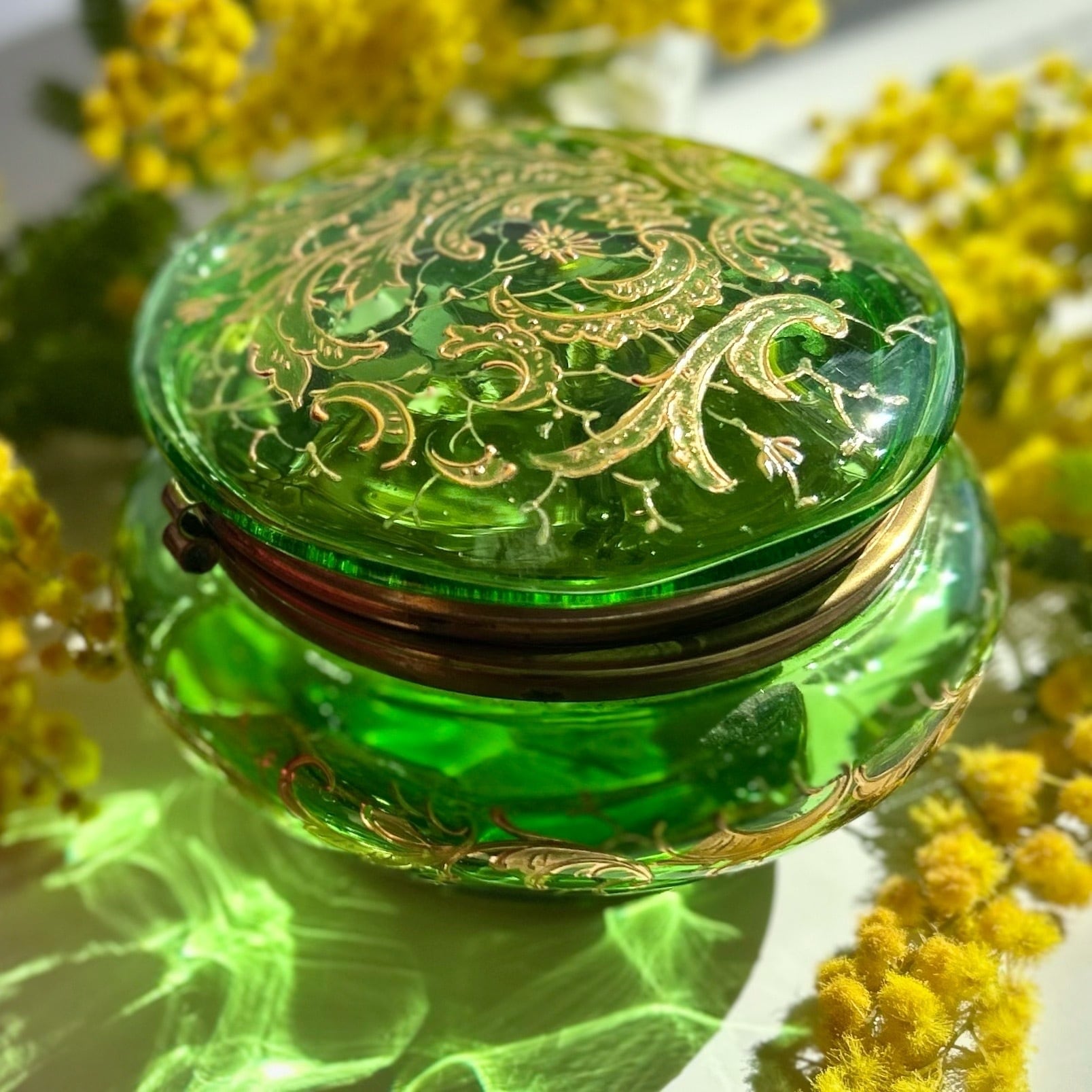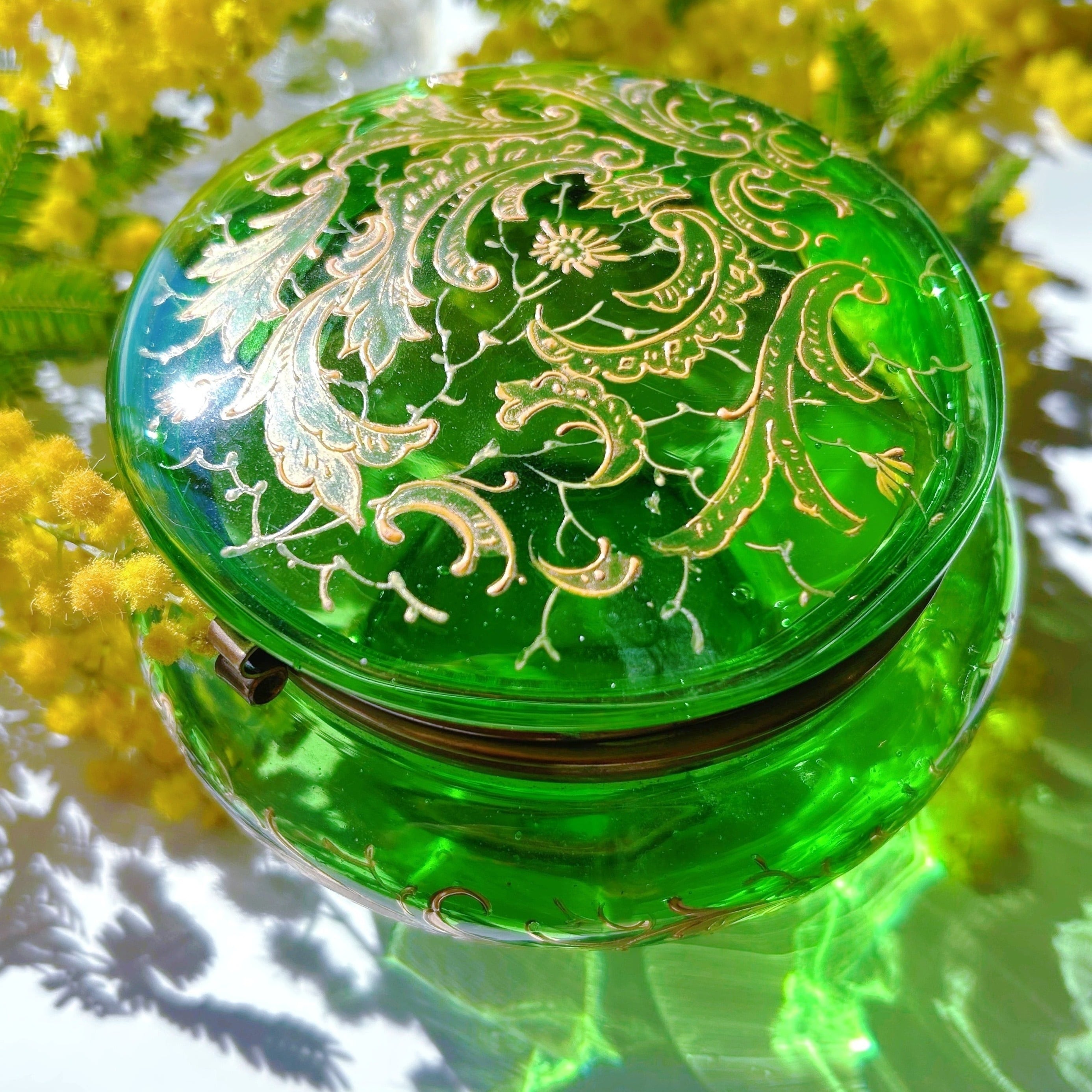 ボンボニエールに光が差し込むと丸みを帯びたガラス器の中は緑のきらめきで満たされ、これもボヘミアンガラスとその造形が生み出す素晴らしい魅力です。