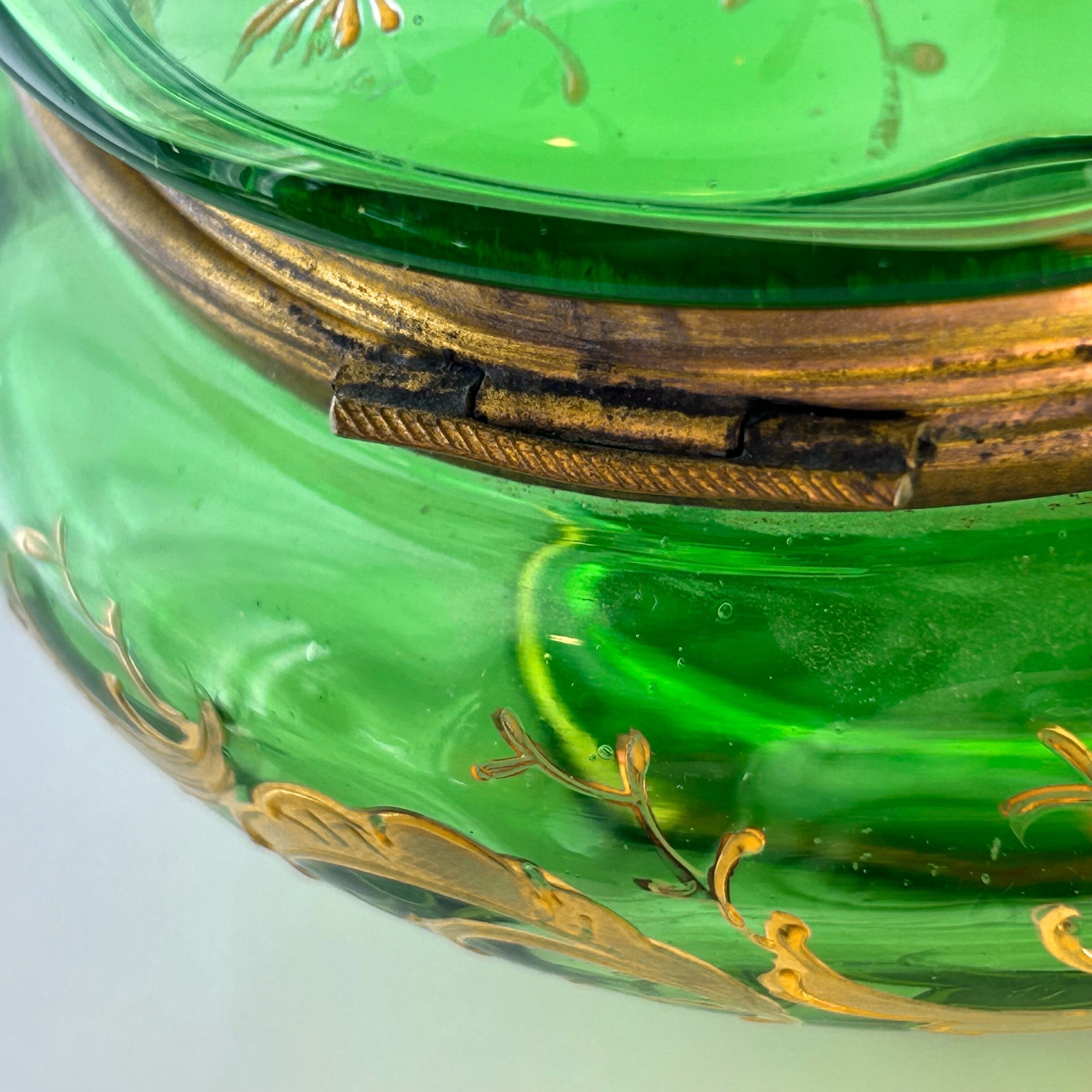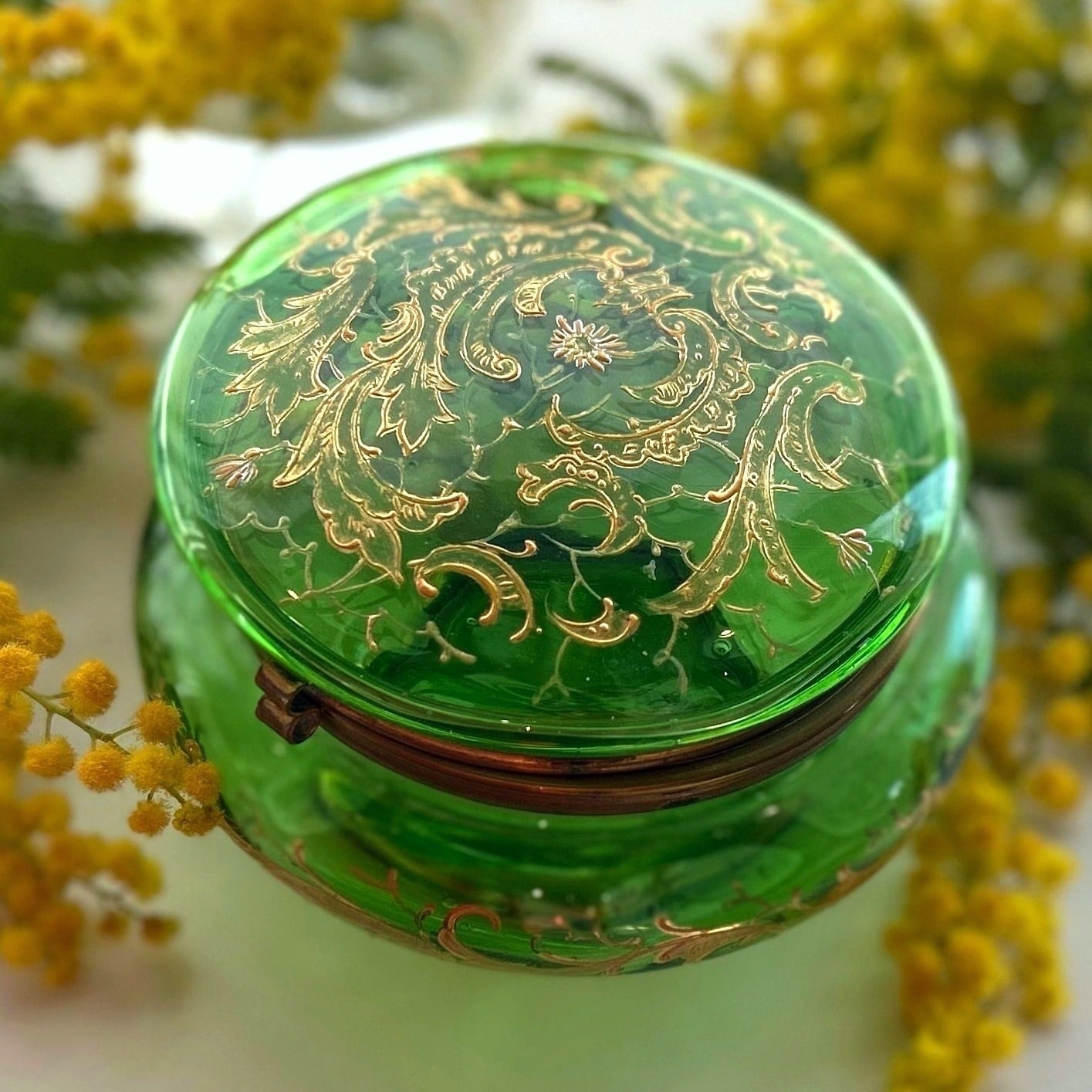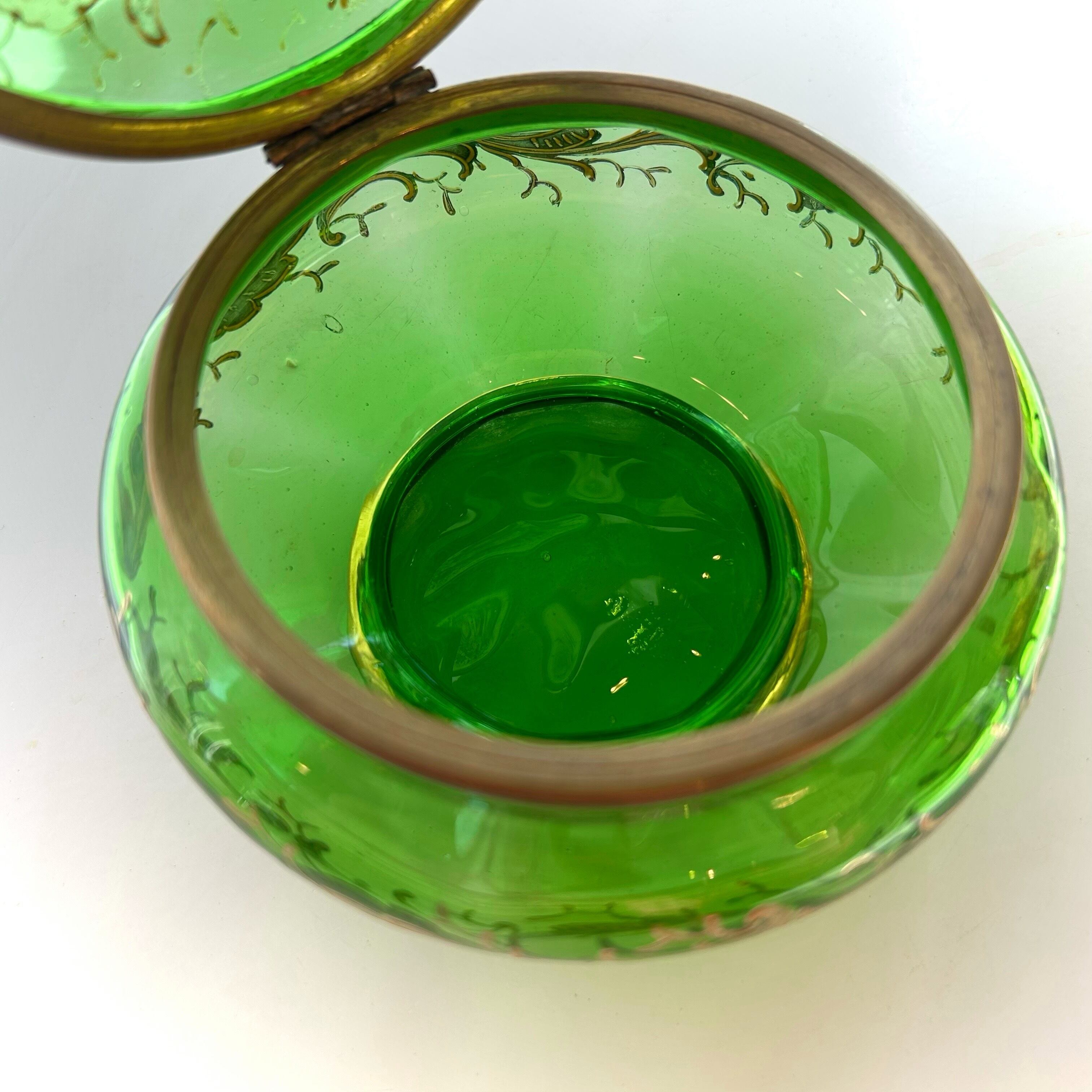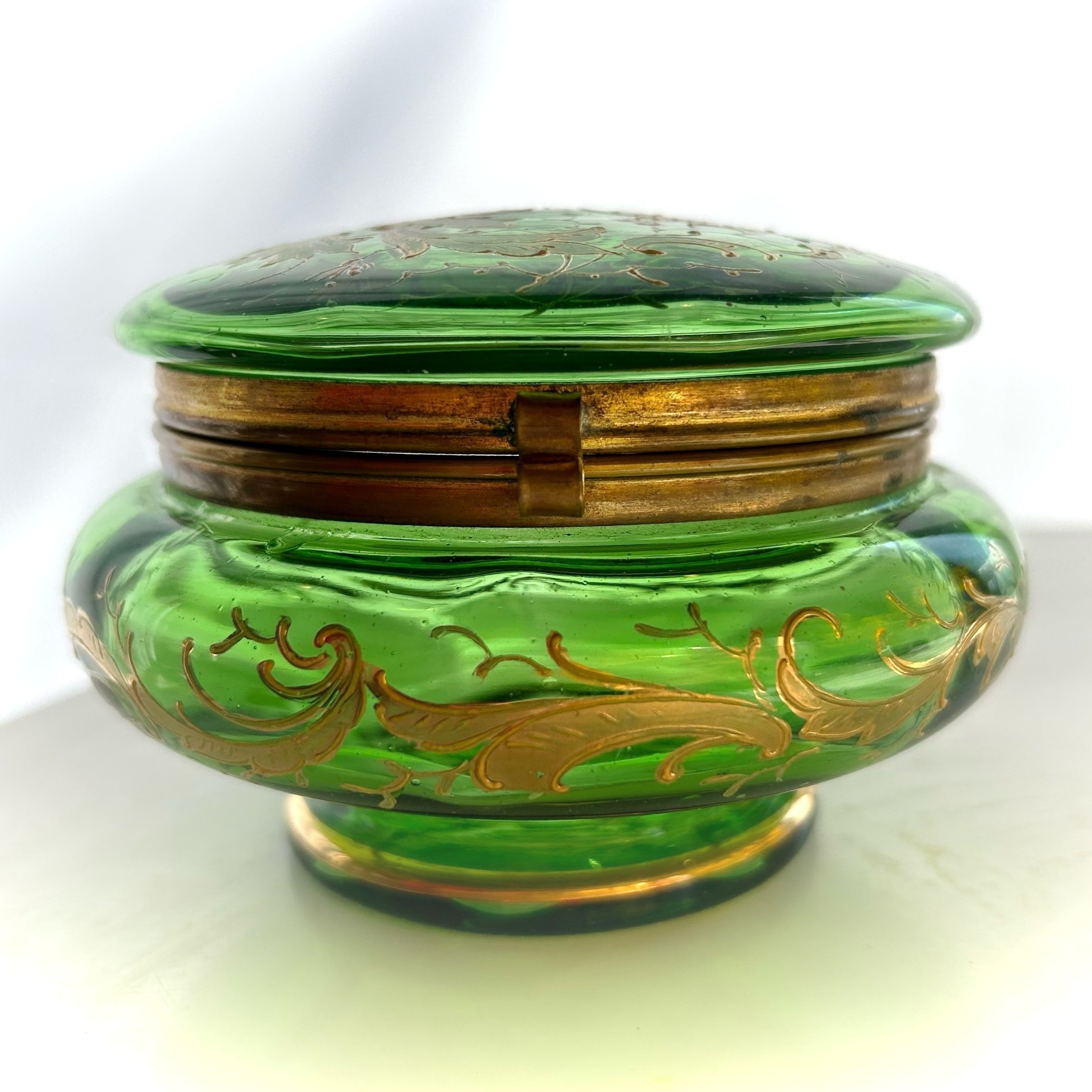 ボンボニエールに光が差し込むと丸みを帯びたガラス器の中は緑のきらめきで満たされ、これもボヘミアンガラスとその造形が生み出す素晴らしい魅力です。