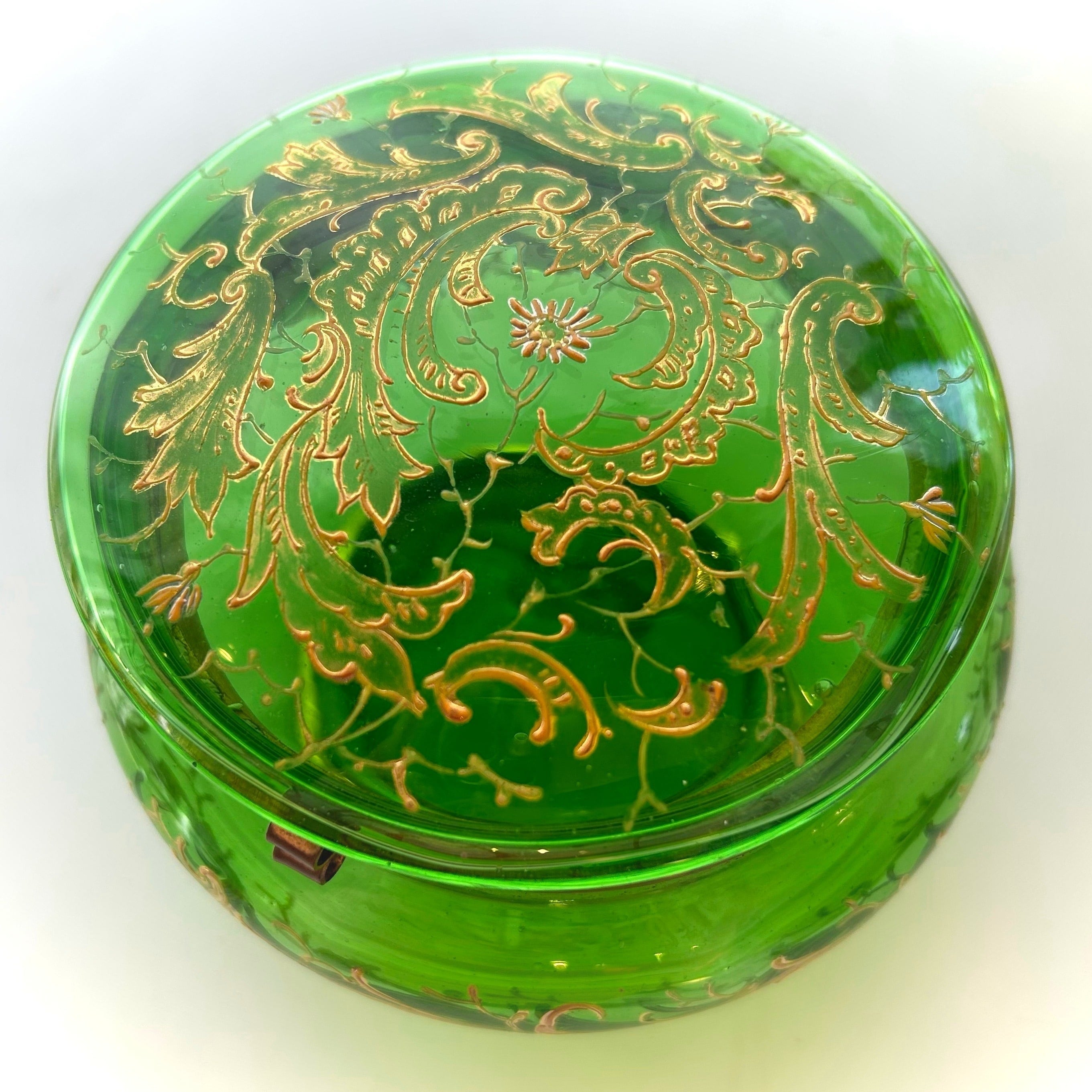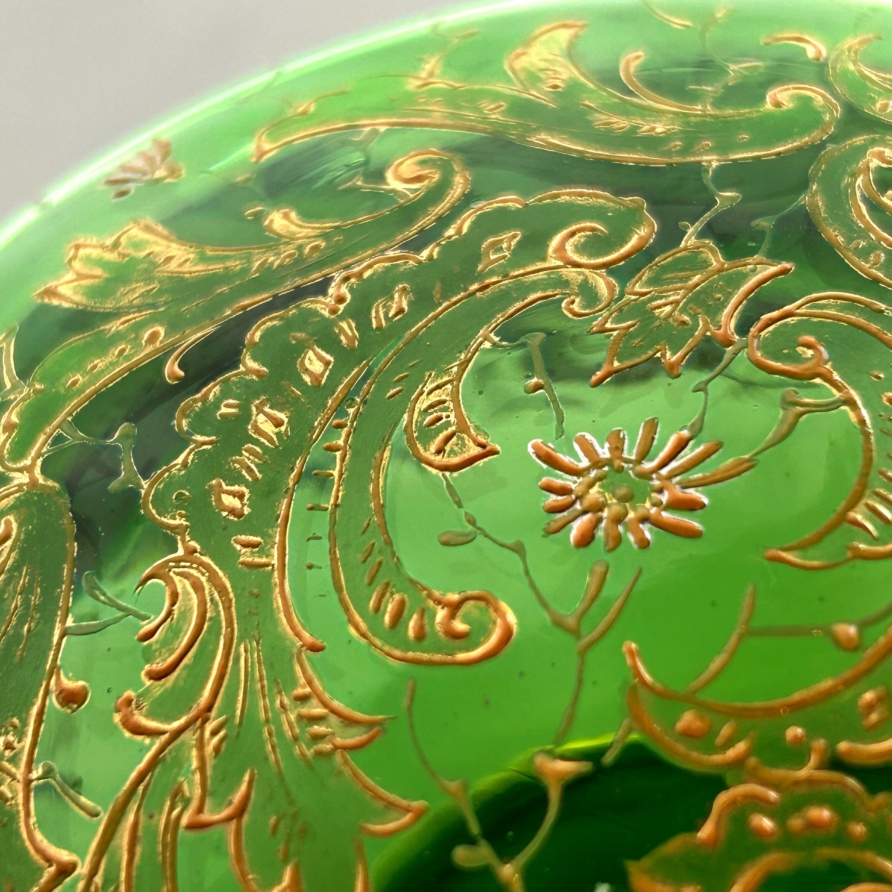 新緑の頃、森には澄んだ緑の光が溢れます。そんな森の光を集めてきたような透き通るエメラルドグリーンのガラスに、金色の花や葉、蔓が渦を巻いて踊ります。エナメルを盛り上げるように巧みに手描きされた植物模様は、不思議な躍動感と立体感を持って新緑の森を祝福しているようです。