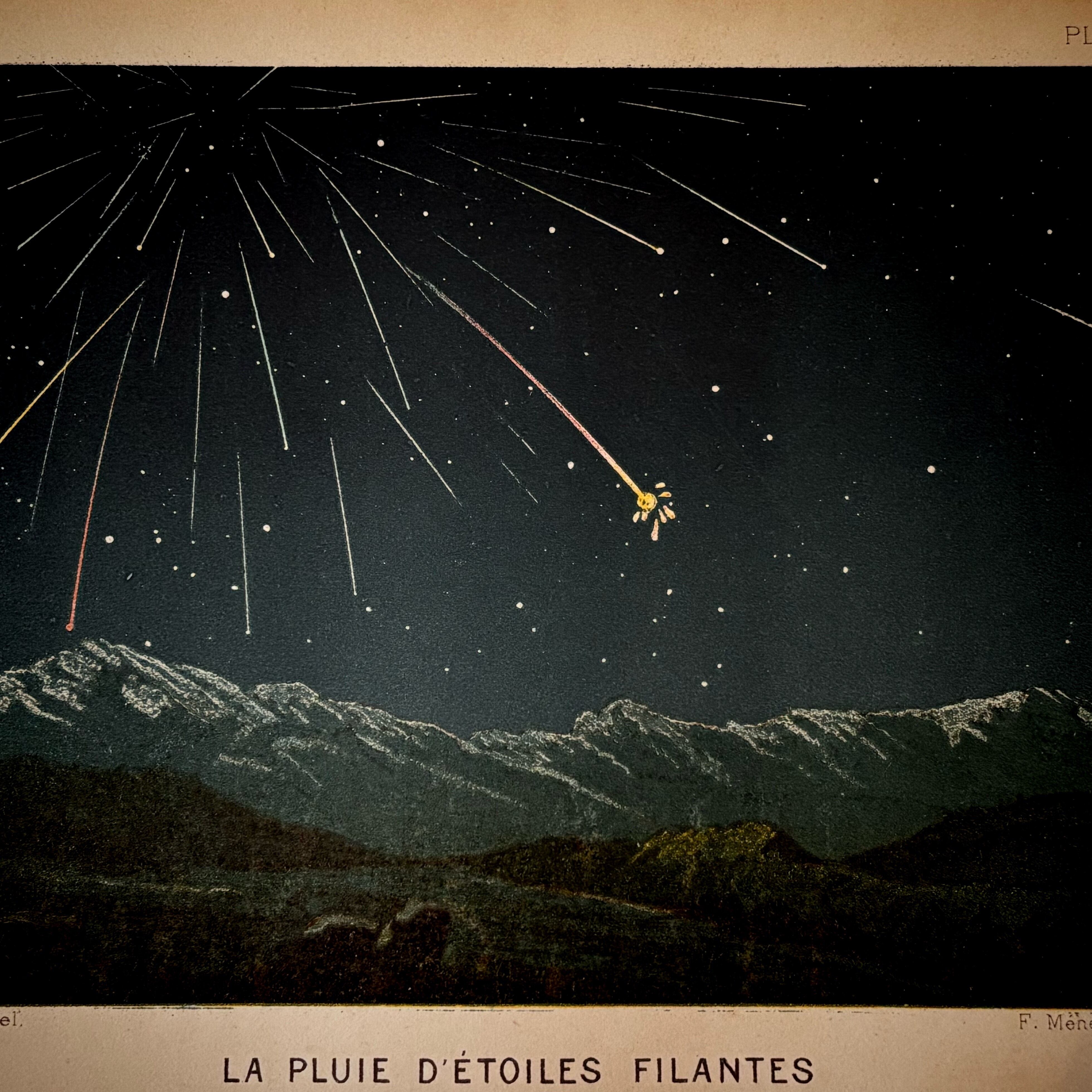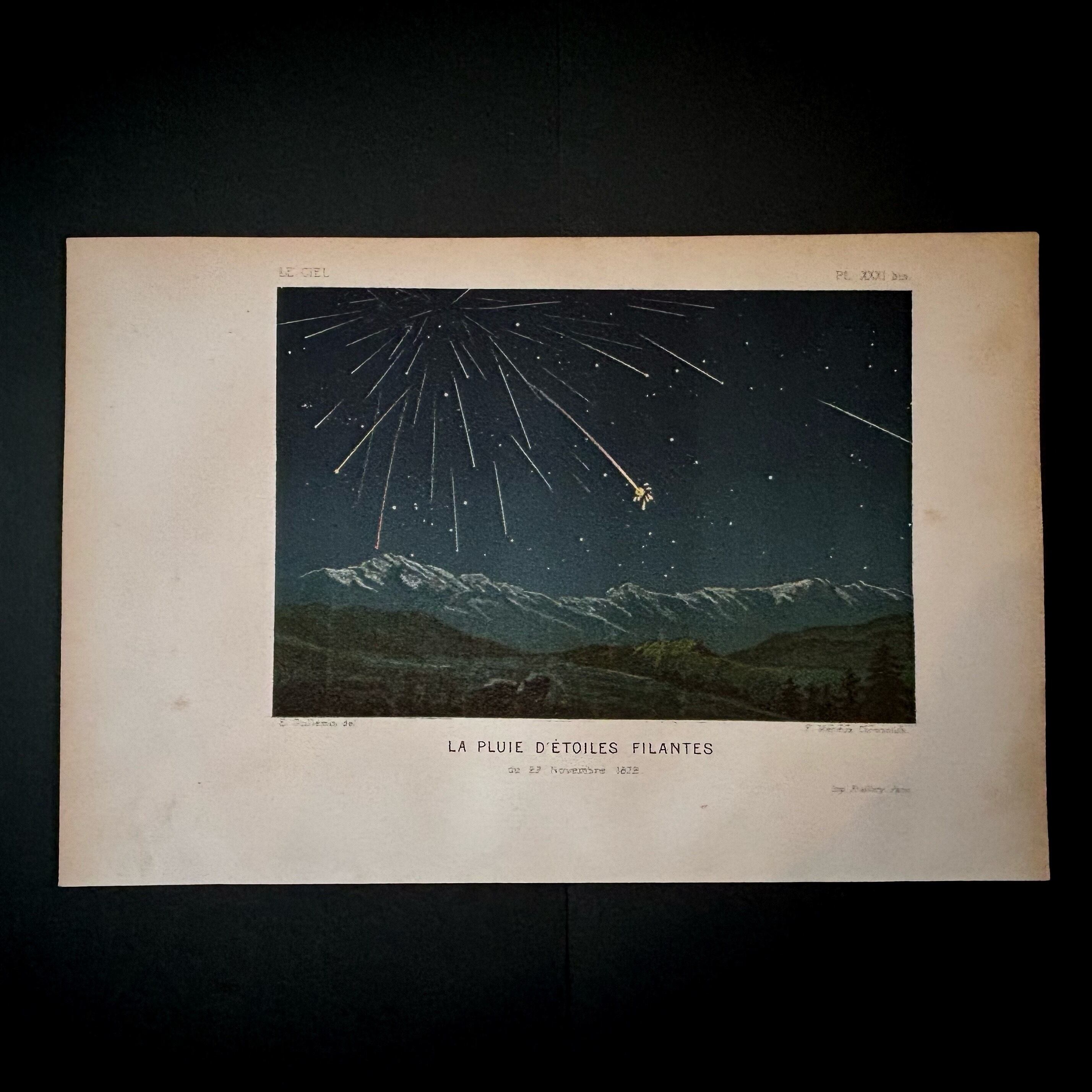 1877年、フランス、パリで出版された一般向け天文書の大著"Le Ciel"「天空」からの挿絵です。限りなく黒に近い青を背景に、流星が降り注ぎます。インクののった色彩リトグラフの星々を見ていると、今から150年ほど前の一夜、このおとぎ話のような光景が夜空を彩ったのだと心から思えてきます。