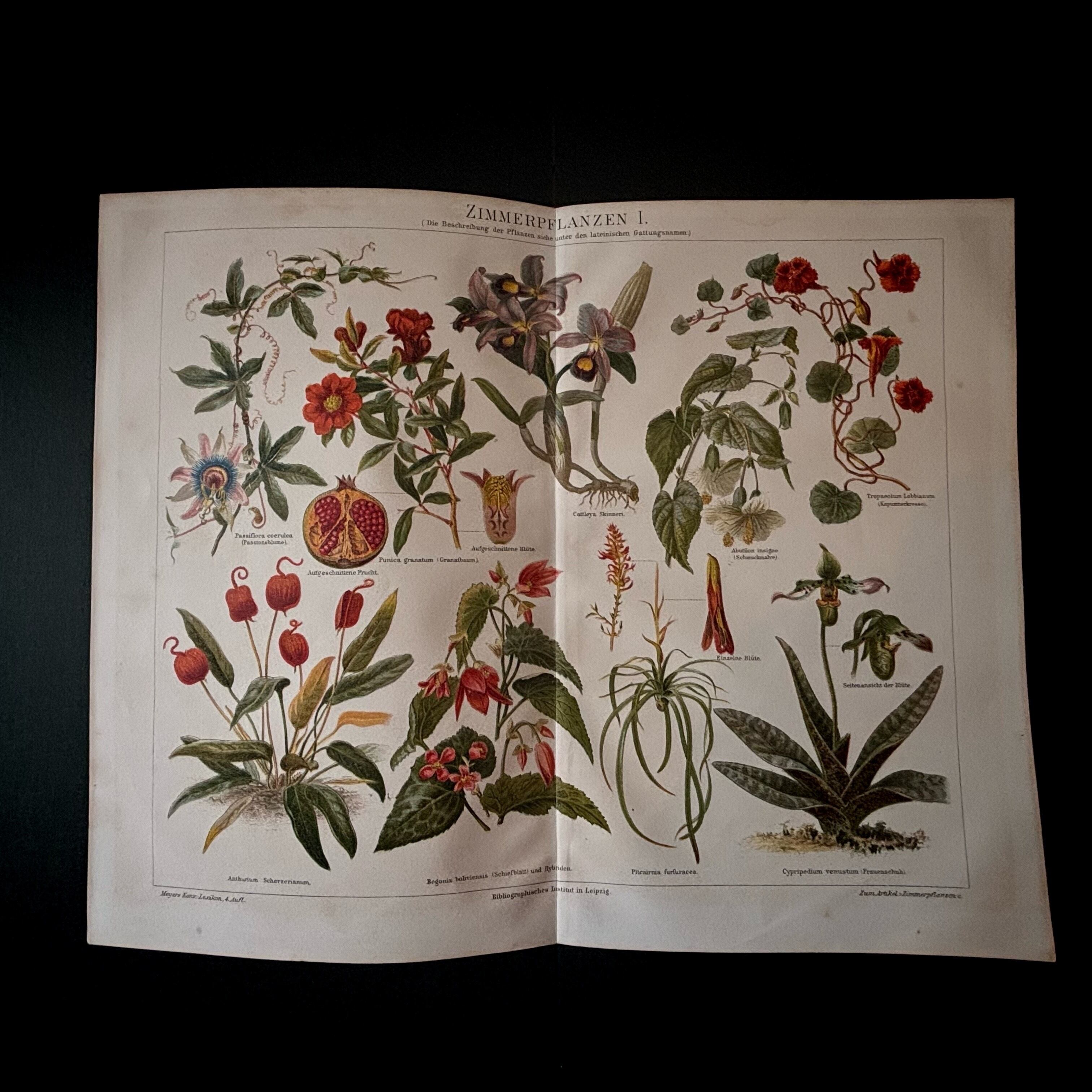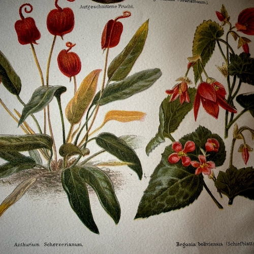 こちらは、当時、ヨーロッパ各地に上質なクロモリトグラフを提供していたドイツ、ライプツィヒの Bibliographisches Institut で1895年に印刷され、ドイツの高名な百科事典であったメイヤー百科事典の挿絵だったものです。ちょうどピークを迎えていたリトグラフ製作の技術と博物学者の情熱が結実してこの博物画が生まれました。リトグラフという印刷方法は1930年頃には使われなくなってしまうのですが、ひと時、時代が育んだ博物画をどうぞお部屋に飾ってはいかがでしょうか。