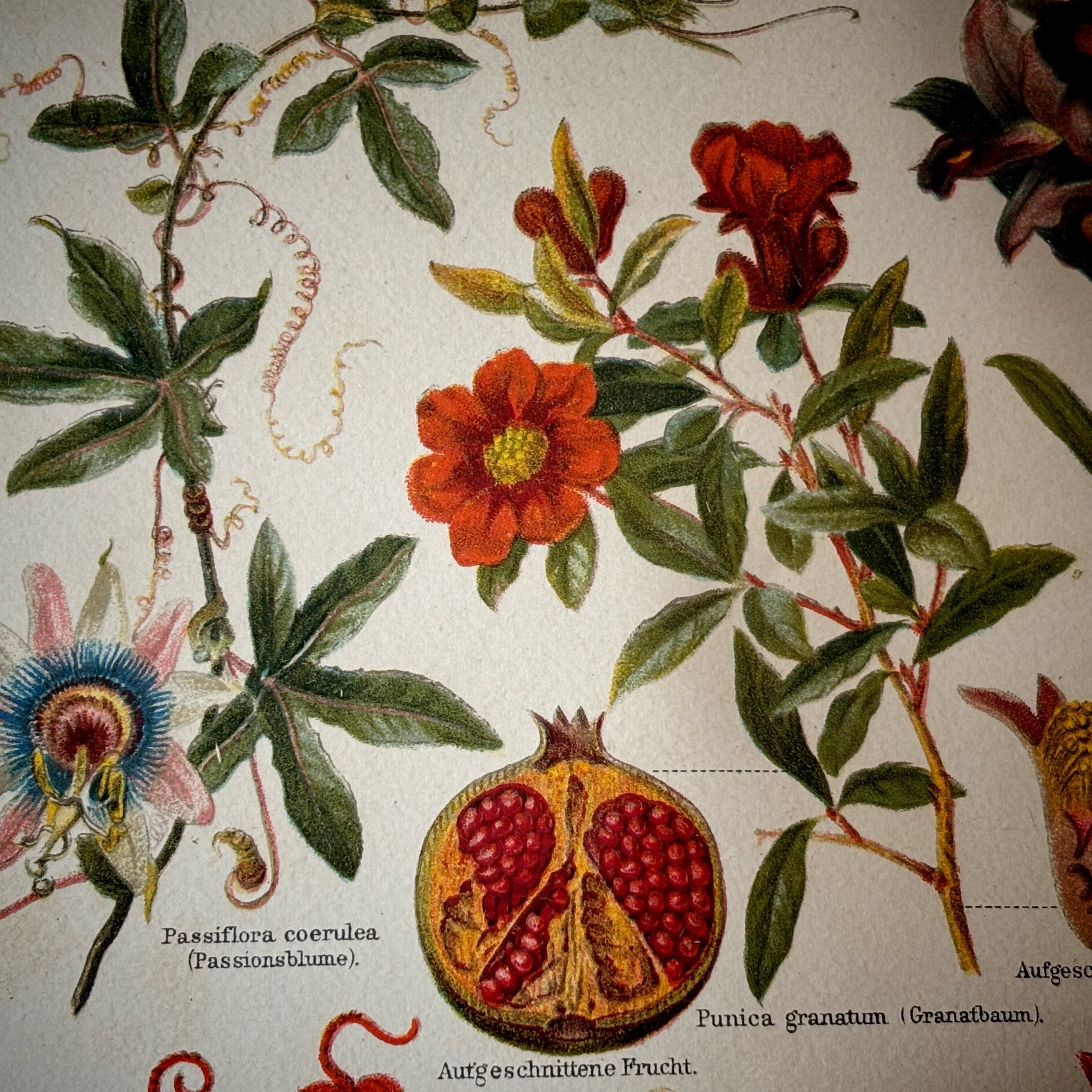 様々な植物が詳細に、鮮やかに、生き生きと描かれています。カラー写真などない時代に、生き物の生態を一般の人々にも伝えようと情熱を傾けた結果、多色刷りリトグラフによる博物画が生まれました。インクが乗ったつやつやとした質感と色彩、巧みな表現が生み出す精緻な造形と立体感が素晴らしい仕上がりです。それだけでなく、植物の配置、さらに花や実の形状を詳しく説明する図の位置など、今の目で見ても美しいデザインで、リトグラフ製作者のセンスの高さが窺えます。