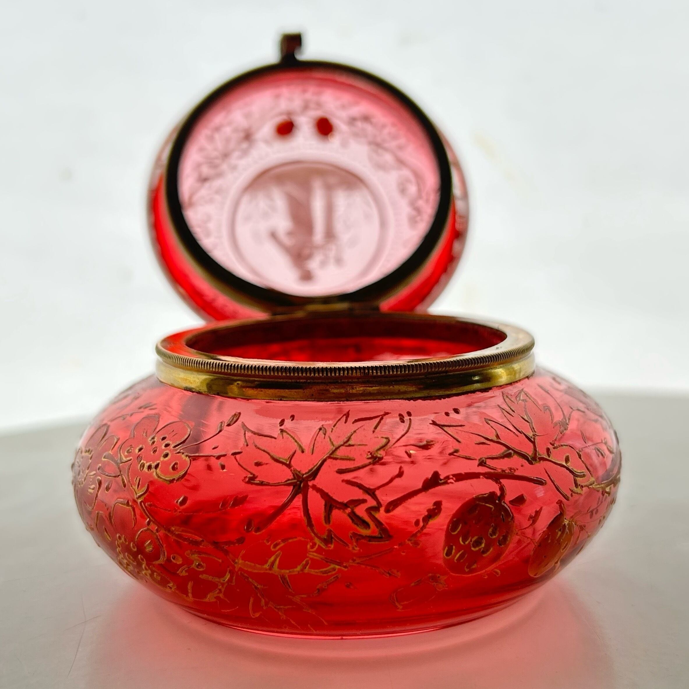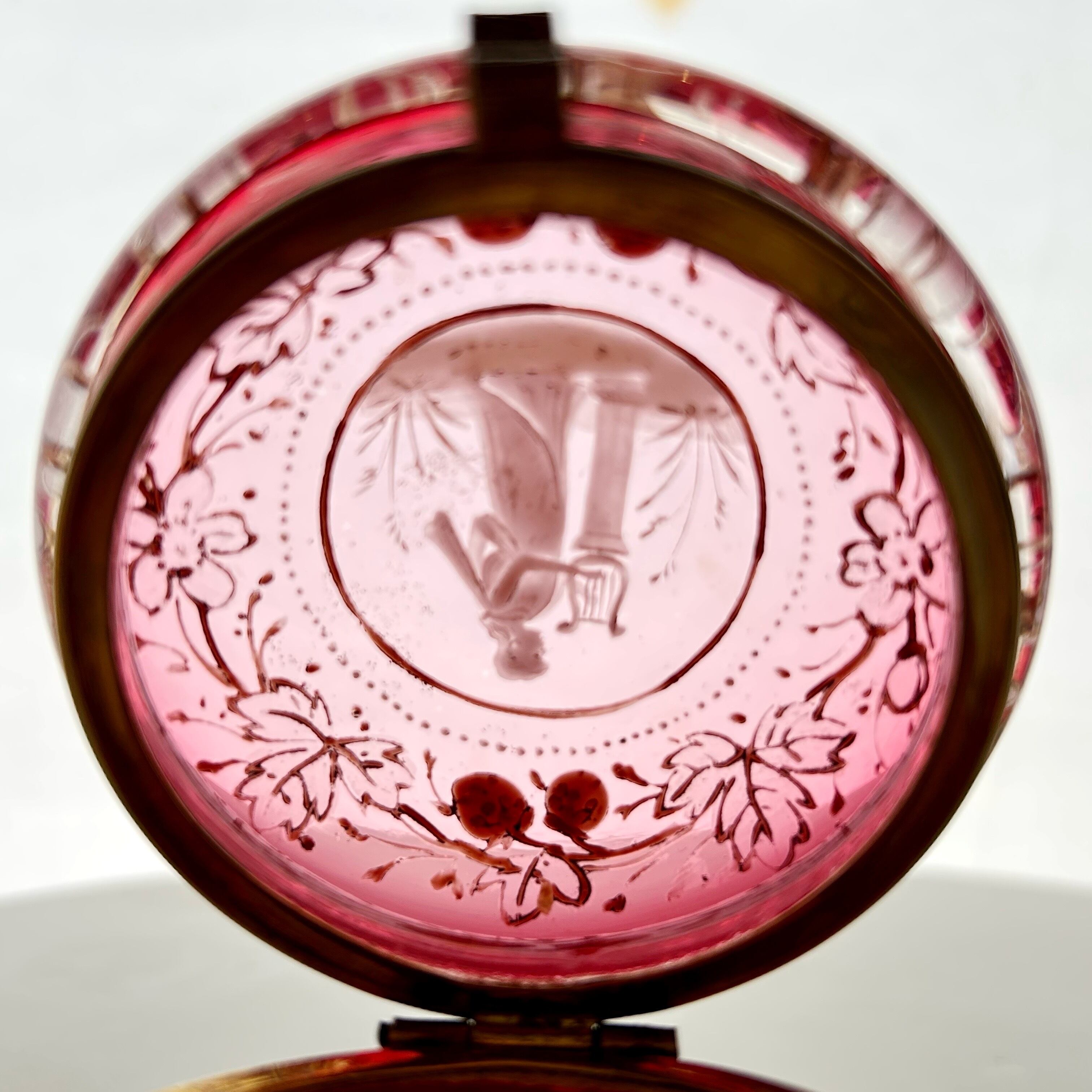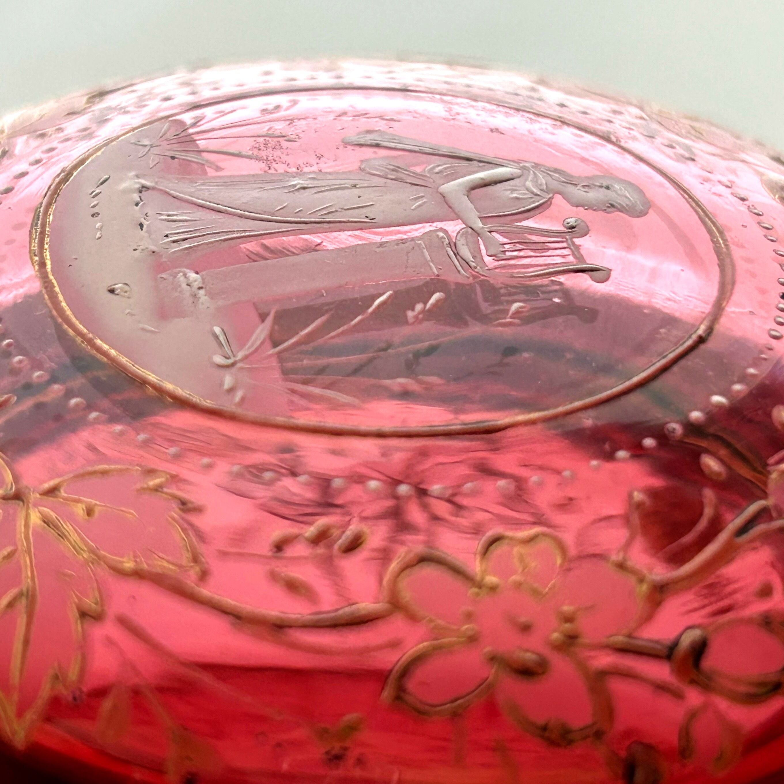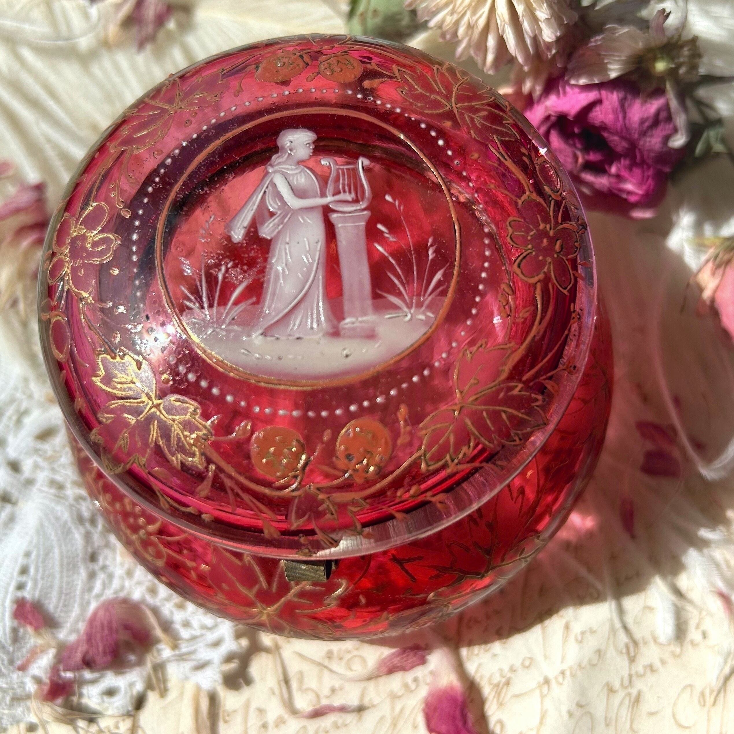 クランベリーのボヘミアンガラスに竪琴を手にした古代ギリシャの女性像が浮かび上がり、周囲には苺が生い茂る、まさに春の女神のボンボニエールです。