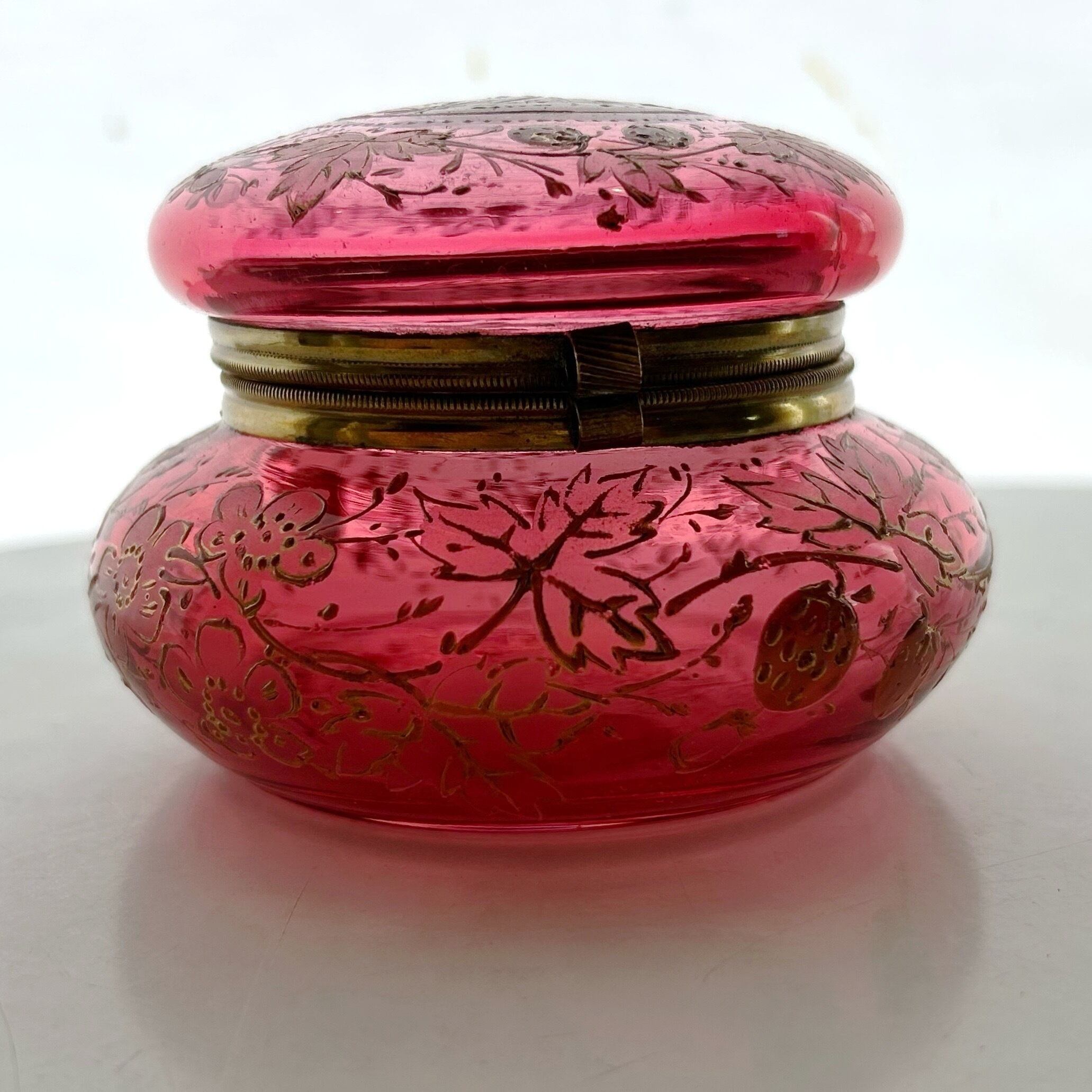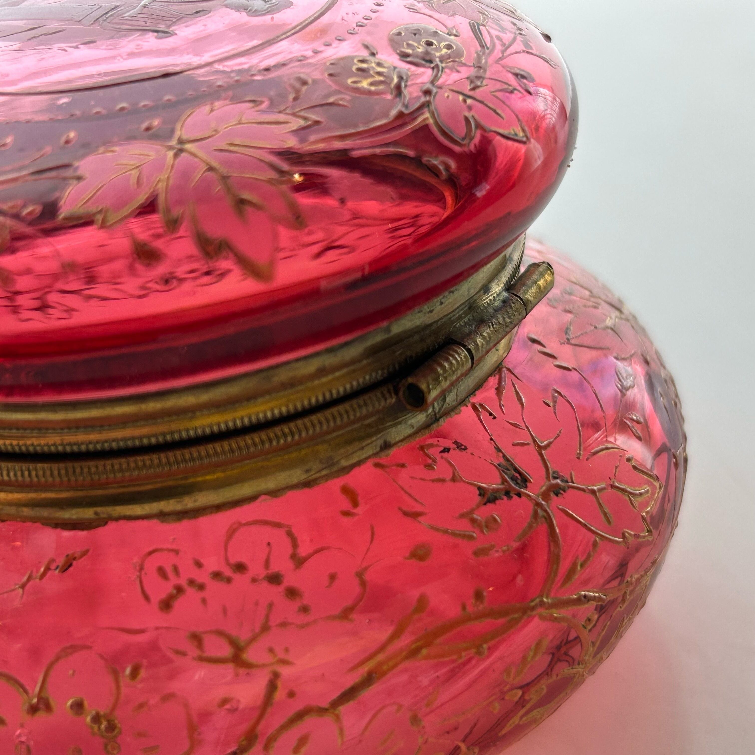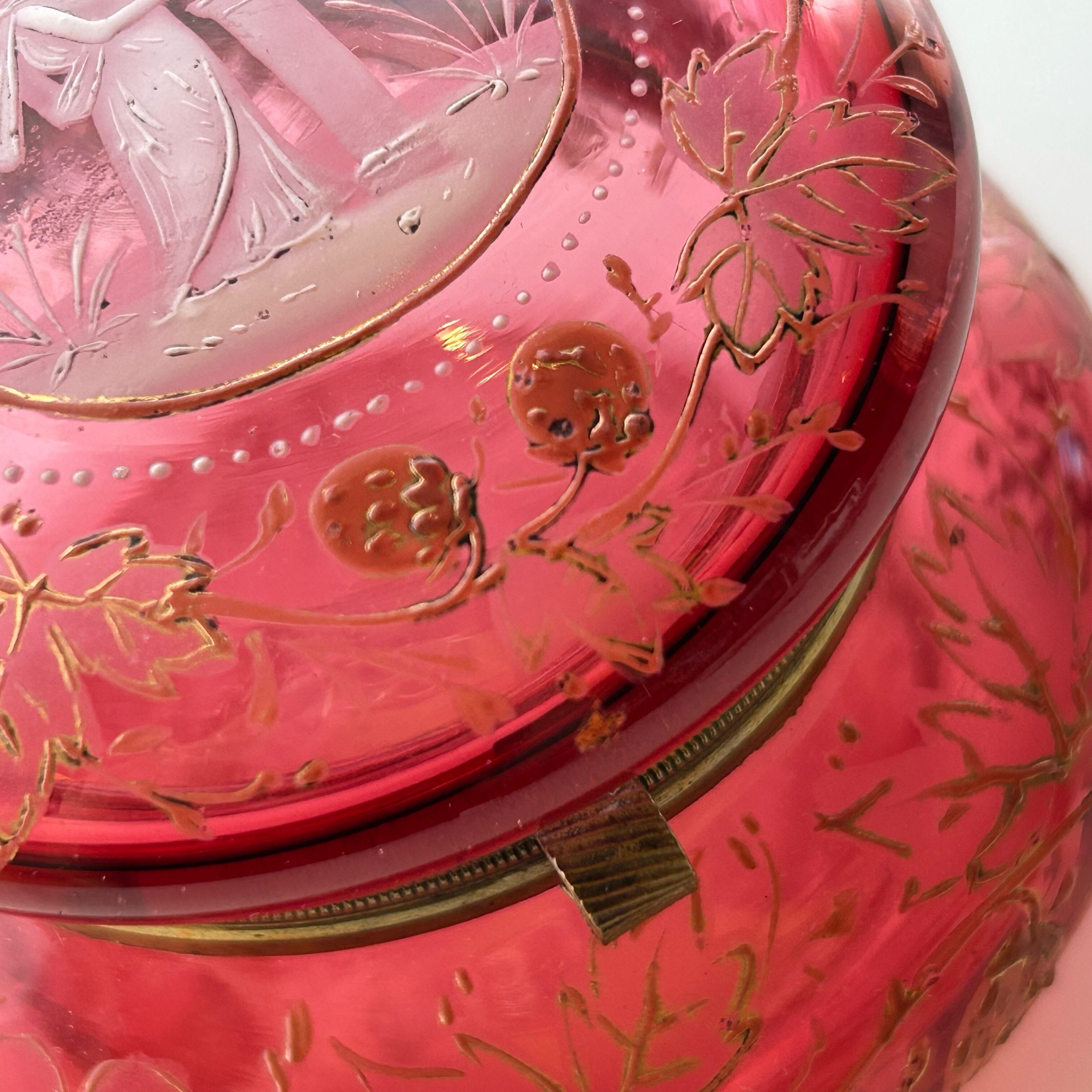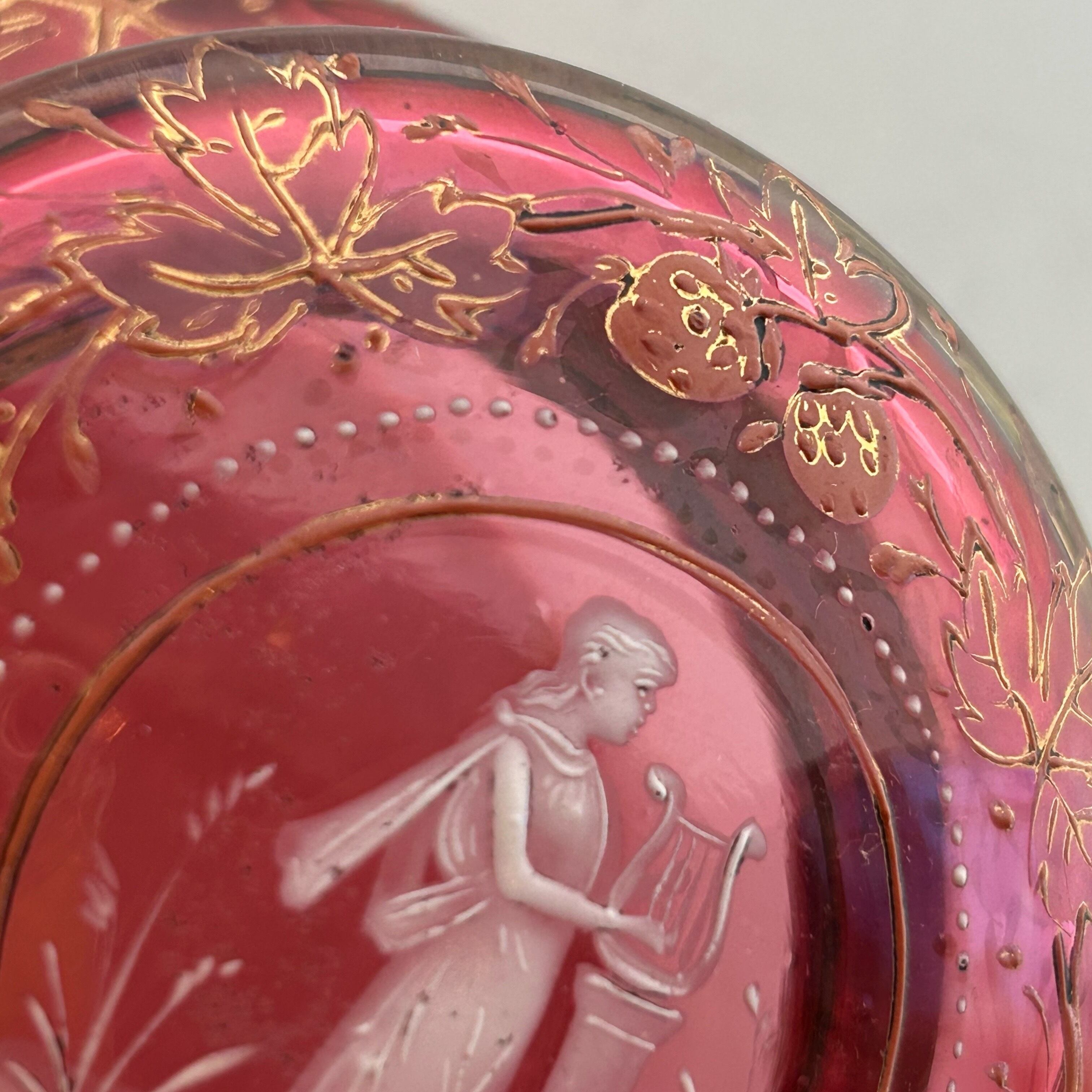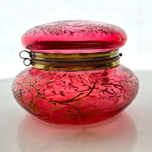 クランベリーのボヘミアンガラスに竪琴を手にした古代ギリシャの女性像が浮かび上がり、周囲には苺が生い茂る、まさに春の女神のボンボニエールです。