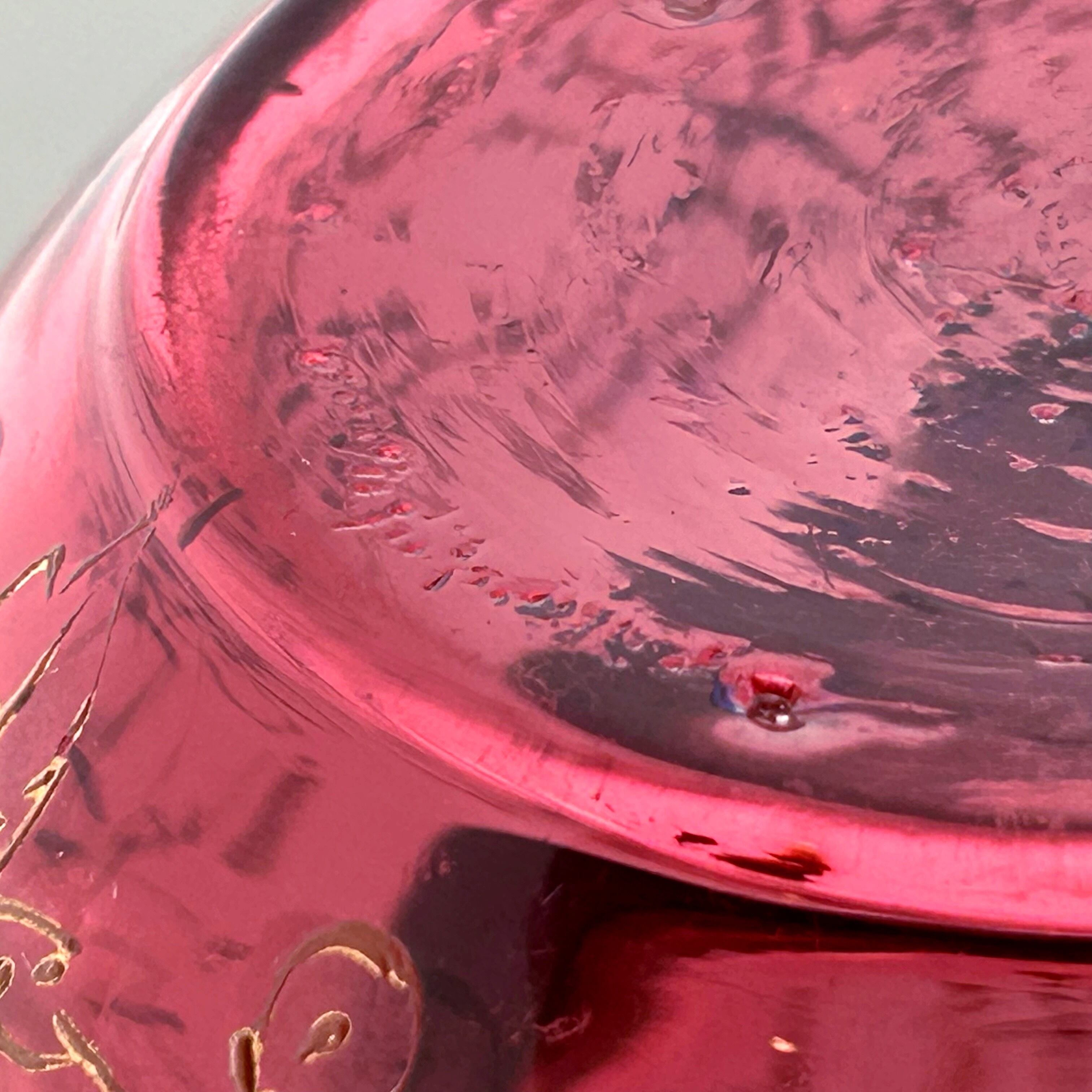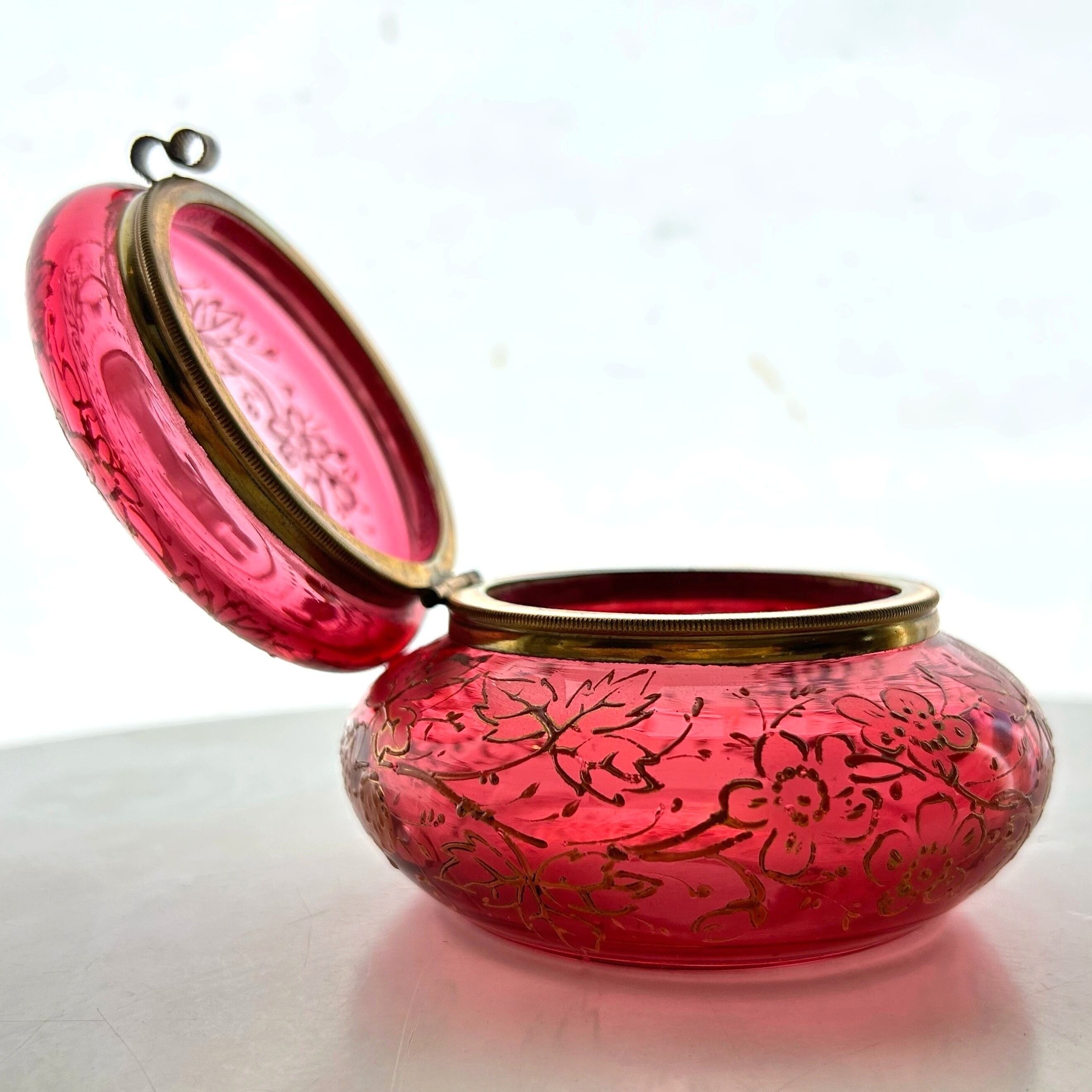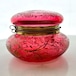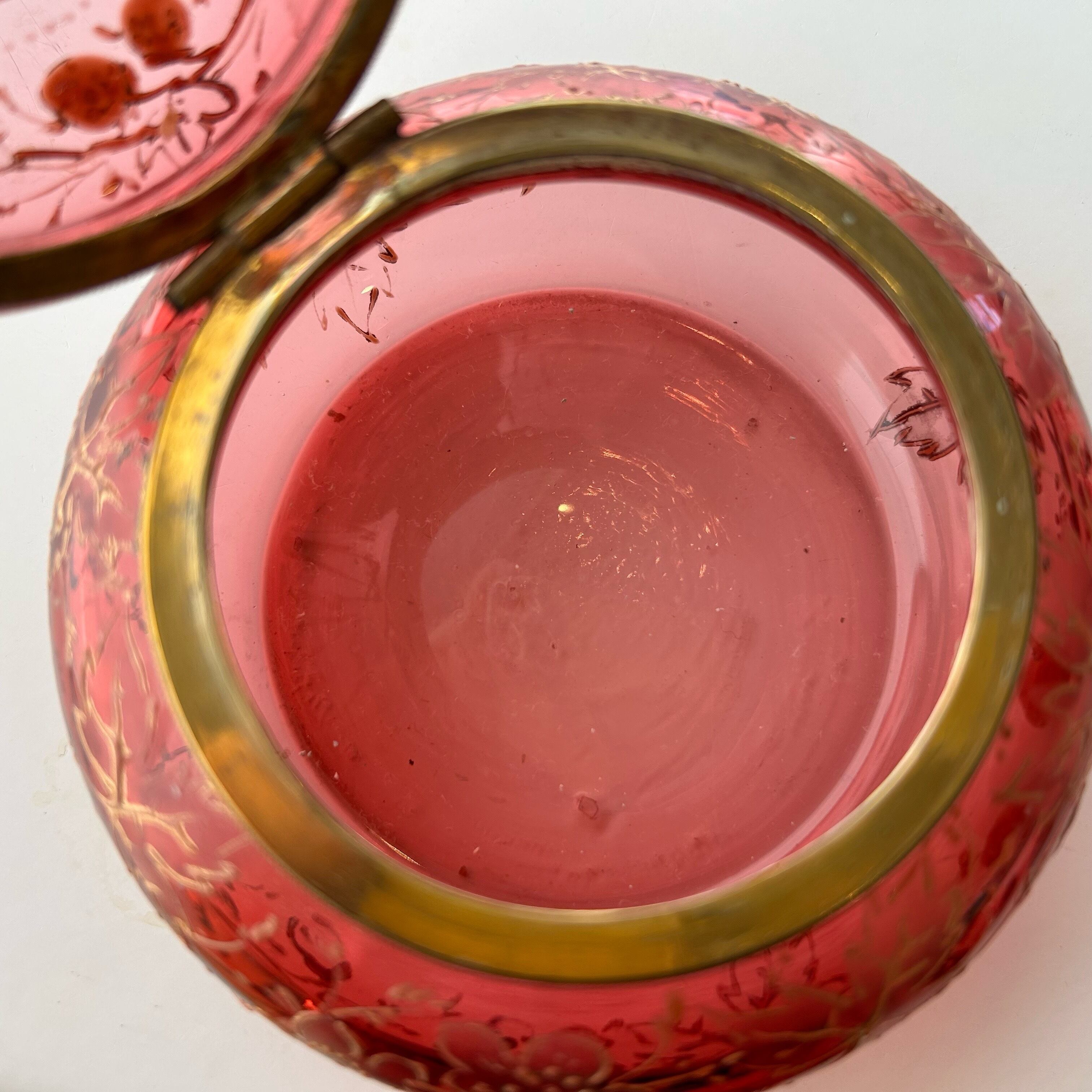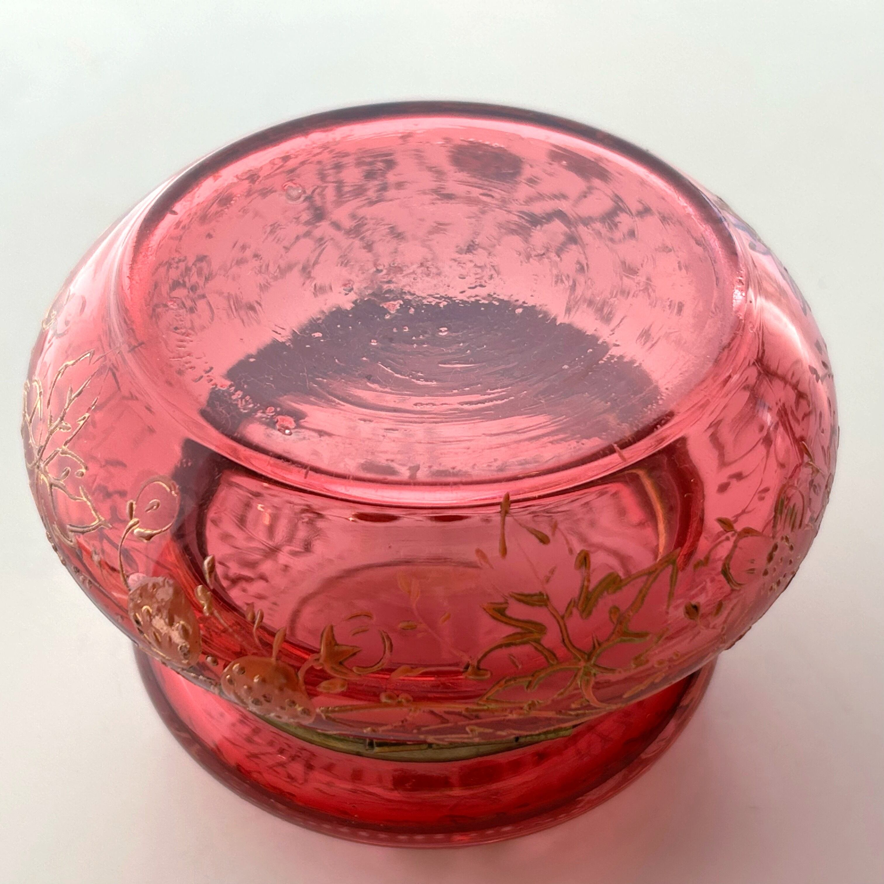 クランベリーのボヘミアンガラスに竪琴を手にした古代ギリシャの女性像が浮かび上がり、周囲には苺が生い茂る、まさに春の女神のボンボニエールです。