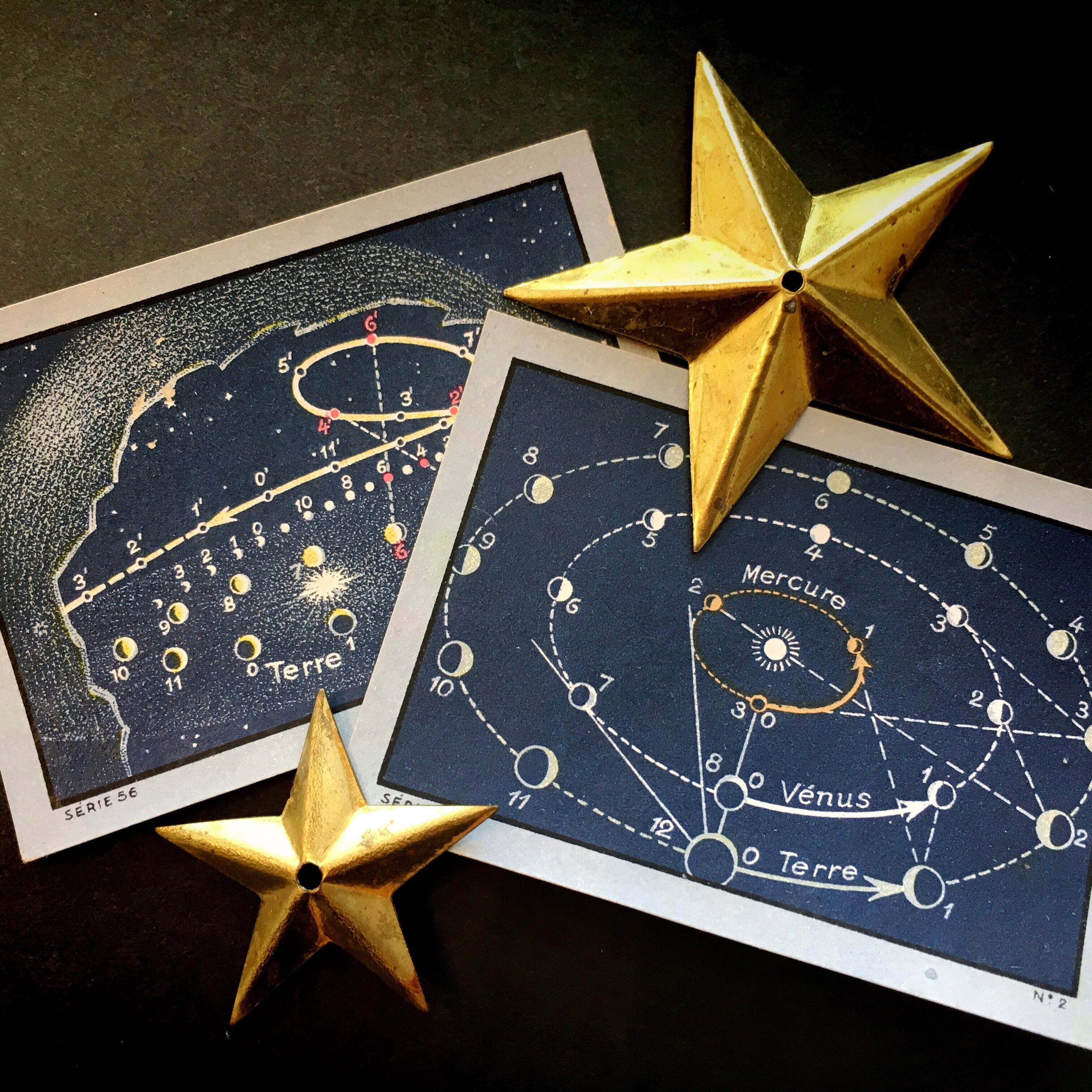 1932年、ネスレのチョコレートカード「世界の驚異」シリーズの中の「太陽と惑星」カードです。少年趣味でファンタスティック。なんてお洒落なオマケでしょう! きっとお小遣いを握りしめてお菓子屋さんに急いだ子もいたのでしょうね。裏にはフランス語で天文についての説明があります。