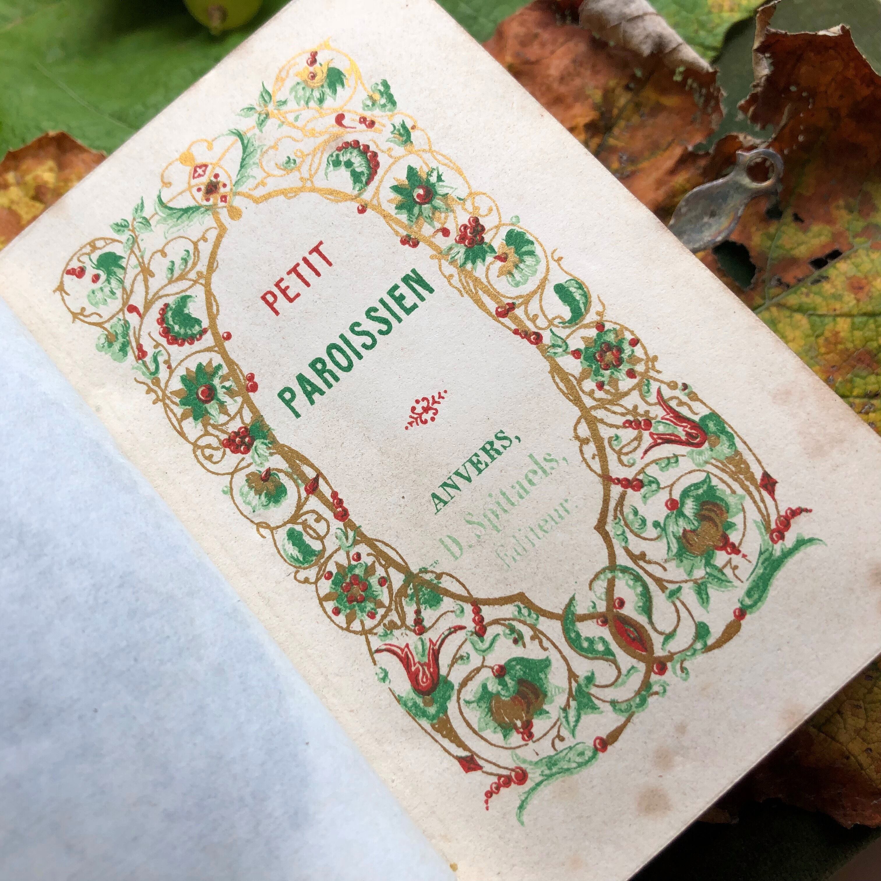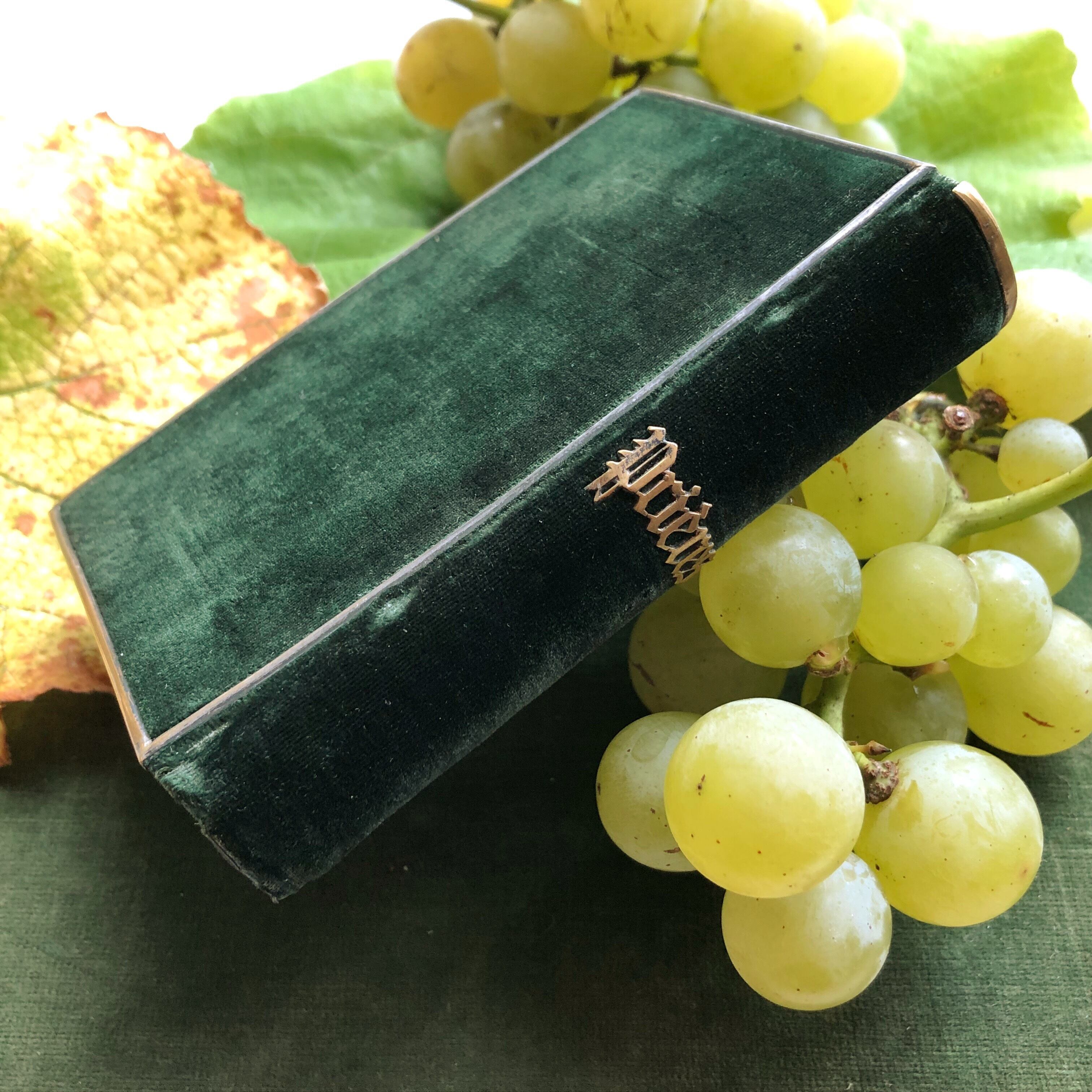 フランスの祈祷書です。烏の濡れ羽色とでも申しましょうか、漆黒と見紛う深緑色のベルベットはしっとりと濡れるよう。表紙は真鍮で縁取られ、同じく真鍮の荊とJHSのエンブレムが付いています。これはラテン語でJesus Hominum Salvator (救いの人イエス)の意味です。この優美で気高い祈祷書の持ち主は、どんな人物だったのでしょうか。