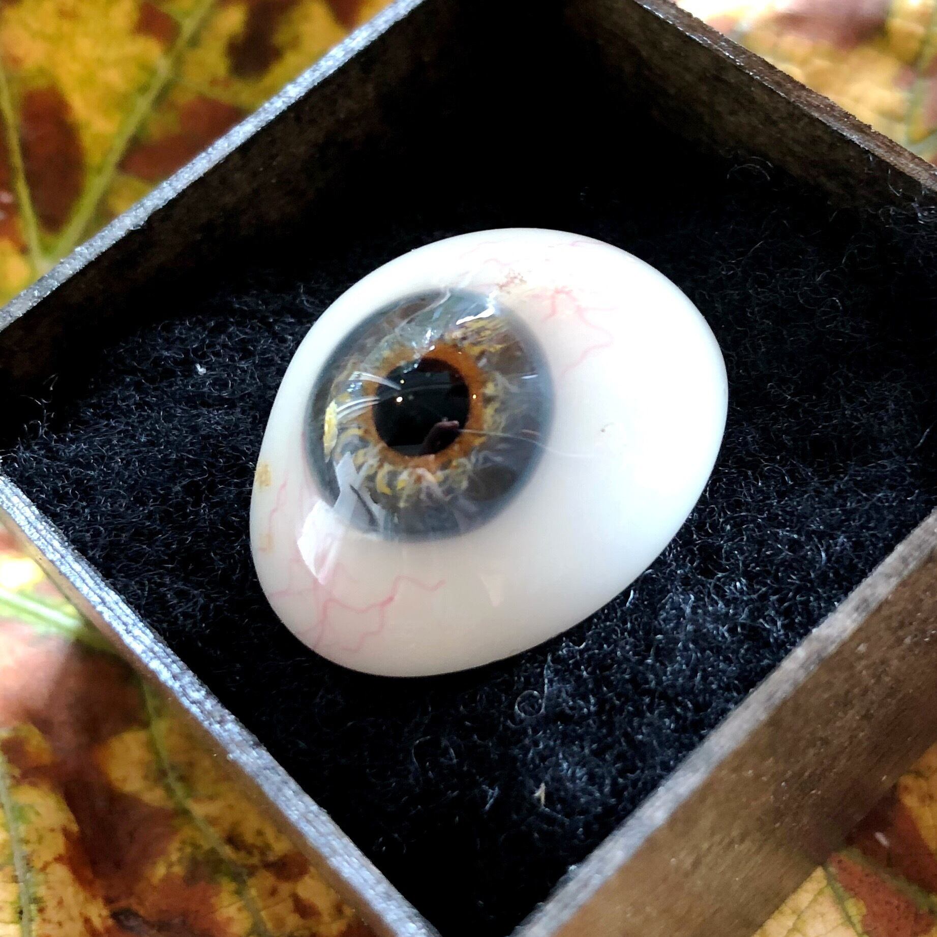 濃いブルーグレーを背景に、黒目の周りにオレンジの環、その外側には黄色い放射状の線、ブラックホールらしき影も見えます。この小さな義眼の中に、深い深い奥行きのある世界が創られています。