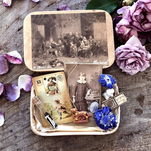ドラジェの箱に、ノスタルジックな古いものを詰めてみました。古写真、ルノルマンカード、植物の種の標本、ミニプレパラート、素焼きの星座、ダメージドール、聖母のメダイ、青い造花が入っています。全てヨーロッパの古いもので、個々の販売価格を総合すると、お値段はかなりお得です。これらに思い出の品を追加して、オリジナルの秘密の小箱にしてみても良いかもしれません。