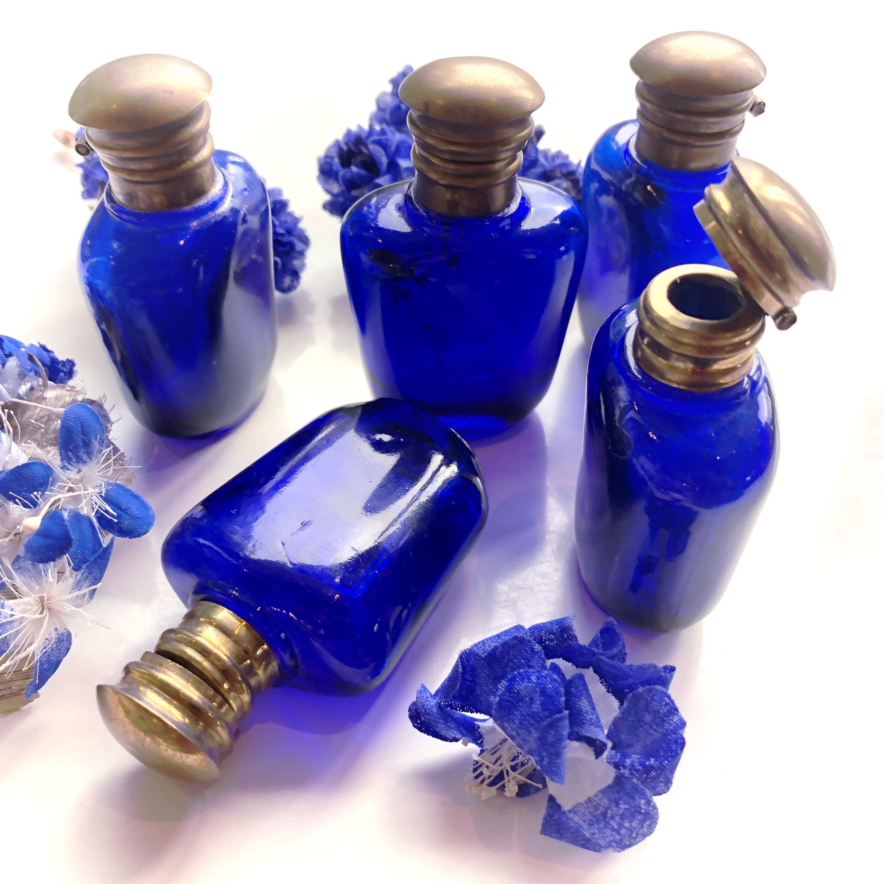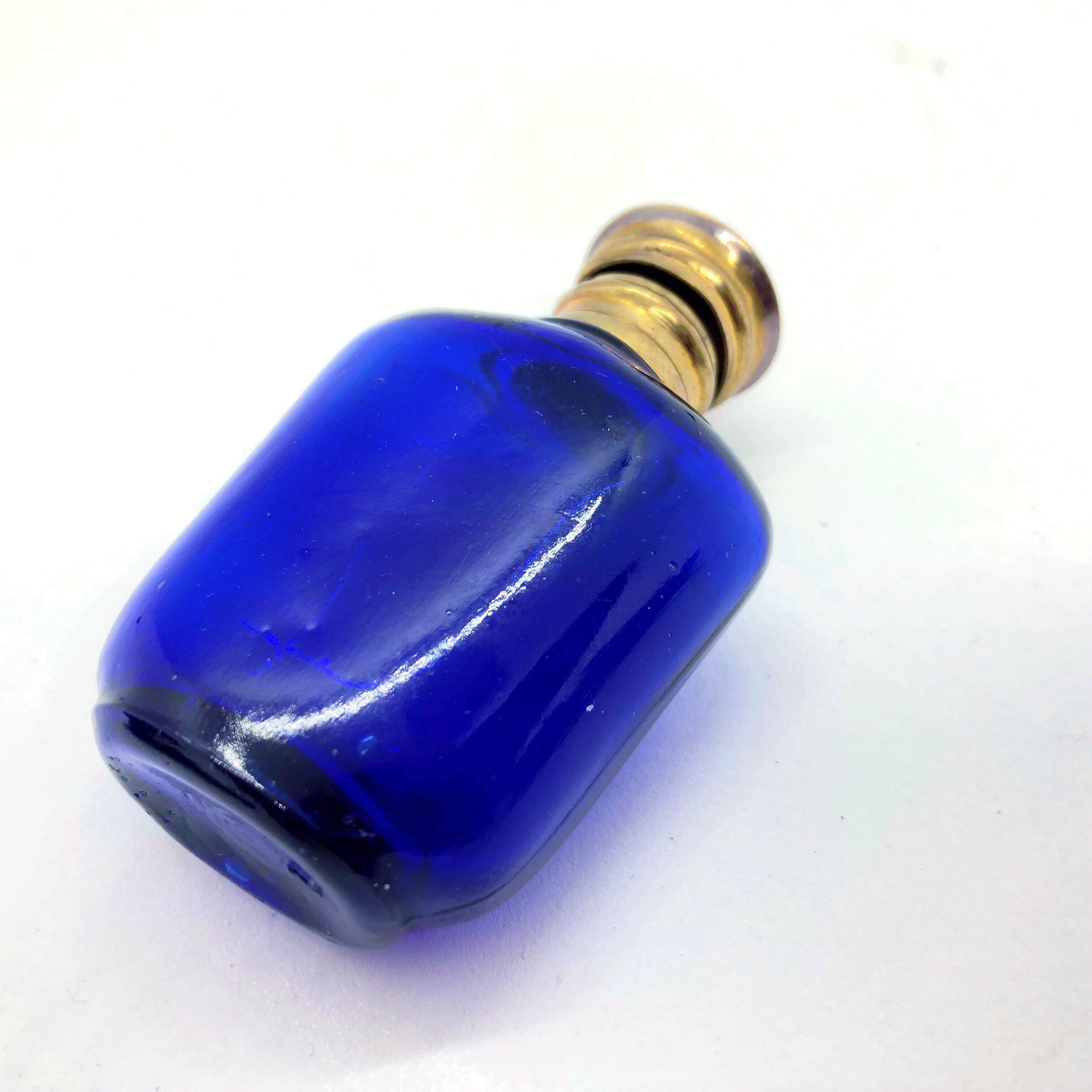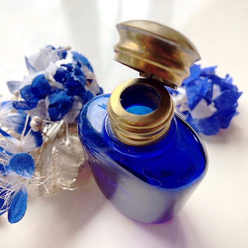 鮮やかなコバルトブルーの香水瓶です。古いガラスならではの揺らめきがあり、気泡が入っているものもあります。口は真鍮で、金とブルーのコントラストが美しいです。窓辺に置くと光を透かし、青い影が落ちてとても綺麗です。古い物なので完璧に密封は出来ませんが、蓋が全くガバガバというわけでもありません。高機能をお求めでなければ、現代でもお使い頂けると思います。
