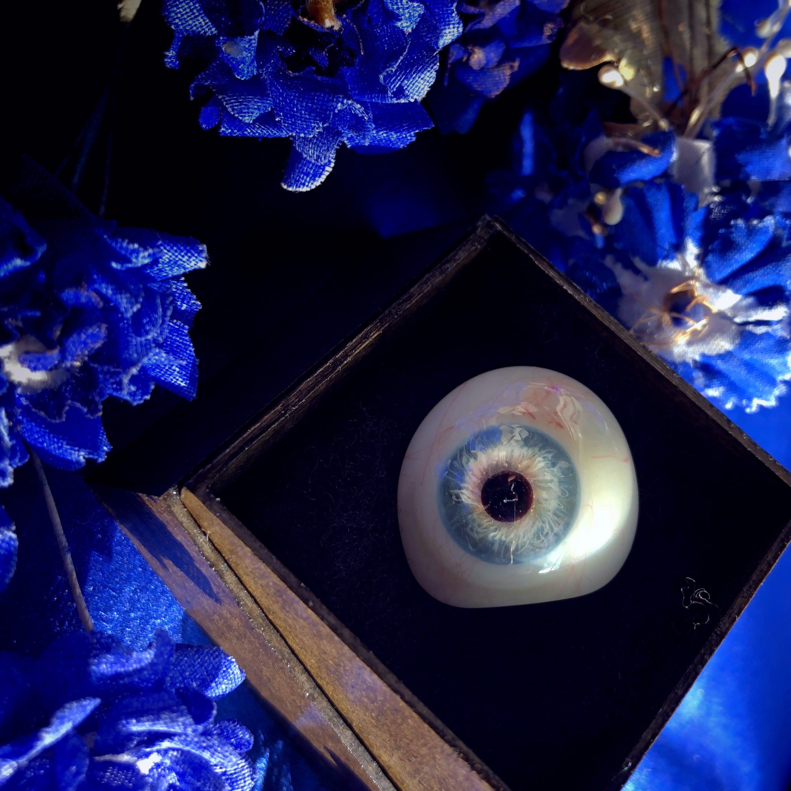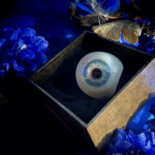 セルリアンブルーの渦の奥に明るい月光色が光り、光線の加減でキラリと光って見える義眼です。中心部分にはほんのりスミレ色が滲み、一層神秘的に見えます。透明度も高く、奥行もあり、引き込まれそうな魅力のある義眼です。