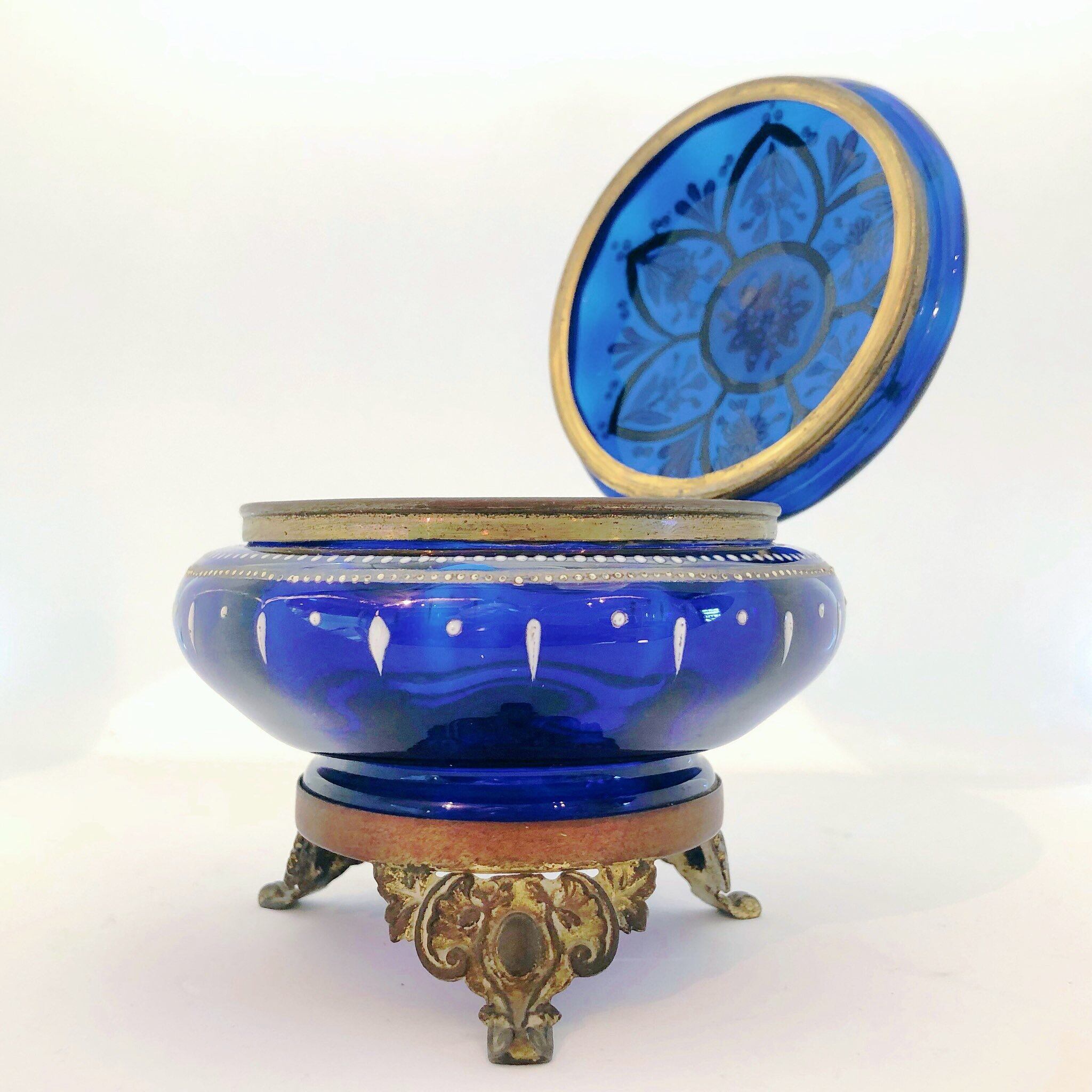 足付きの青いボンボ二エールです。目にも綾なコバルトブルーのガラスに、金彩と乳白色のエナメルでデイジーや忘れな草が描かれていています。留金と足は真鍮製で豪華な作り。上流階級のお祝い事の贈り物だと思われます。製造国は不明ですが19世紀にフランスで使われていたものです。
