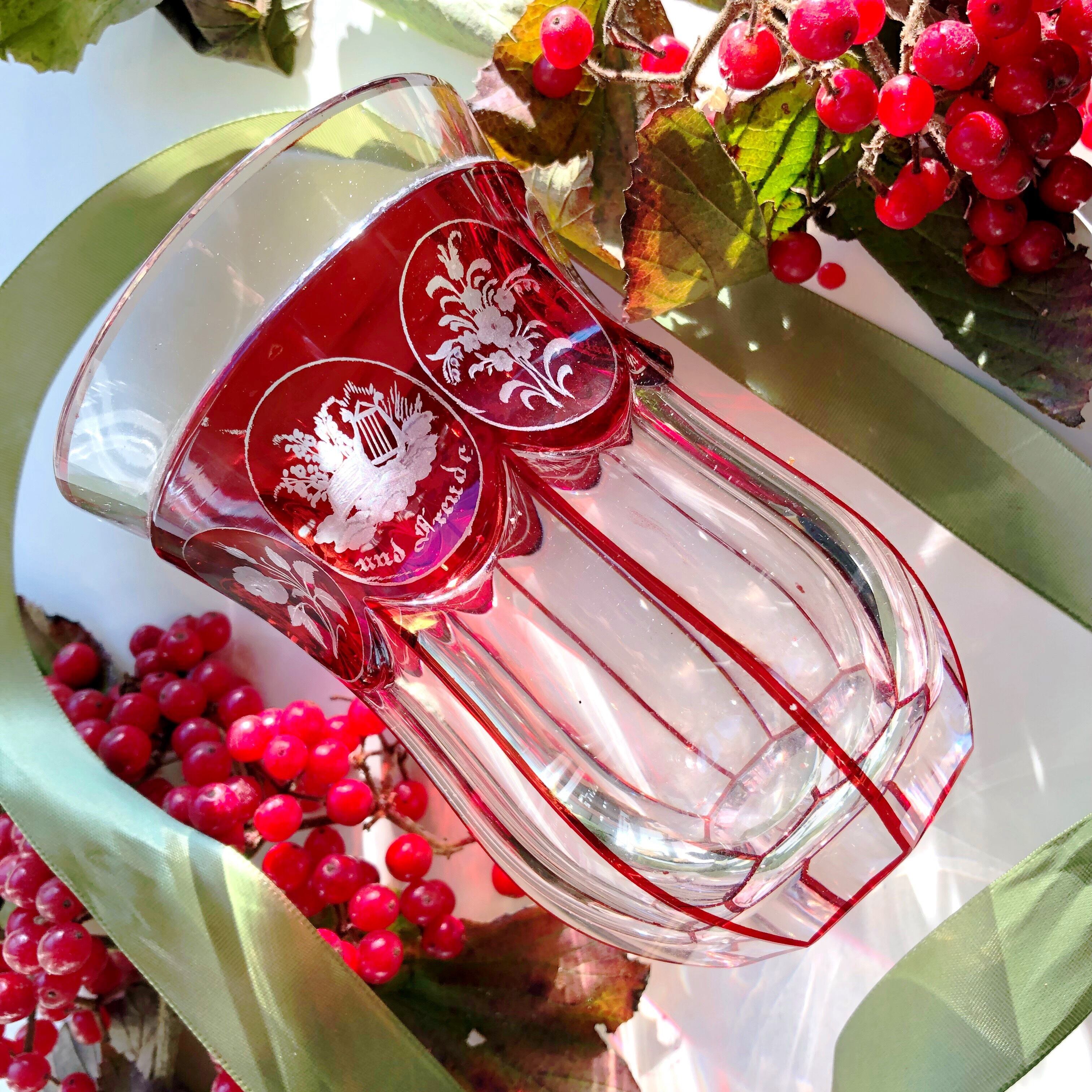 こちらはアンティークのボヘミアンガラスのグラスです。飲み口の直径約8センチ、高さ約11センチで、美しいルビーレッドの円の中に植物や縁起の良い図案が描かれていますが、ひとつの円の中だけ、何も描かれていないのです。