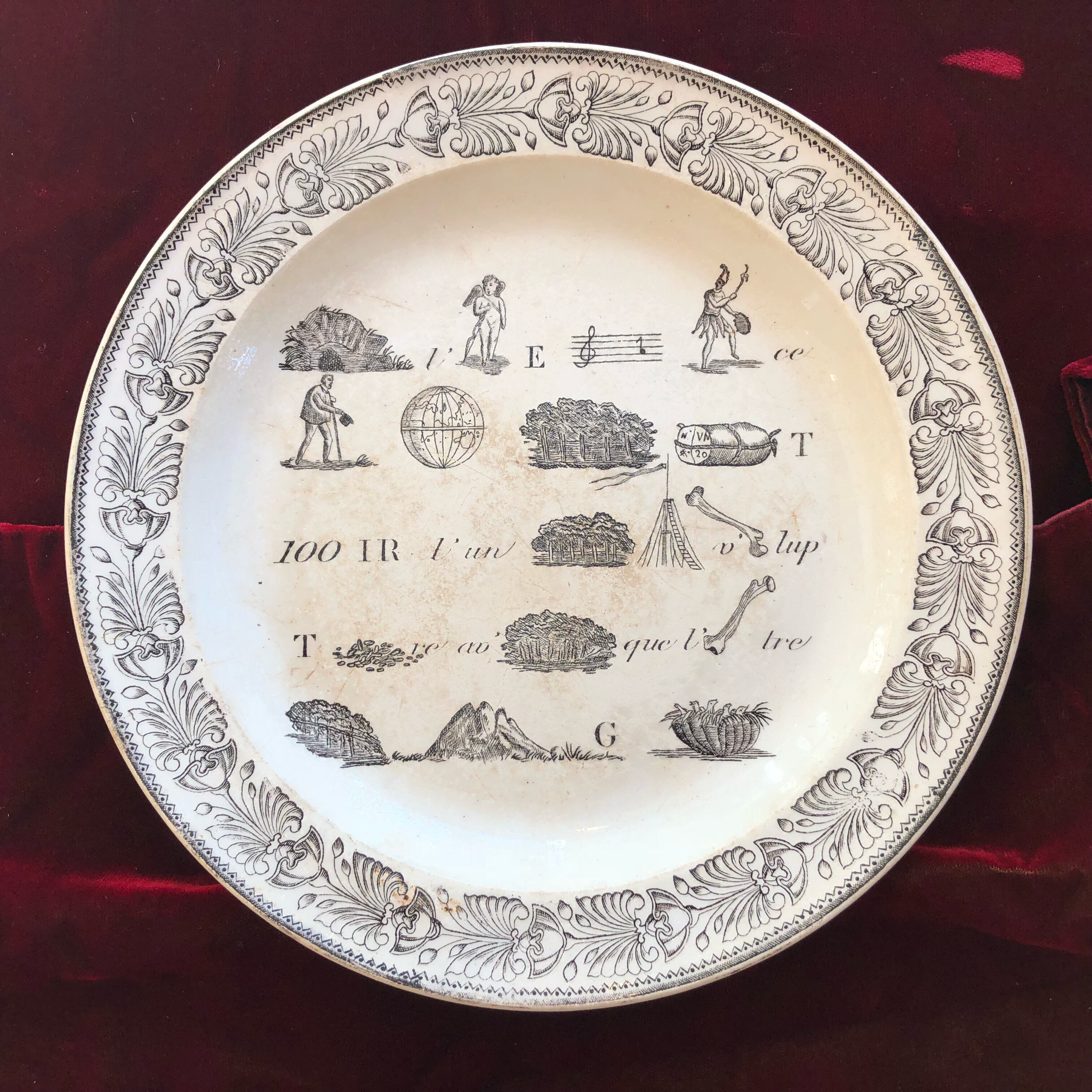 19世紀フランスのなぞなぞ絵皿です。フランス語の諺の判じ絵になっているようですが、現代のフランスの方に聞いても分からないものもあり、なかなか難易度は高いようです。謎めいた絵面もいいですよね。