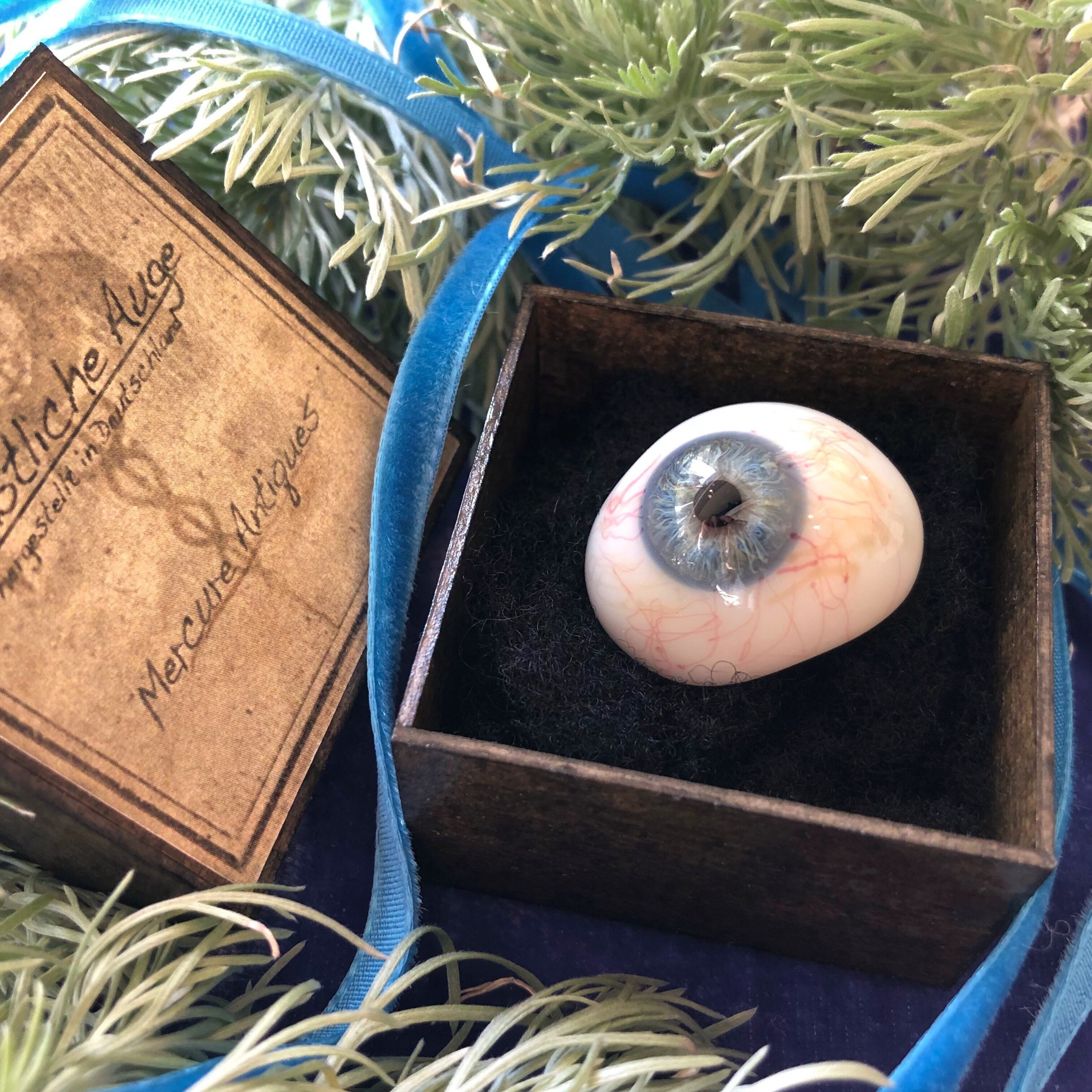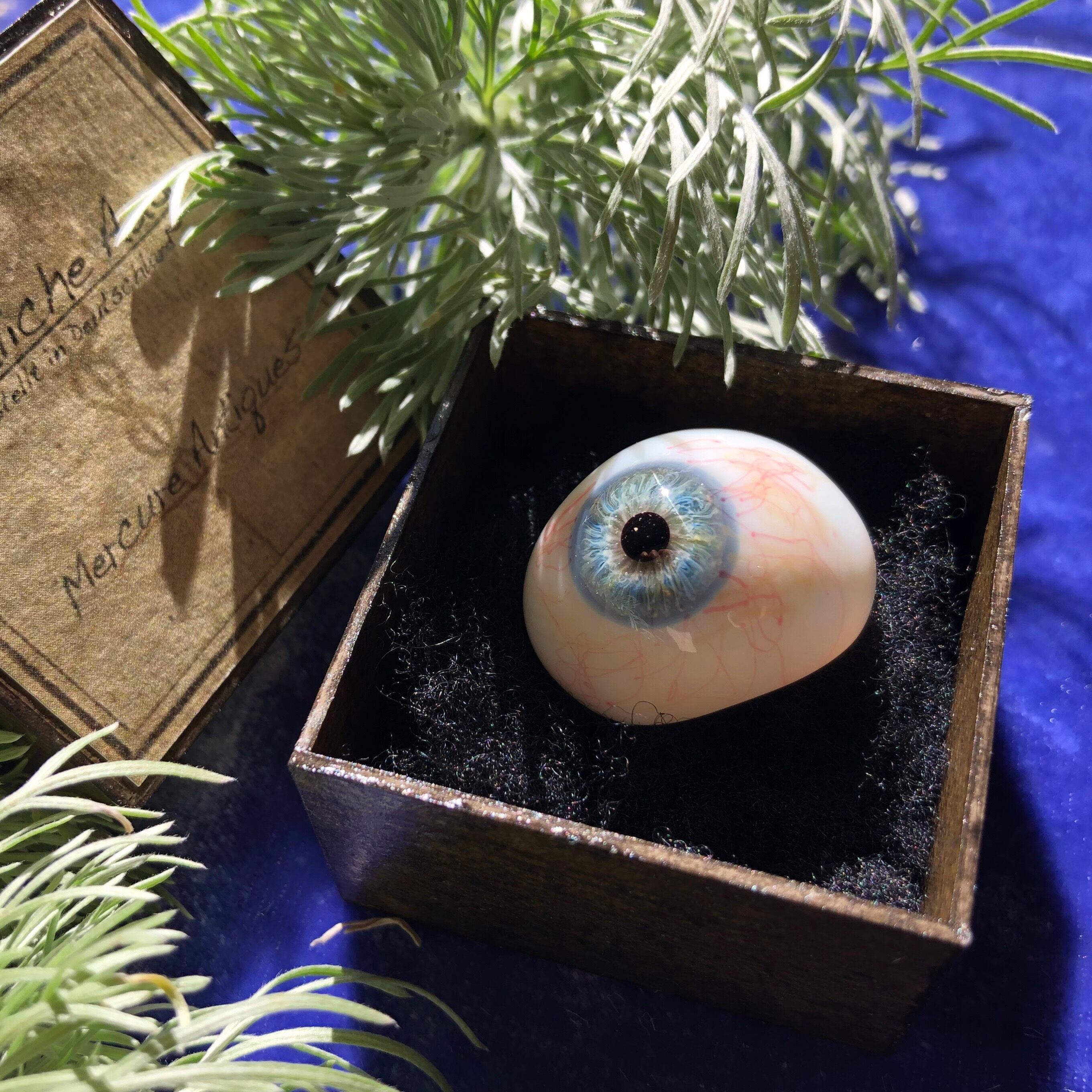 日が昇る前、星は消え去り空が青みを増してきます。その一瞬を捉えたような美しい青の義眼です。その美しさは、虹彩の中で濃い青を背景に、薄い青、黄がかった白が花びらのように舞い、黒目の周りに薄っすら滲む葡萄酒色と実に複雑なコラボレーションによっています。単純な青では出せない、清々しい青をお楽しみください。