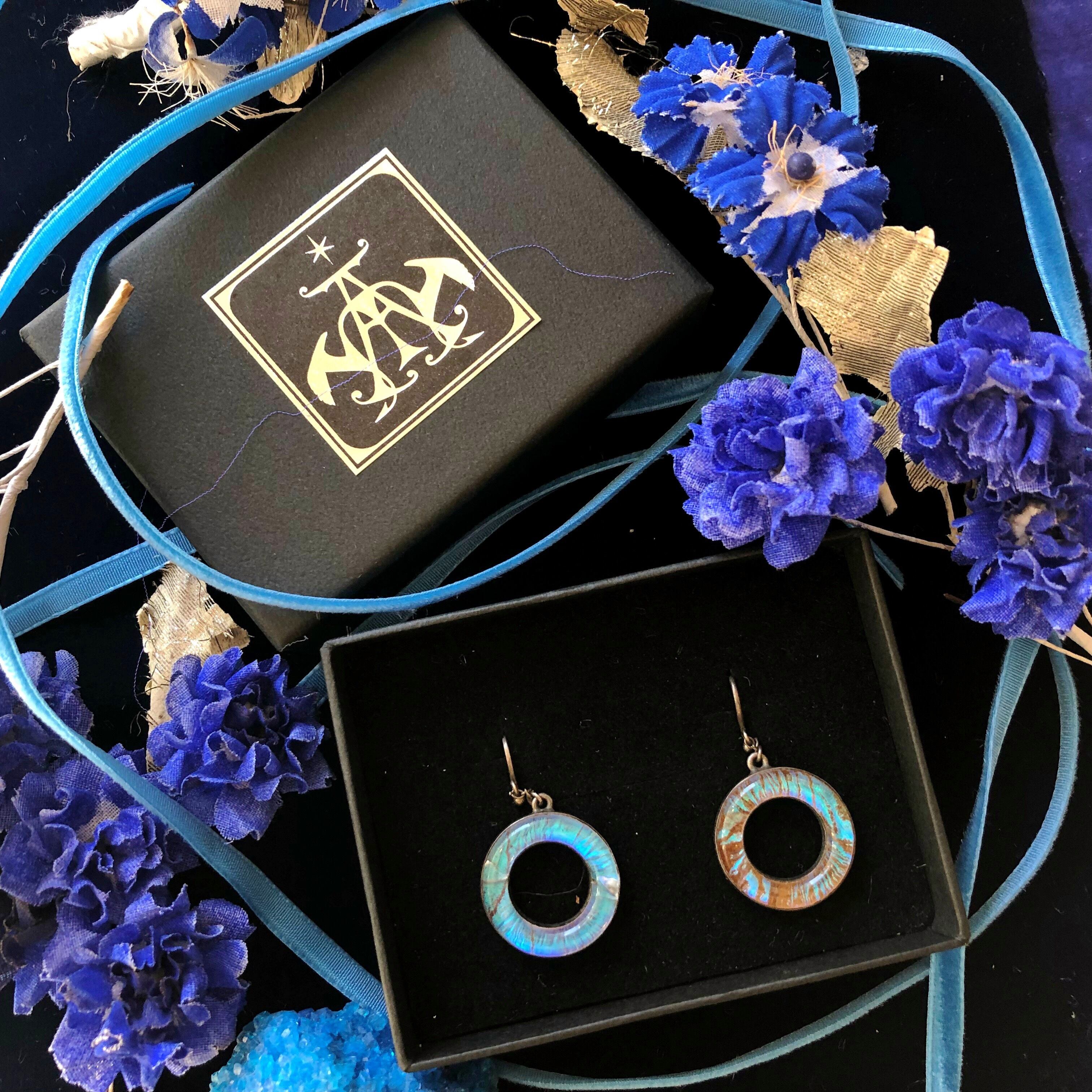 本物のモルフォ蝶の羽根を使ったイアリングです。イギリスでアールデコ時代に流行しました。台はスターリングシルバー製。光を受けてキラキラ光る蝶の羽根は、遠くから見てもとても目立ちます。モルフォ蝶の装飾品の中でもイアリングは大変珍しいものです。残念ながら、片方のイアリングのに2箇所、V字型のクラックが入っていますが、欠け落ちる状態ではないと思います。