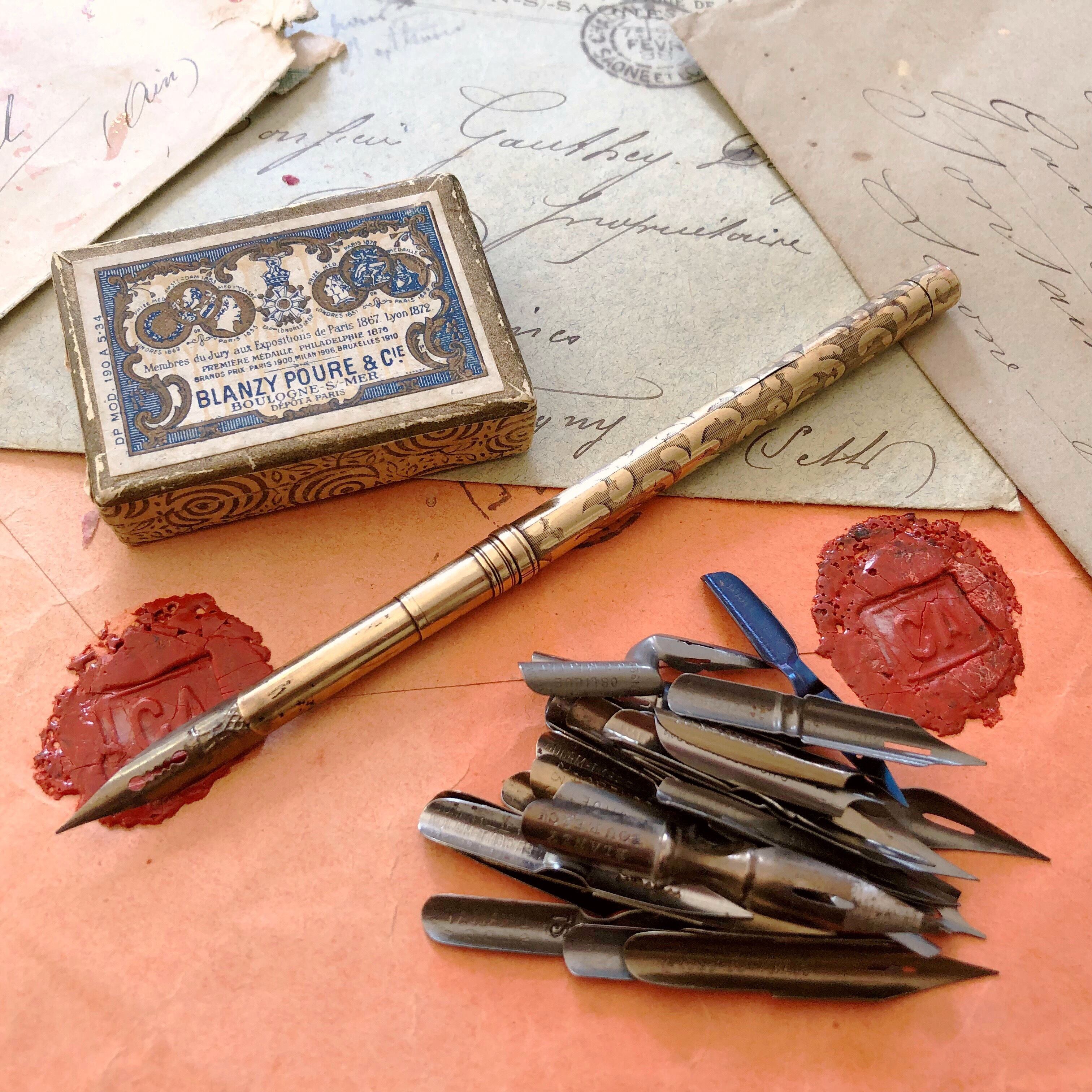 イギリス製のアンティークペンです。金色のボディは美しい唐草模様。ペン軸としてまだまだ実用して頂けます。今回はぴったりのアンティークのペン先、ペン先箱もセットにしての販売です。様々な描き味を試してみて下さい。物にもよりますが、現行品のペン先も入ると思います。