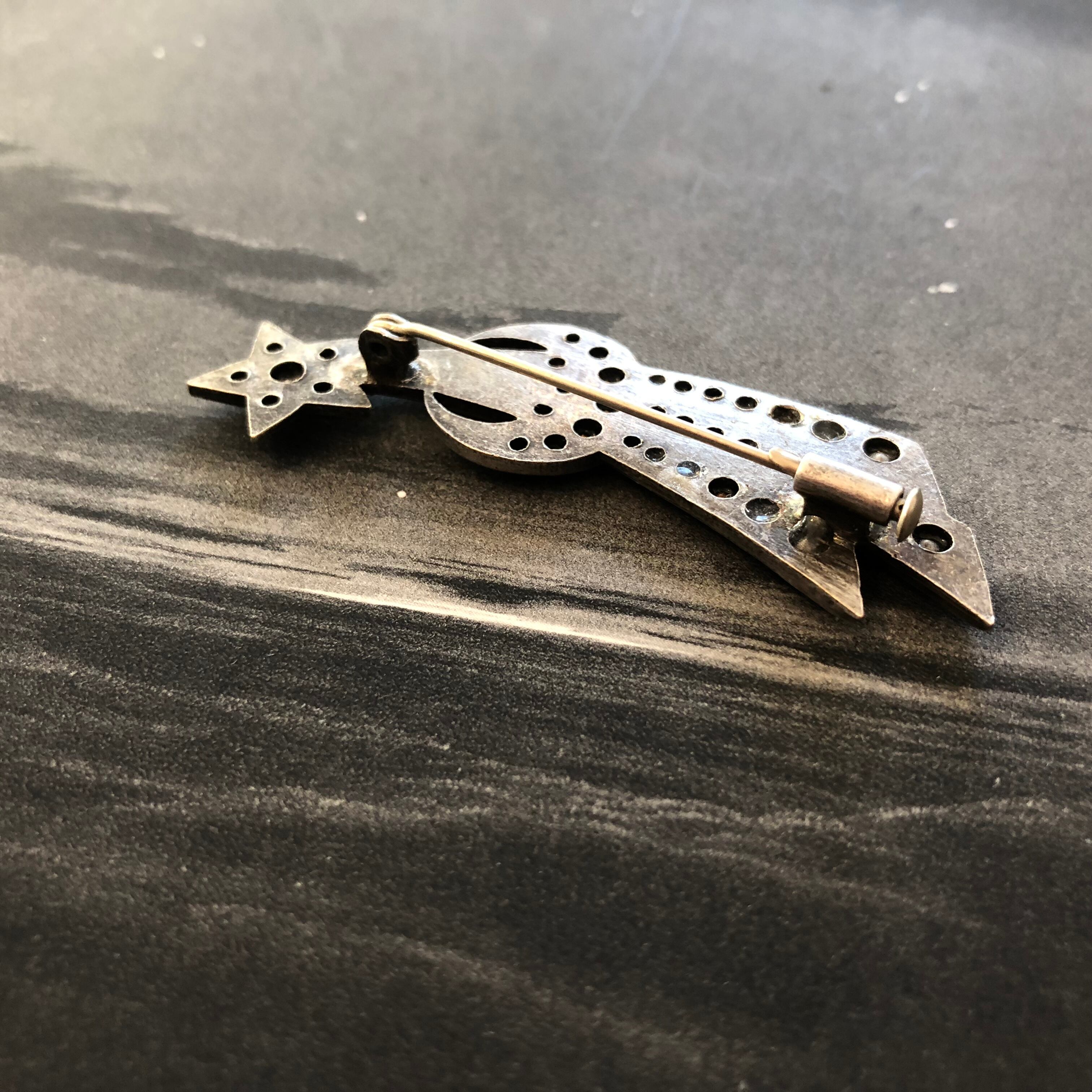月と流星のブローチです。こちらは20世紀初頭に流行したスタイル。この頃は1910年のハレー彗星の影響もあって、星をモチーフにしたアクセサリーが流行しました。シュッと月を横切る流星はモダンで軽やか。オリジナルの紙箱に入れてお届けします。