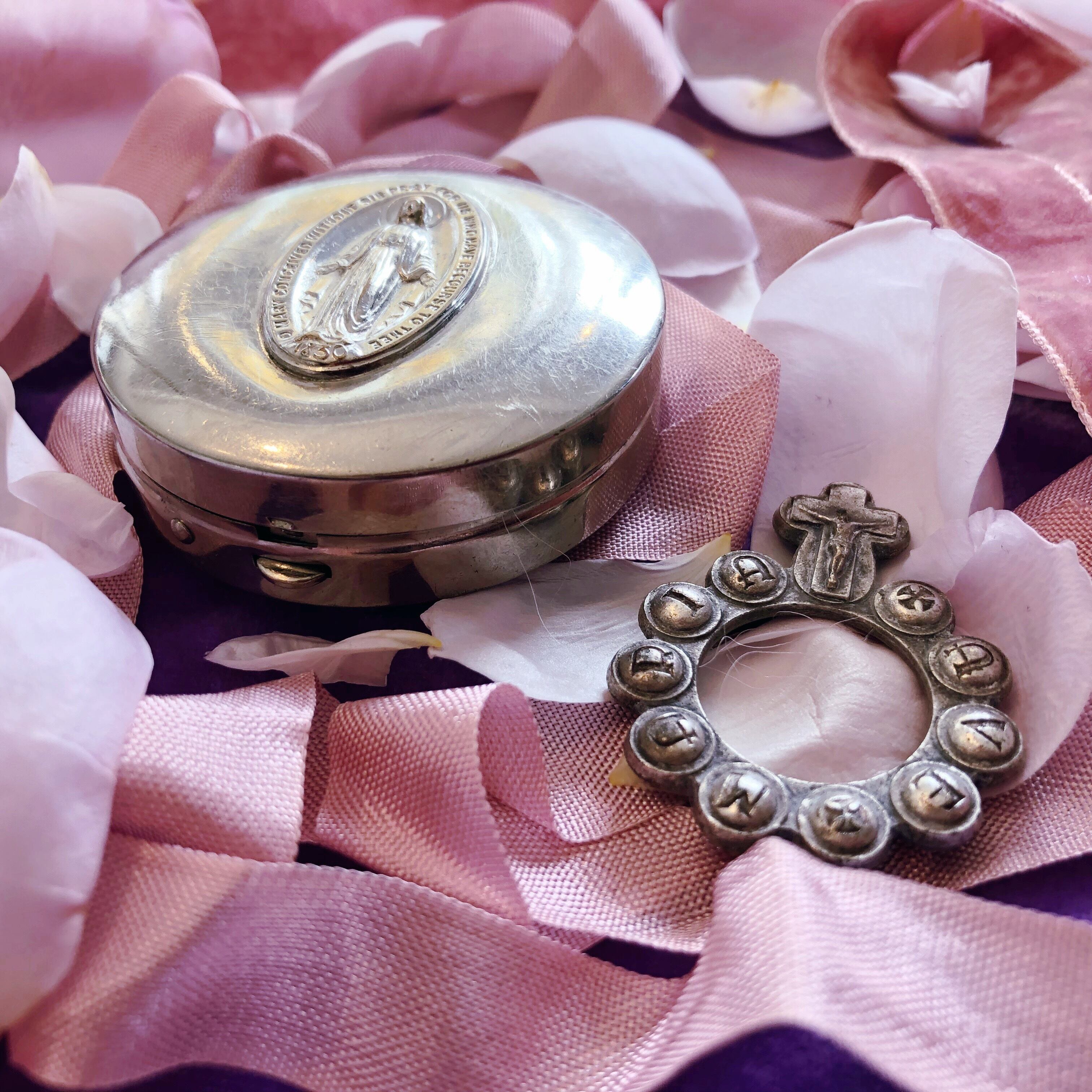古いフランスの指ロザリオです。ロザリオはラテン語の「ロザリウム(薔薇の冠)」が語源とされていて、祈りながら数珠を繰る様子が薔薇の冠を編むようだからだと言われています。指ロザリオはロザリオが使えない場面などで祈りを捧げる為のもので、指に嵌めてくるくる回して使います。