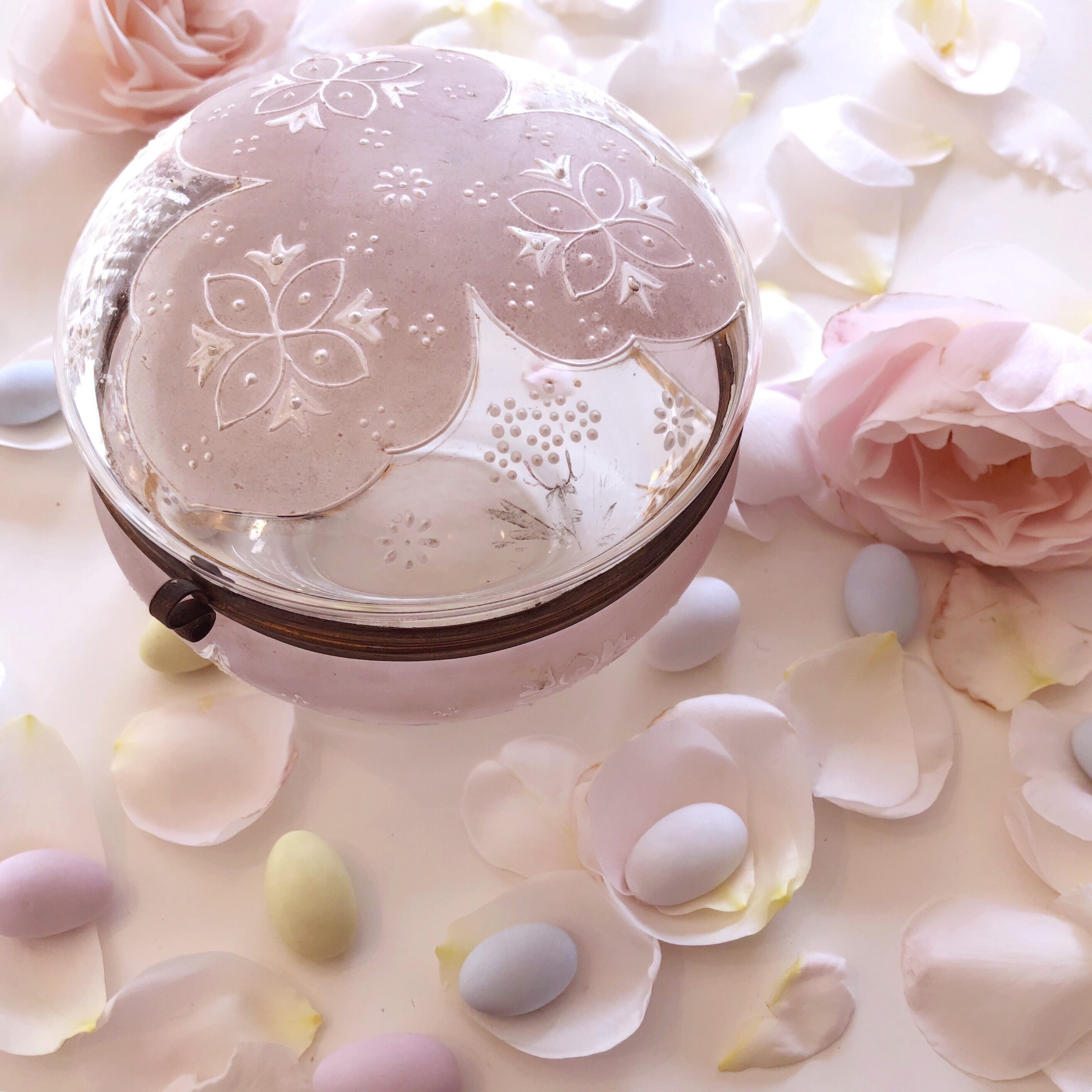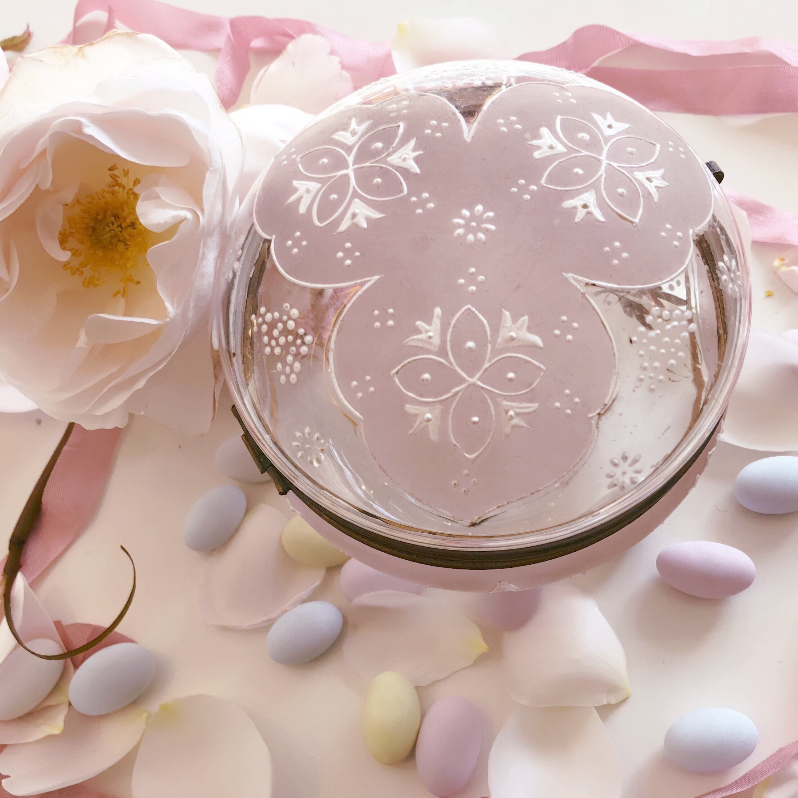 ペールピンクのボンボ二エールです。クリアなガラスにうっすら桜色のすりガラスが乗り、その上に白のエナメルで模様が手描きされています。優しく光を通し、とっても可憐で清らかな印象、ドラジェのパステルカラーにぴったりです。