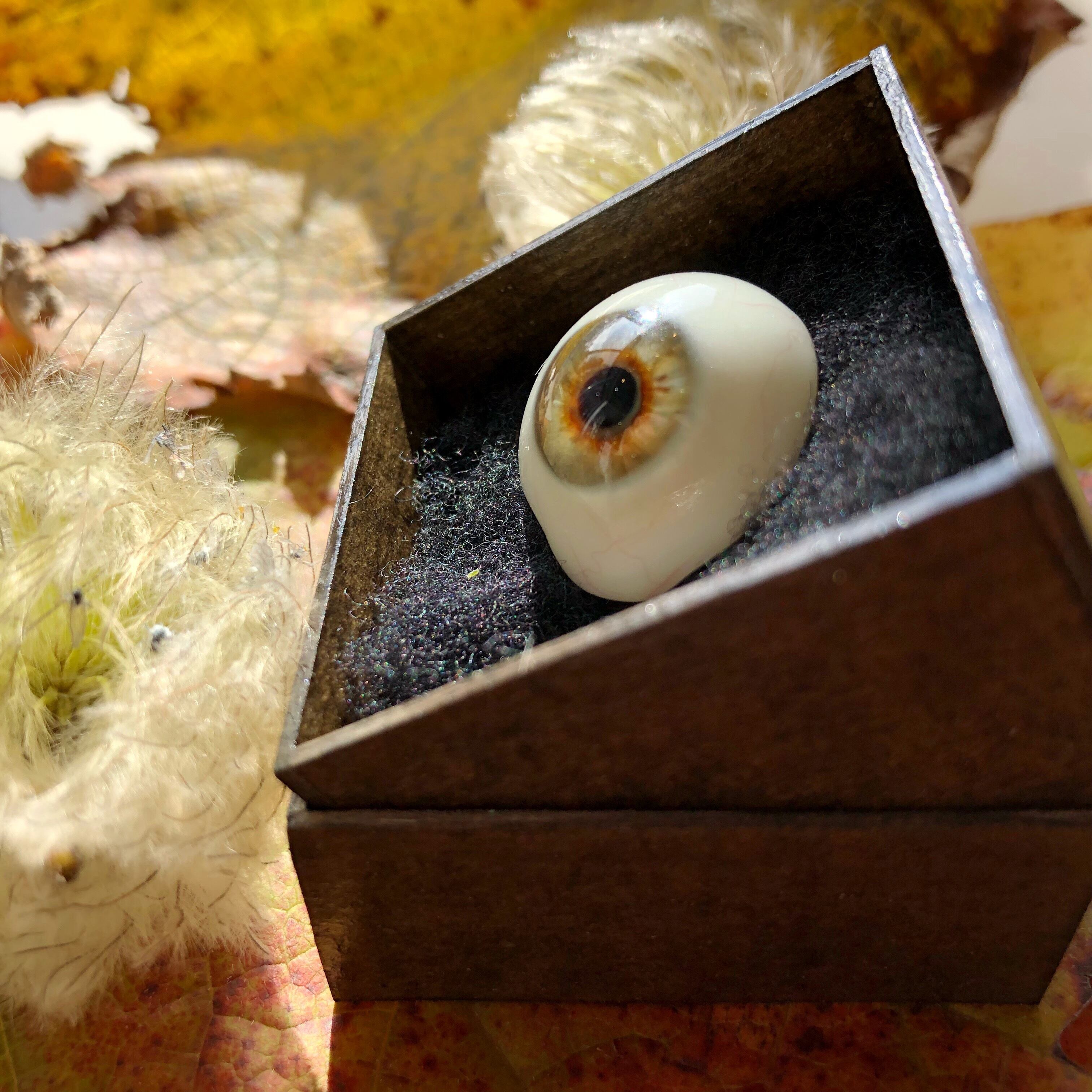 虹彩外縁からまるで巨峰の実の断面のような本当に瑞々しい義眼です。黒目の周りが赤みがかった茶色で、厚みのある氷晶ガラスの透明感も素晴らしい。そしてこちらは裏面のガラスのないシングル義眼ですので、裏からの光を通します。そうして光にかざすと、風が冷たくなった中でわずかな温もりを感じる秋の日差しです。シングル義眼ならではの、豊かな光の表現をお楽しみいただけます。