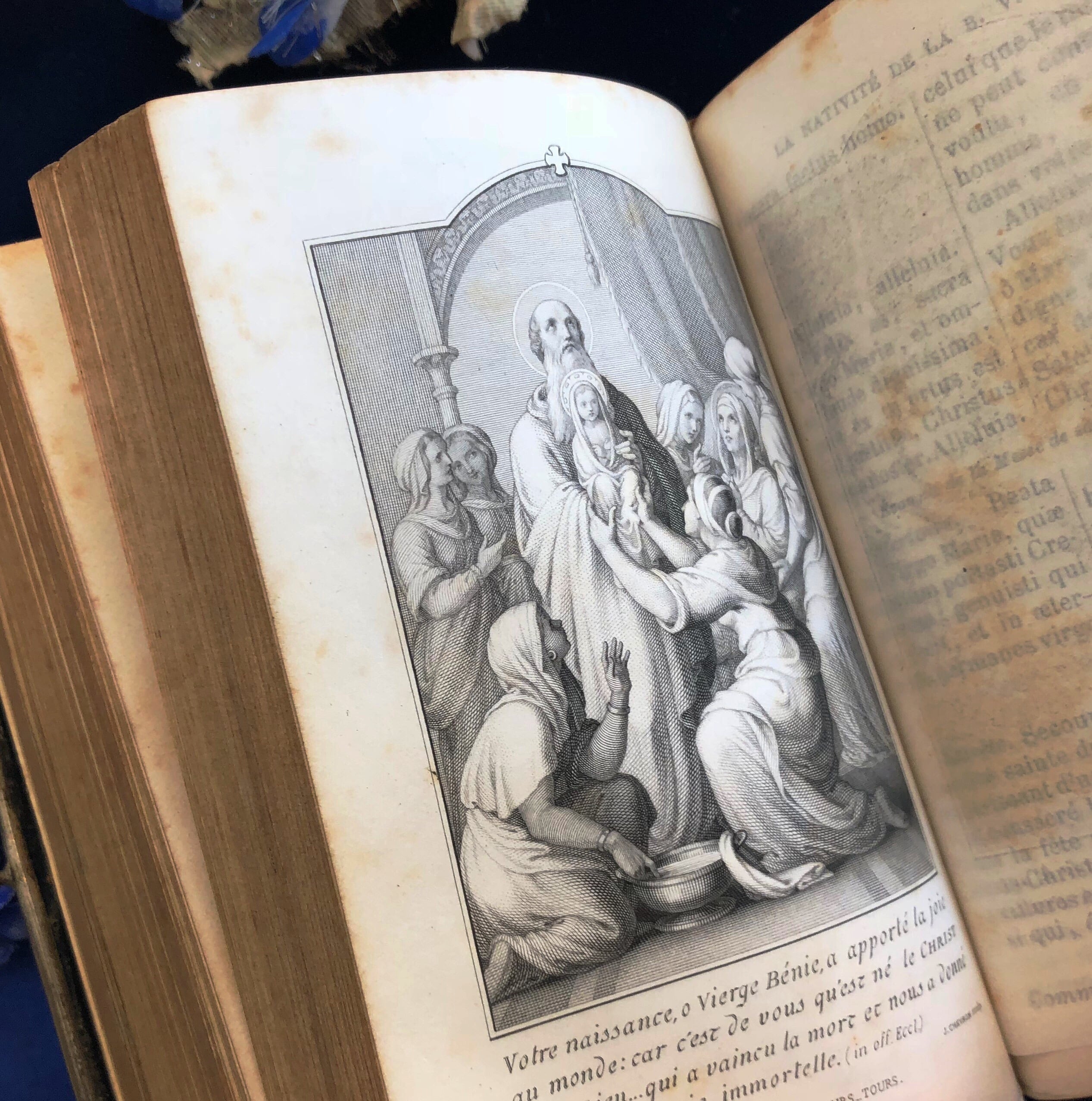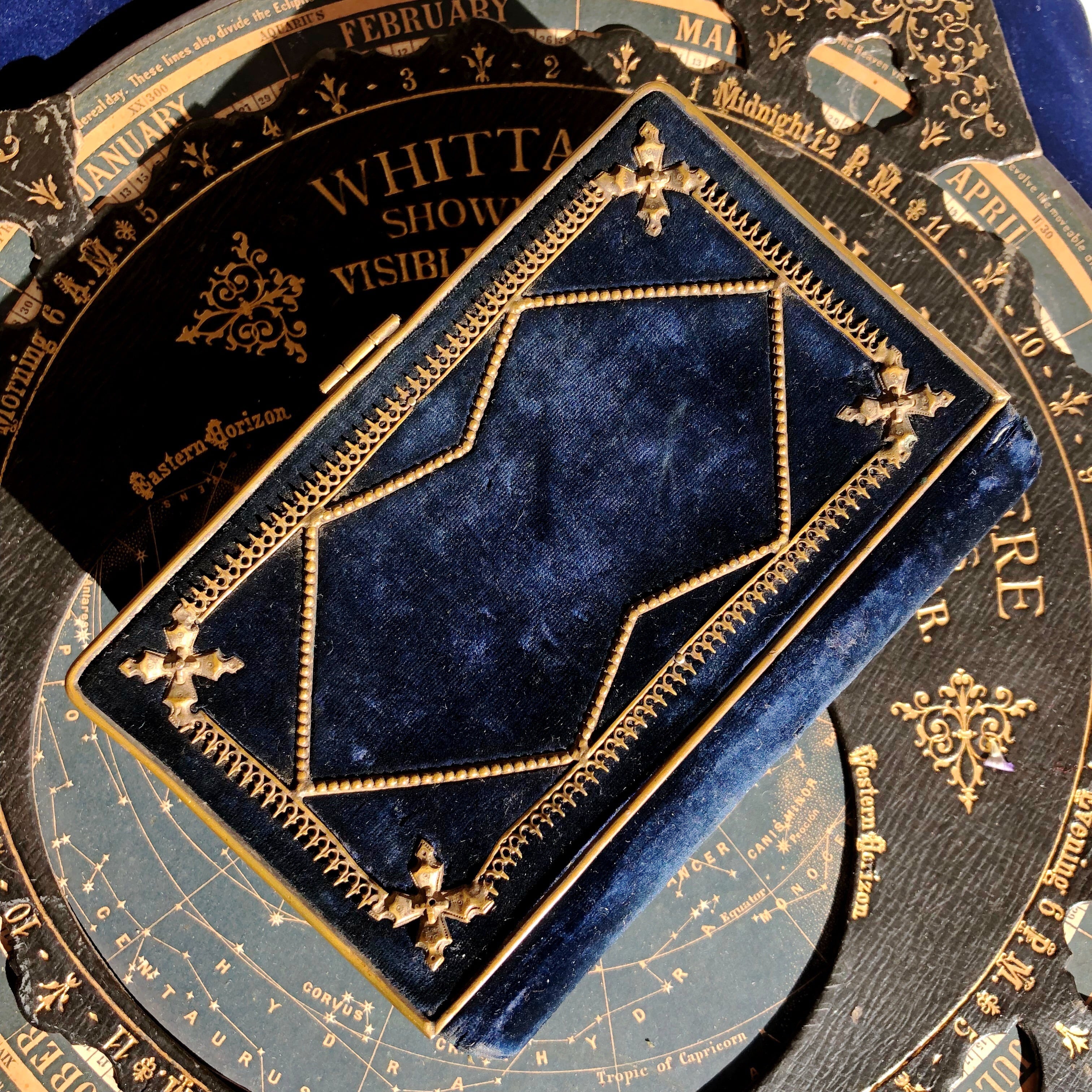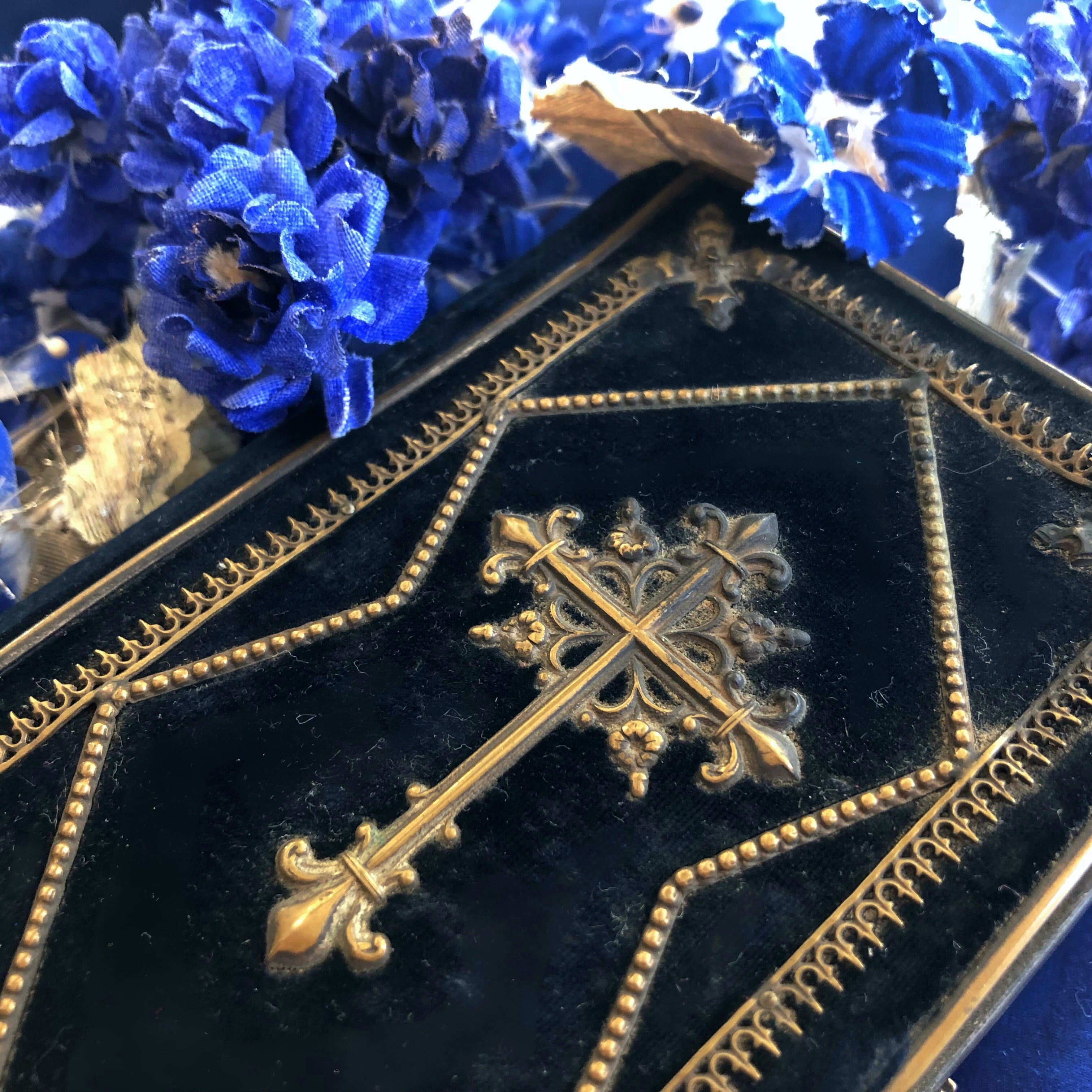 まるで夜空のような深い深い群青色の祈祷書です。肌理の細かいベルベットは暗い場所で見ると漆黒ですが、光に当てると深い青と分かります。留め金は荊冠と十字架、小口は金色で豪華な作りで、238、239ページに1878と書き込みのあるビオラの押し花が挟み込まれています。