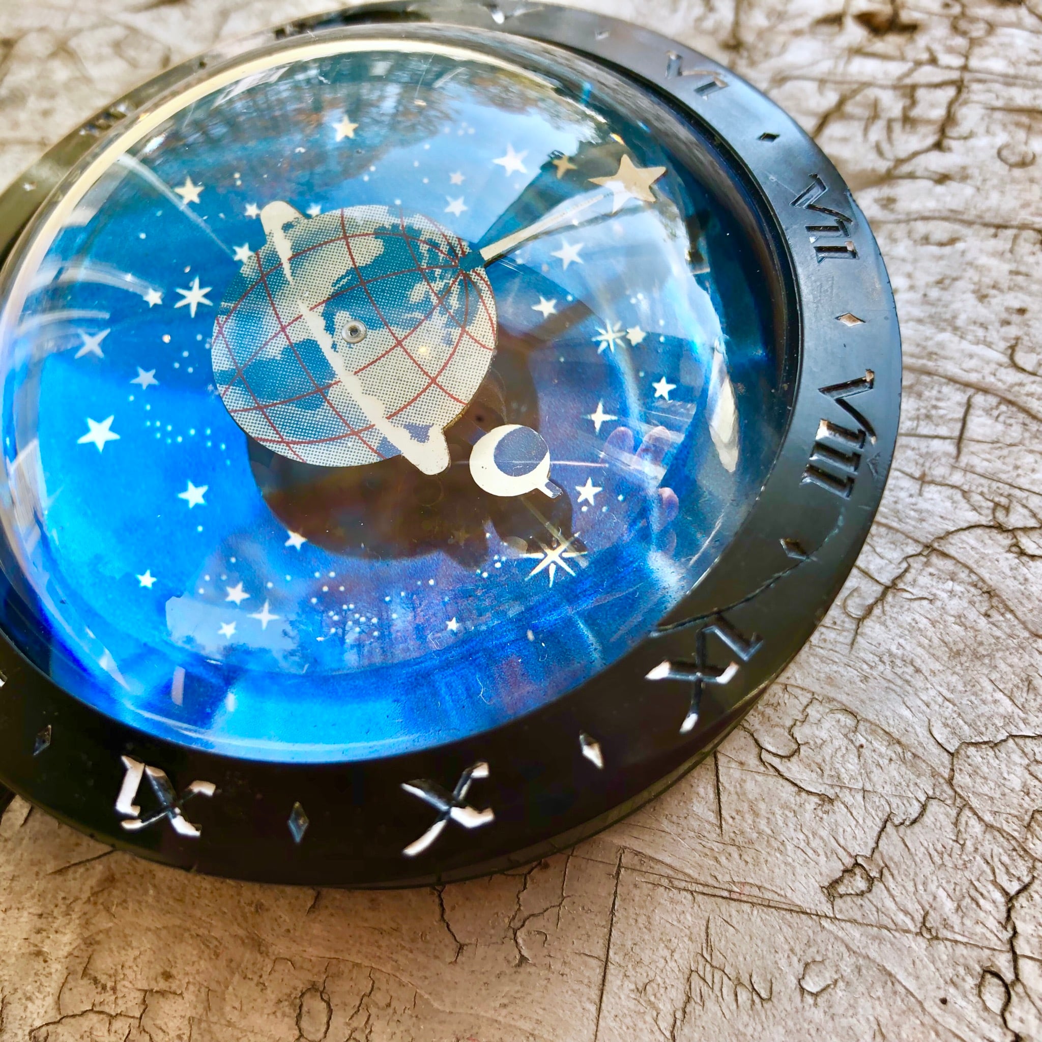 20世紀初頭アメリカ製の宇宙時計です。地球の周りを月と星の針が巡る未来派的なデザイン! 当時の宇宙に対する憧れが結晶したような時計です。