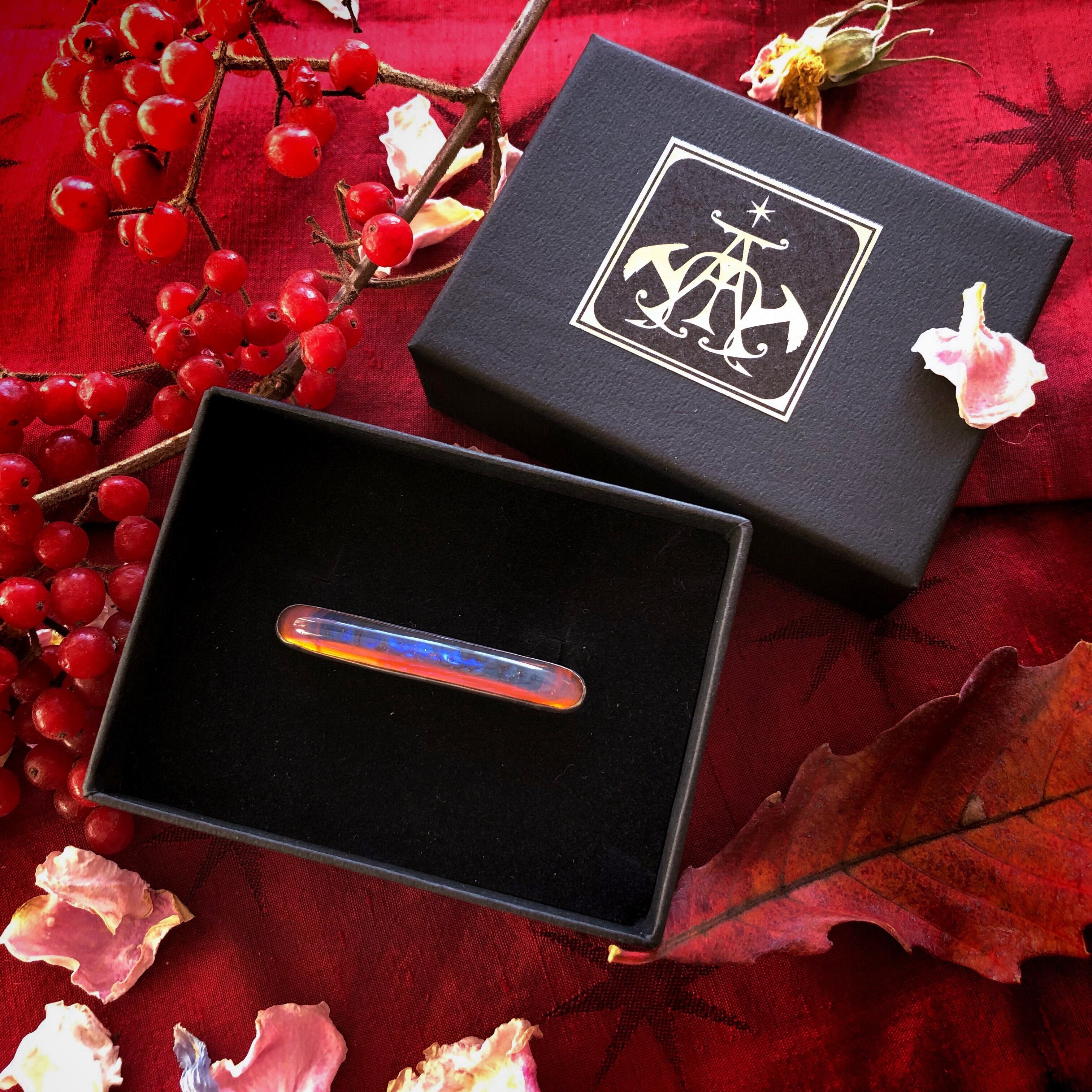 ドラゴンブレスのブローチはです。ドラゴンブレスは20世紀初頭に流行したアートガラスで、夕陽のような赤~琥珀色のガラスの中に神秘的な青いシラーが浮かびます。光の加減によってそれが揺らめき、とても綺麗です。熱いような冷たいような輝きは、まさしく龍の息を思わせます。
