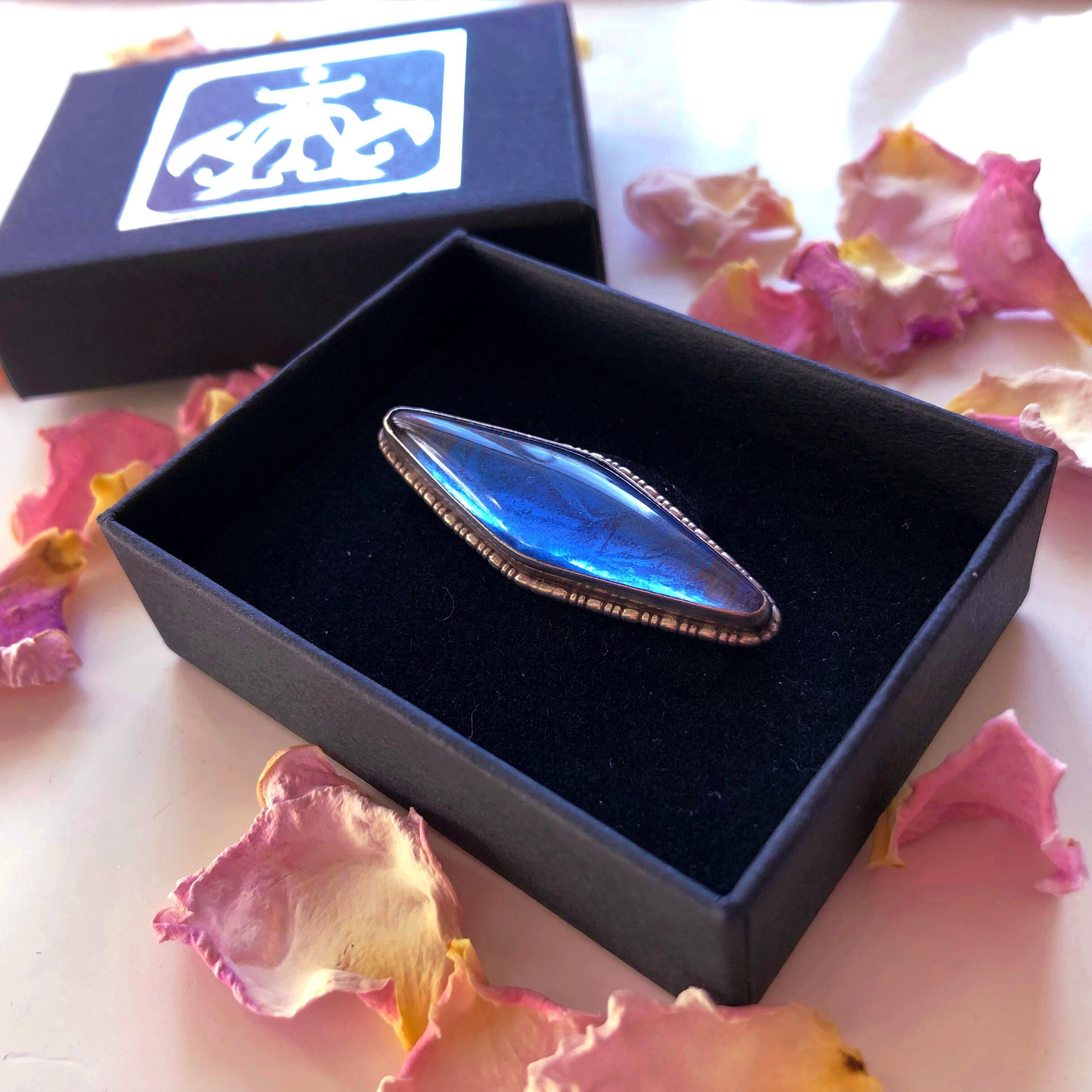ダイヤ型のモルフォ蝶のブローチです。アールデコ時代にイギリスで流行したもので、本物のモルフォ蝶の羽が使われています。この輝く青は色素ではなく構造色で、CDが虹色に輝くのと同じ原理です。そのため、角度や光線の加減で色味が変化しますが、こちらのお品は、黒々とした藍色から美しい青まで、もちろん蝶の羽にあるすじ状の模様も現れます。