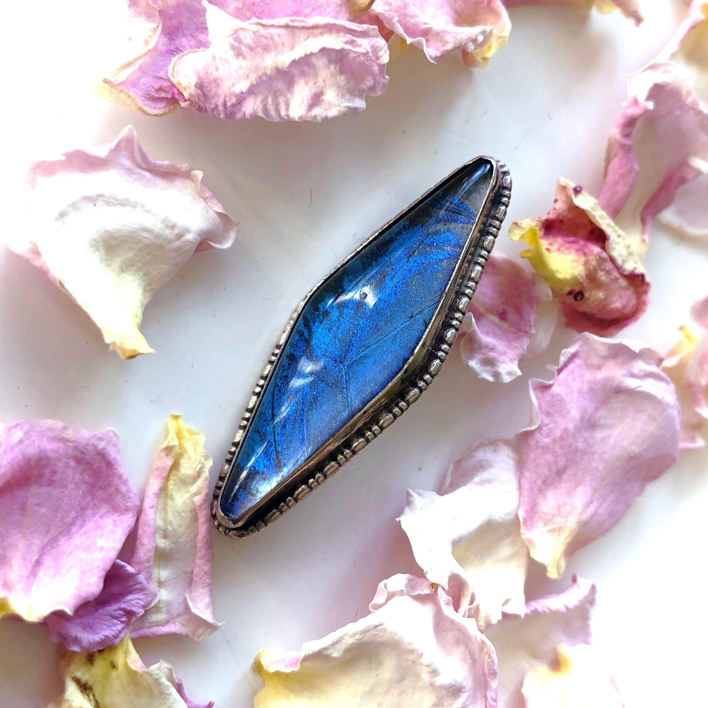 意外と偽物も多く、モルフォ蝶の羽を使わず普通の蝶の羽の上に青い色ガラスを被せたものや、古く見せかけた現行品もあるので注意が必要なのですが、こちらは本物です。ピンの位置からして横長で使うものだと思いますが、ダイヤ形を生かして縦に付けても素敵ですね。天然の神秘をどうぞお手元に。