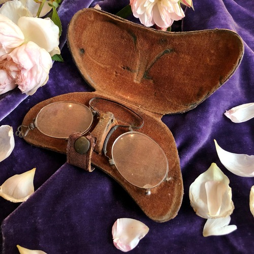古い鼻眼鏡はいかがでしょう。革製のオリジナルのケース入りで、華奢なフレームに薄いレンズがはまっています。レンズには若干度が入っているようですが、さほど強くはなく、薄いおうレンズのようです。あまり実用的ではありませんが、良い雰囲気。金具にチェーンを通してアクセサリーとして使っても素敵ですね。