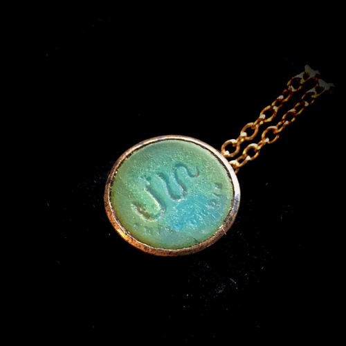 小指の先ほどの小さなフォブに青緑の綺麗な石が嵌った印章です。とても小さく、また使い込まれているので判然としませんが、よく見ると蛇の紋様と「Live or Die(生か死か)」の文字が見えます。蛇は医療のシンボルですから、医療関係者……医者か薬剤師のものかもしれませんね。