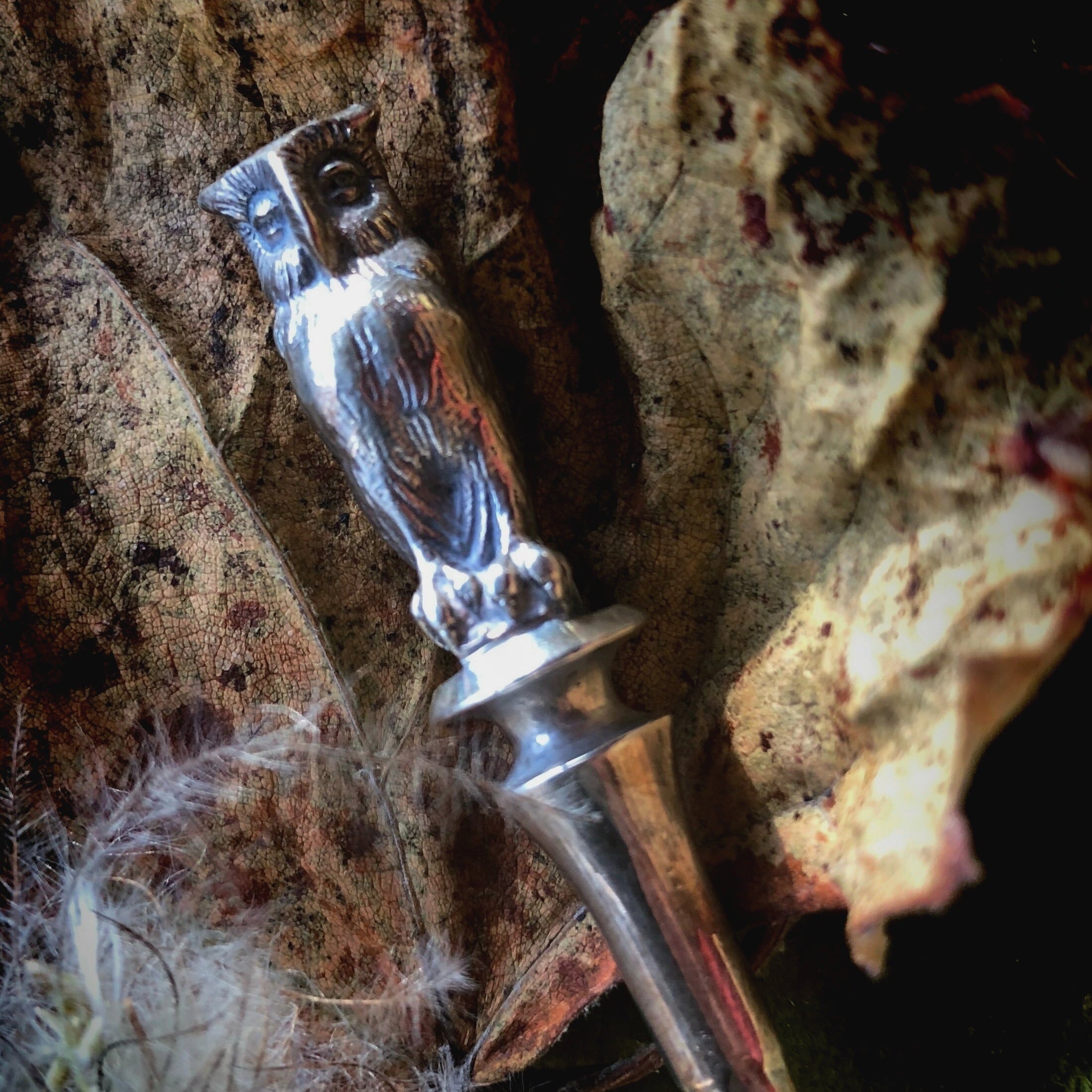 銀のフクロウの印章はいかがでしょう。すらりと長く自立します。スターリングシルバー製でホールマークも有ります。フクロウの細工は小さくともとても精巧。複雑なエンブレムは複数のアルファベットが絡まり、とても凝っているのですが、どんなイニシャルなのか判然としません。