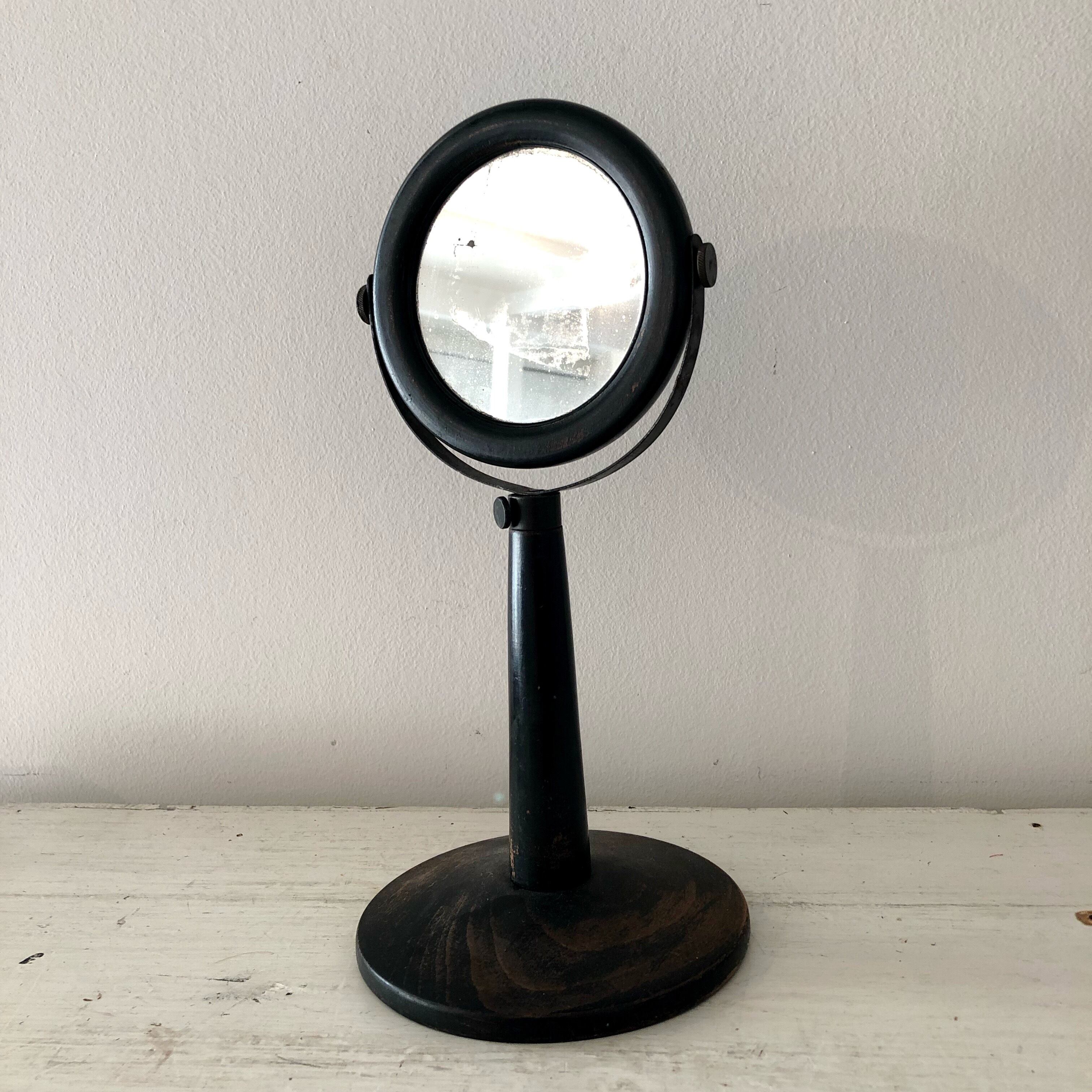 ハンガリー製の卓上ミラーはいかがでしょう。しっかりした木製で黒く塗装されていますが、塗装が薄くなって木目が見えてる部分もあります。無骨でストイック。インダストリアルなお部屋に似合いそうです。首が傾くので案外使いやすくて実用的です。