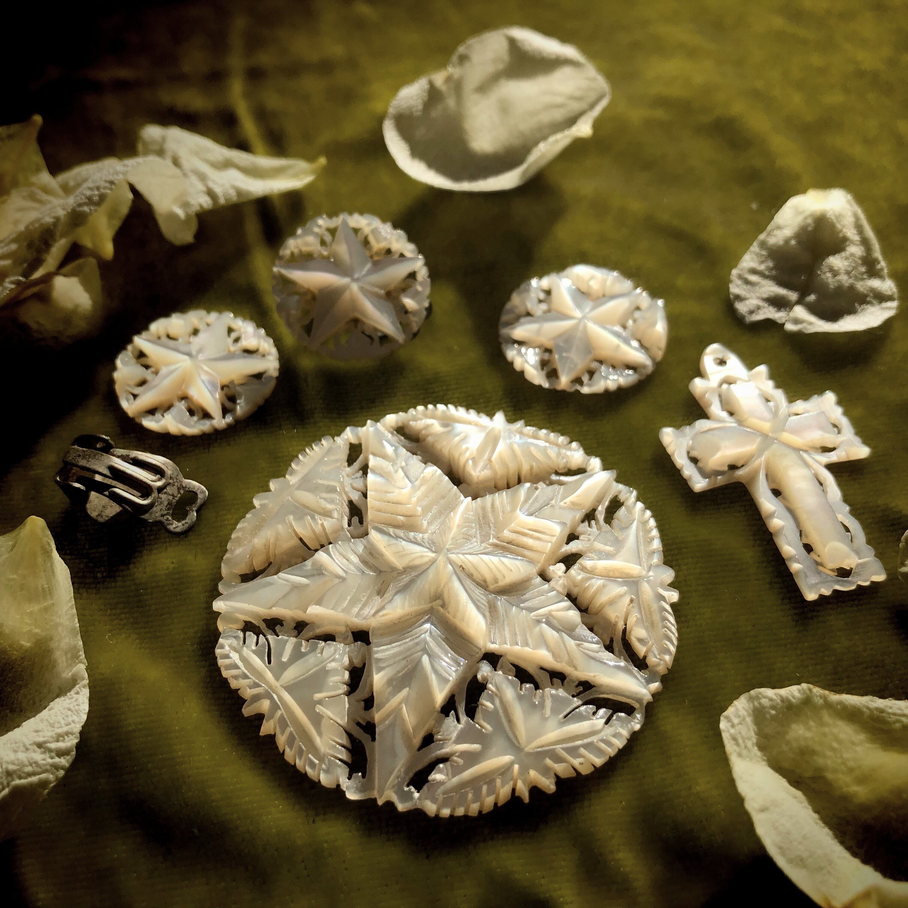 人気のベツレヘムの星ですが、買い付けた段階で金具が取れたり紛失しているものが時々あります。今回はそれらを集めてパーツとしての販売です。ハンドメイド用にいかがでしょう。指輪やネクタイピンなど、ご自分のお好みのアクセサリーに出来ますし、現代の金具や接着剤を使った方が丈夫かと思います。