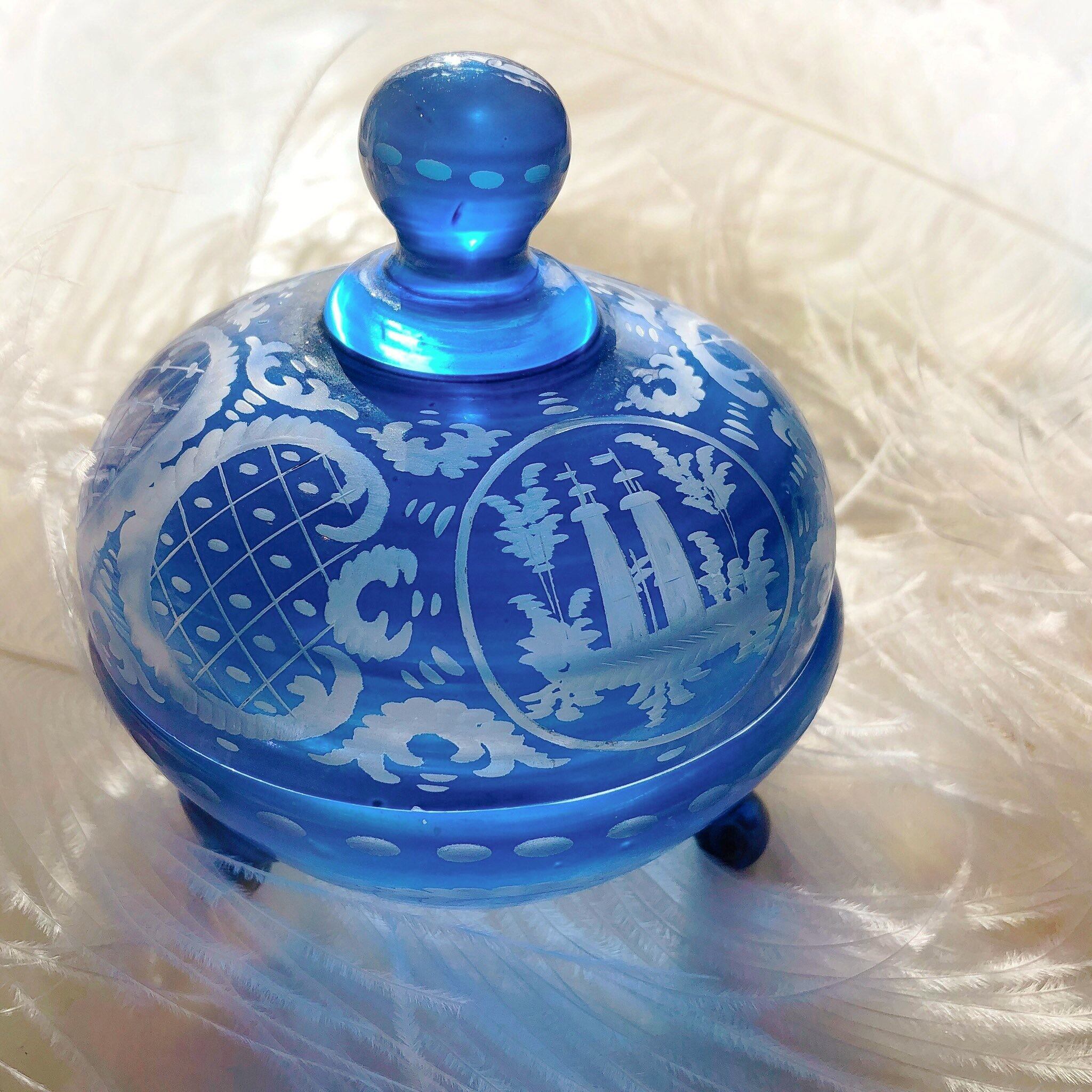 フラミンゴのボンボ二エールはいかがでしょう。コバルトブルーより明るいアズールブルーで、フラミンゴのような鳥とふたつの塔がインタリオで表現されています。鮮やかで明るく、見ているだけで気持ちが晴れ晴れするようなボンボ二エールです。蓋に持ち手がついているデザインも、ちょっと変わっていますね。