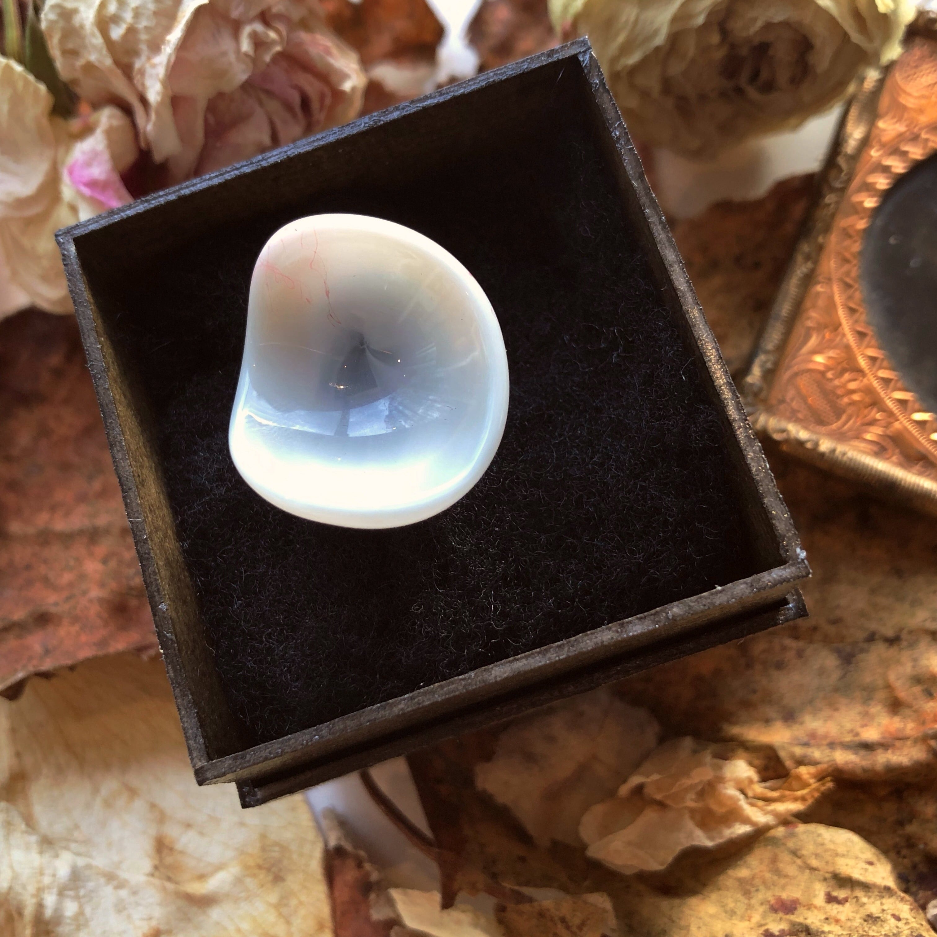 冬至の頃の太陽は、夏の力強さは影を潜め、弱く繊細な光を放っています。しかし、これを境に光が蘇る、復活の象徴でもあります。こちらの義眼は、黒みがかった青を背景に、これも黒みを帯びたオレンジが静かに燃えています。静謐の中、奥底に秘めた力強さを感じさせるお品です。