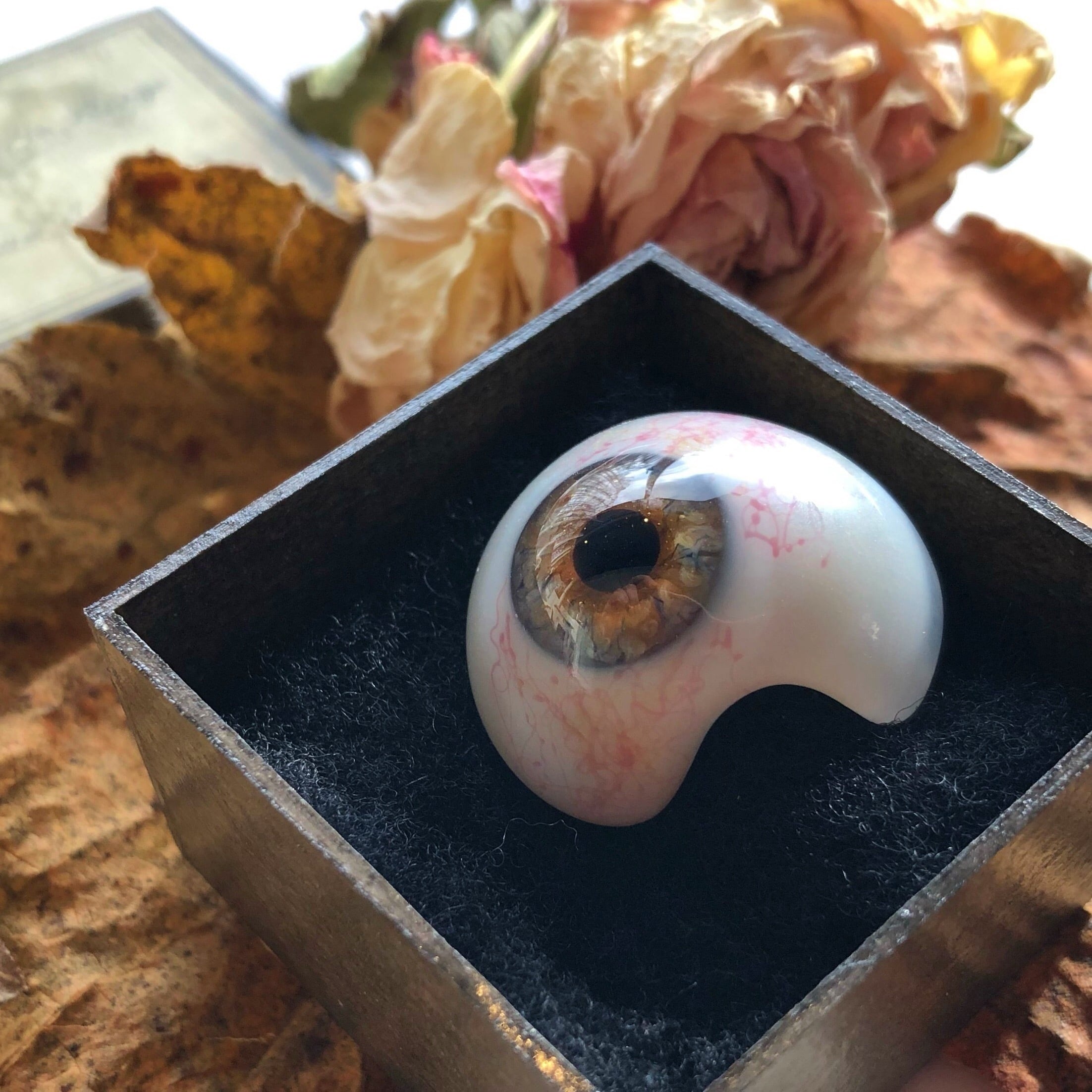 ドイツ製、製作は19世紀末から20世紀初頭です。100年ほど前に作られたドイツのガラス義眼は、透明感、虹彩の細工など、本当に素晴らしいものです。弊店のオリジナルデザイン、箱作家さんによる手作りの専用箱に入れてお届けします。箱の内寸は一辺約4センチですので、サイズの目安にしてください。