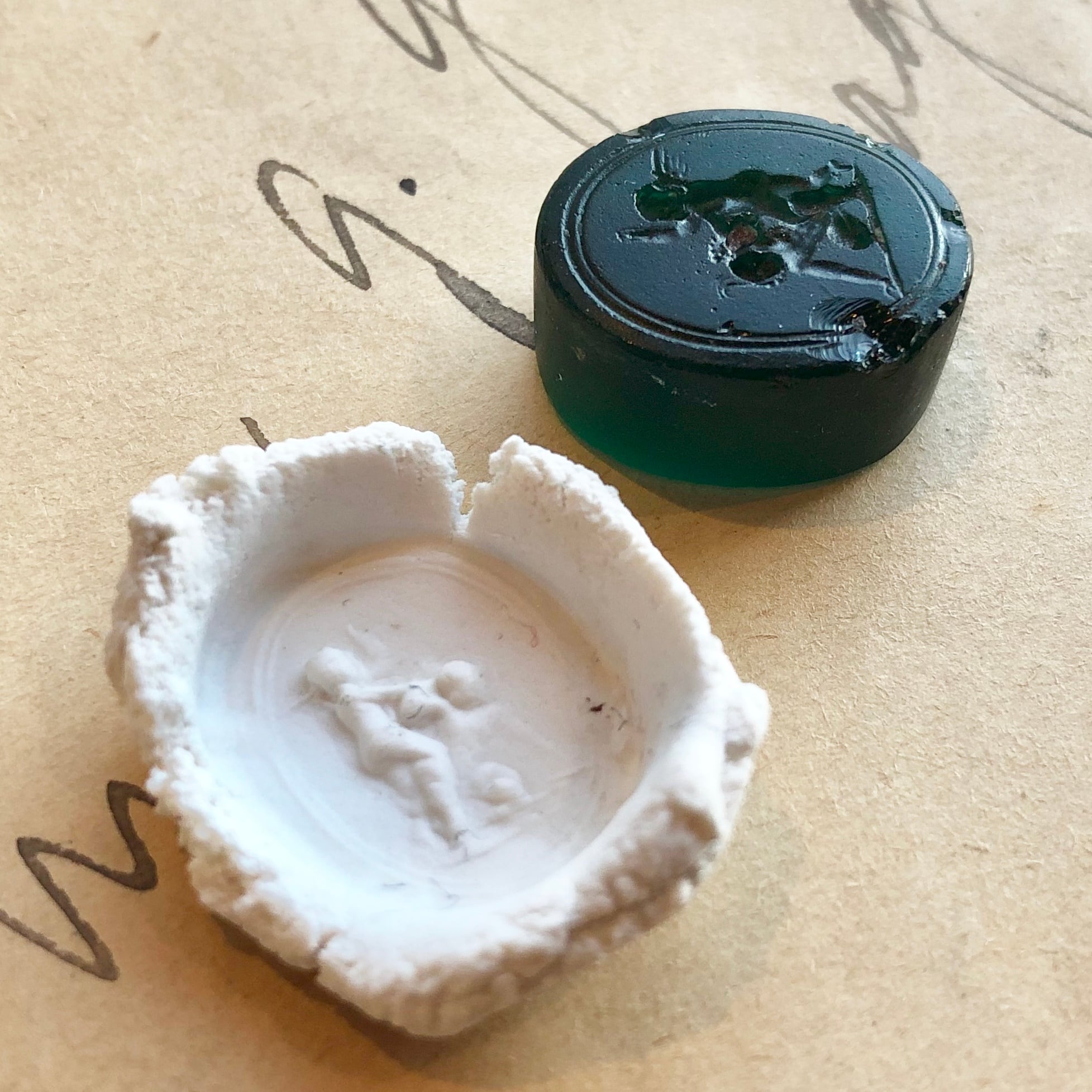天使の印章です。エメラルドグリーンのガラス製の小さな印章には、精巧なインタリオで天使が描かれています。イギリスで18~19世紀に実用されて来たものですが、このまま宝石として扱いたいような美しさ。光に翳すととても綺麗です。