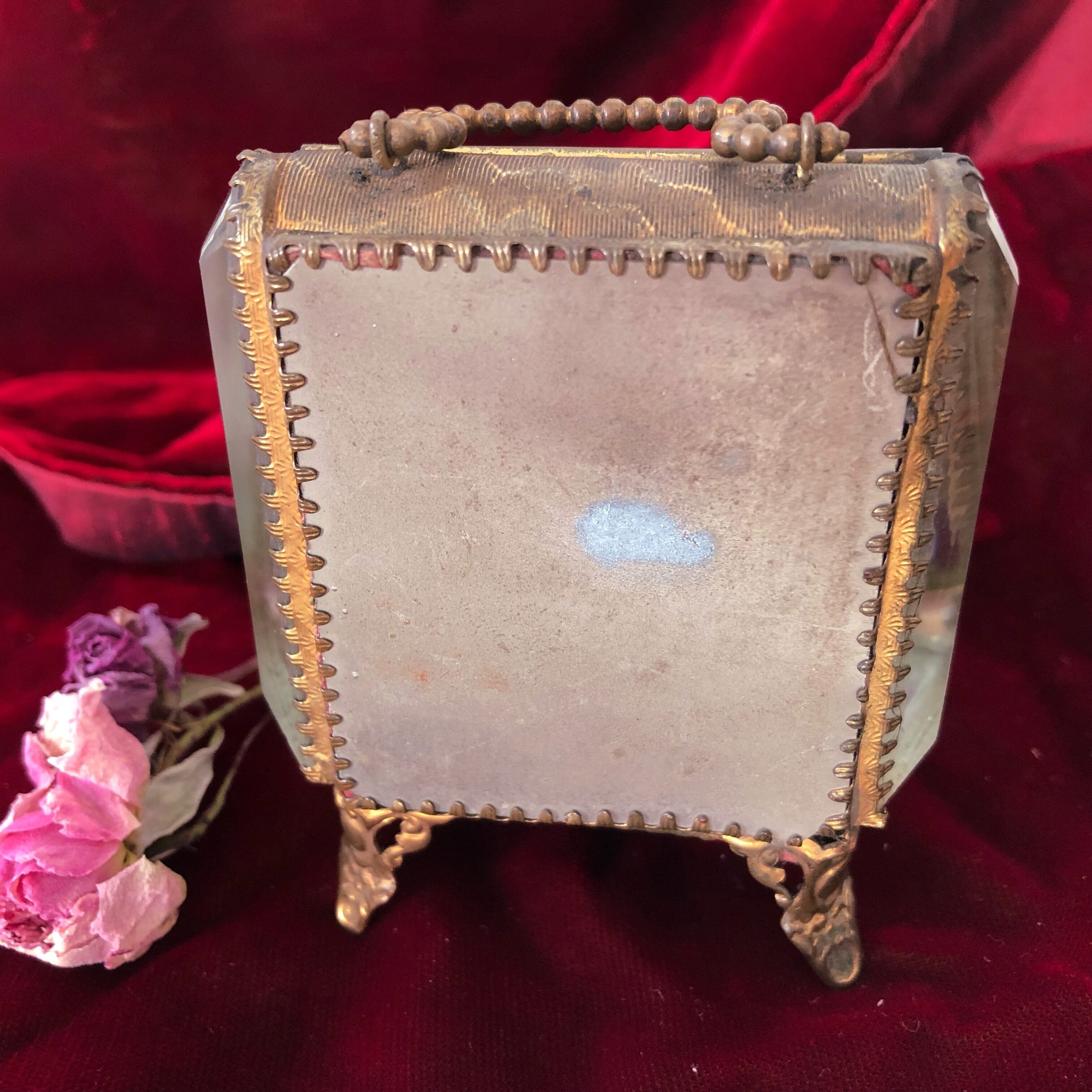 フランス製の時計ケースはいかがでしょう。重厚なベベルガラスと真鍮製で、クッションは薔薇色のシルクです。本来は懐中時計を収納する為のものですが、アクセサリーを飾っても素敵です。ガラスの透明度が高いので、鉱物の原石などのコレクションを入れてもよいですね。横から見るとこのような三角形になっていて、正面から見ると中身がよく見えます。薔薇色のシルクのクッションは擦り切れていますが、それもまた味わい深い雰囲気です。